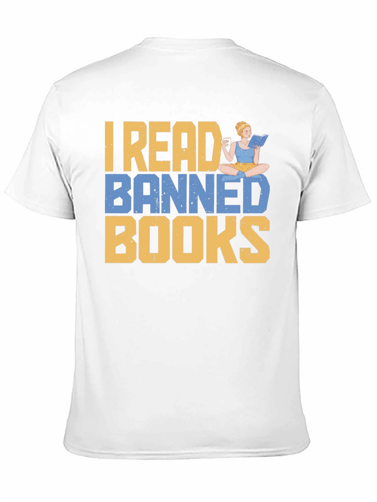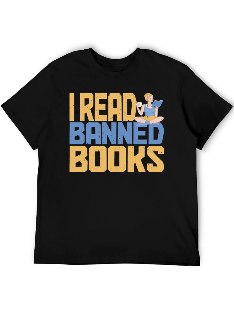 Express your love for literature with this eye-catching graphic tee! The bold design features the phrase "I READ BANNED BOOKS" in a striking, two-tone color scheme. A whimsical graphic of a reader adds a touch of fun. Made from comfortable, breathable fabric, this t-shirt is perfect for everyday wear. Show off your intellectual side and make a statement with this must-have addition to your wardrobe. Ideal for book lovers, students, and anyone who appreciates a good read. Get yours today and let the world know you support intellectual freedom!