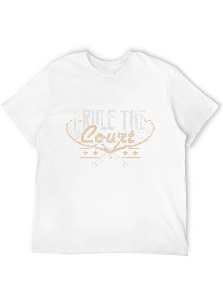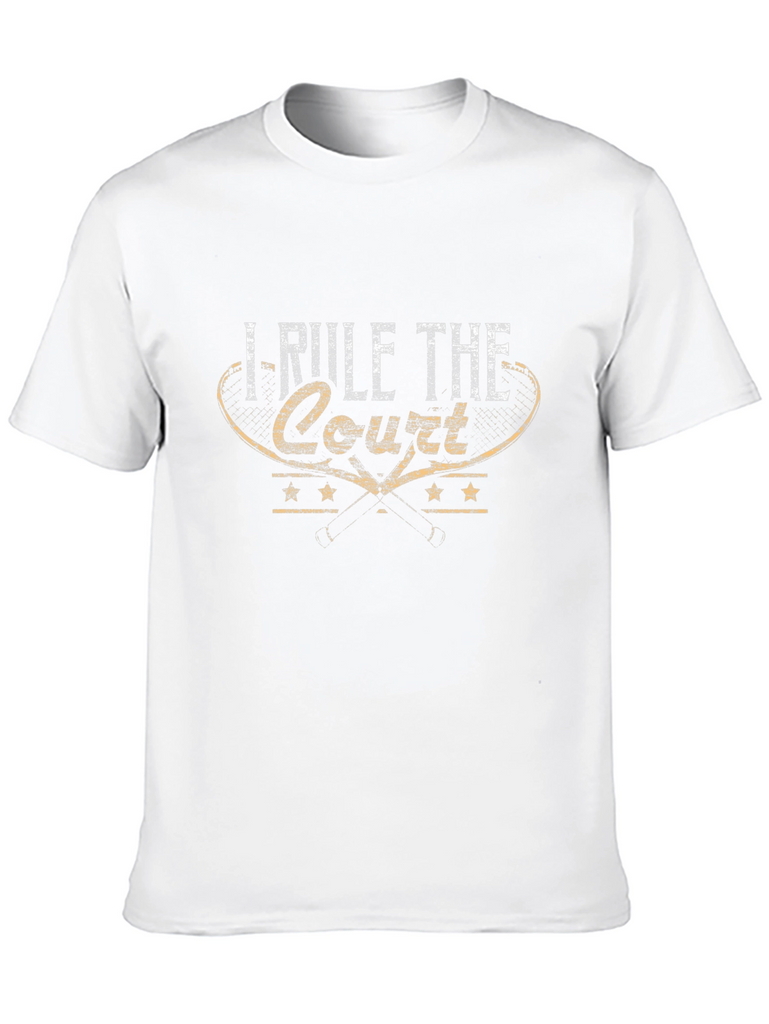 Dominate the game with this striking black t-shirt featuring a bold graphic that declares "I Rule the Court." The design is rendered in a distressed style, giving it a vintage and edgy feel. The text is adorned with tennis rackets. Crafted from a soft and breathable fabric, this tee offers both comfort and style. Perfect for tennis enthusiasts or anyone with a competitive spirit, this shirt is ideal for casual wear, workouts, or showing off your love for the game. Make a statement on and off the court with this must-have addition to your wardrobe.