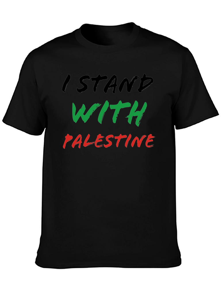 Show your support with this bold 'I Stand With Palestine' graphic t-shirt. The design features text in black, green, and red, printed on a comfortable black tee. The short-sleeve style makes it perfect for everyday wear, rallies, or casual gatherings. Made from a soft, breathable fabric, this shirt is both stylish and comfortable. Wear your heart on your sleeve and make a statement with this meaningful piece.