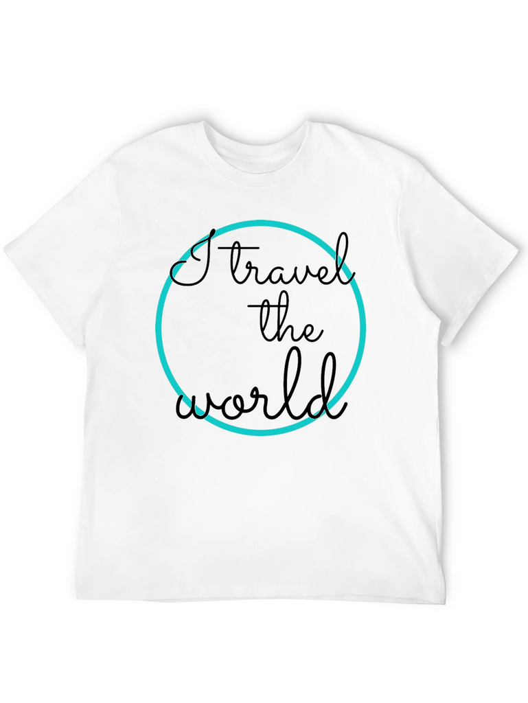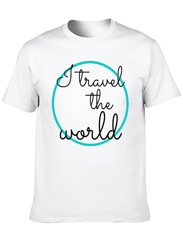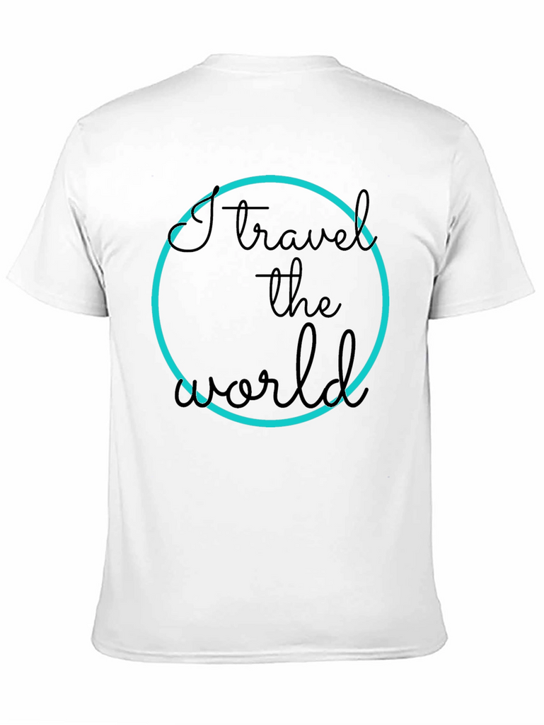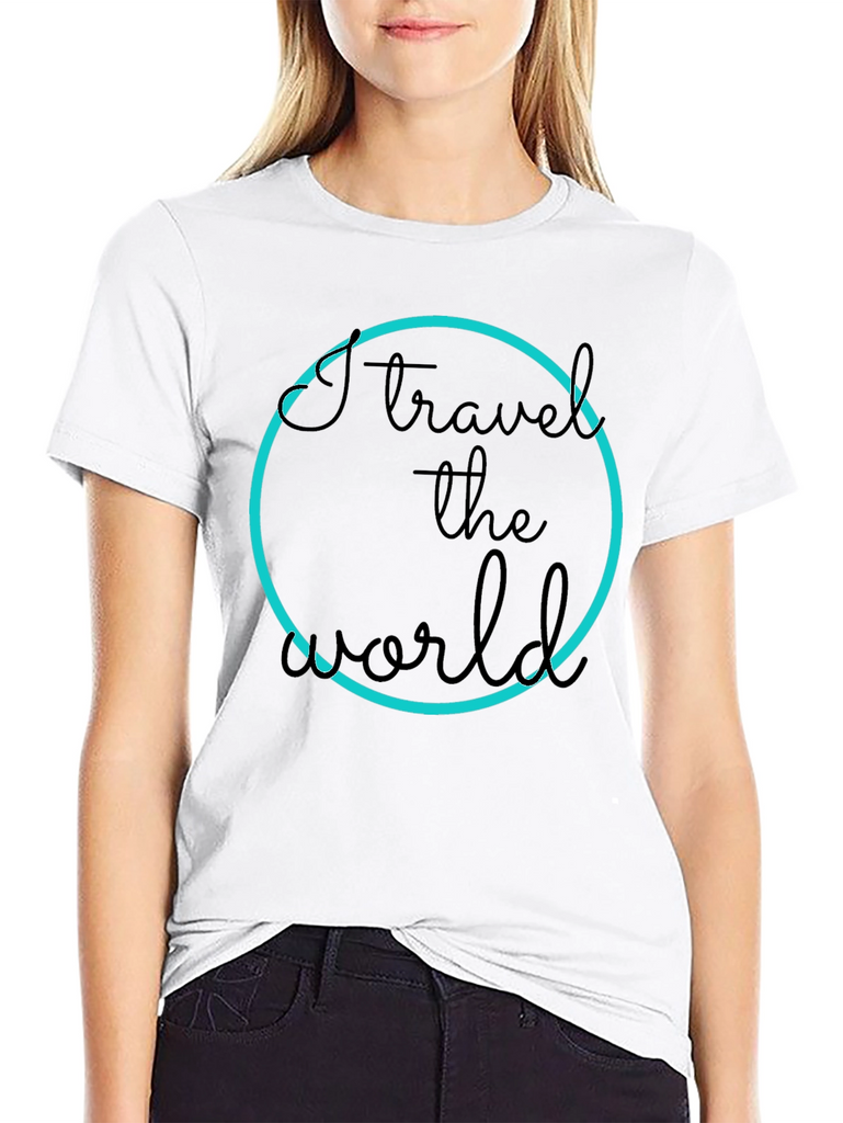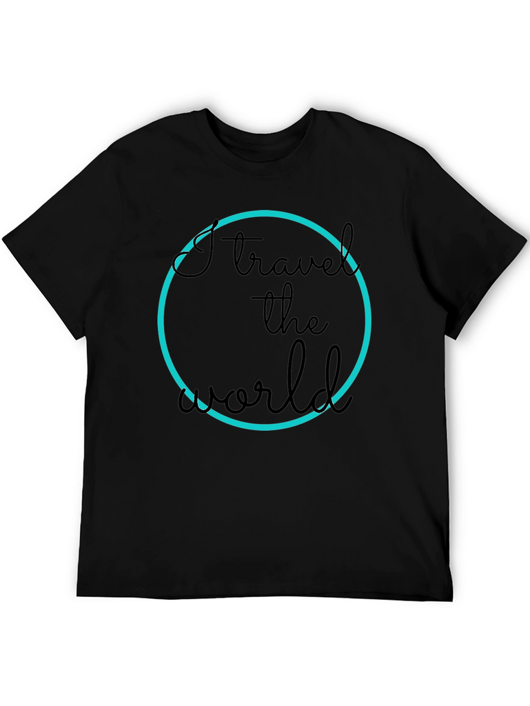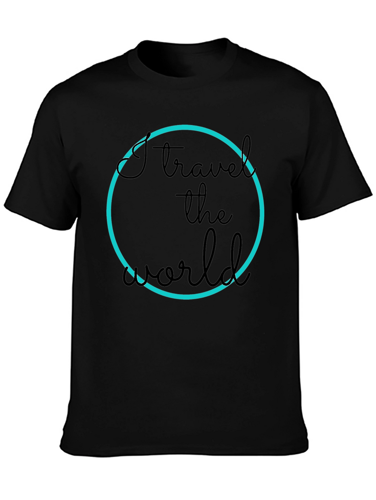 Show off your love for travel with this stylish black t-shirt. The design features a bold "I travel the world" text inside a vibrant blue circle. Made from a comfortable material, this tee is perfect for everyday wear or your next adventure. Pair it with jeans or shorts for a casual yet trendy look. Express your passion and inspire wanderlust wherever you go!