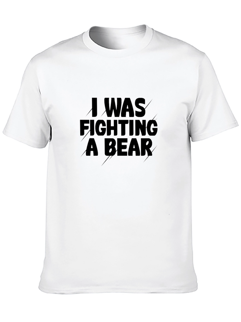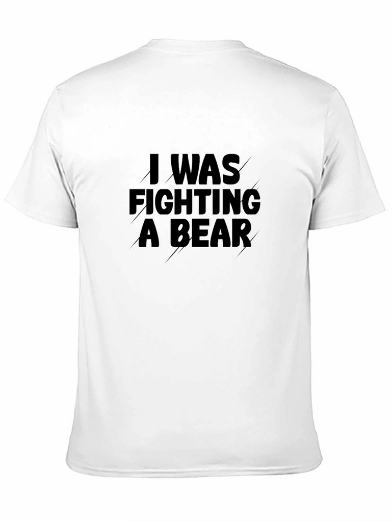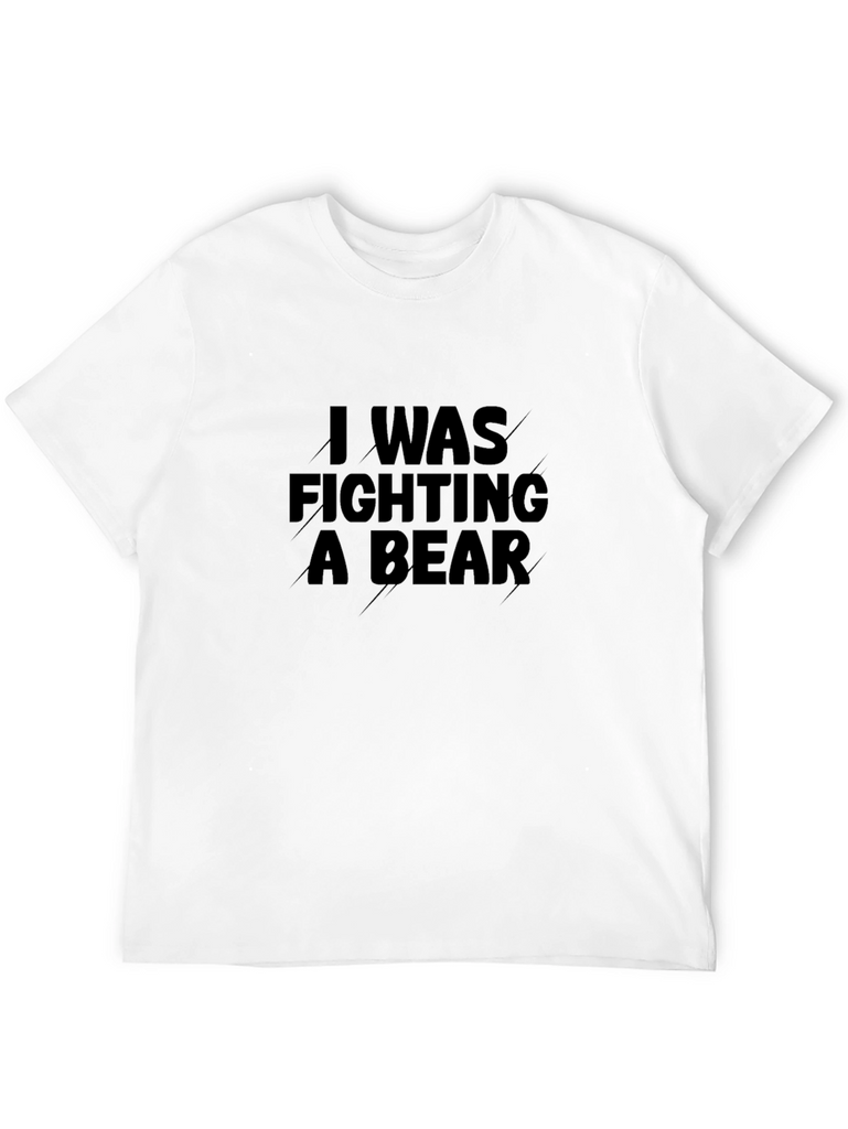This eye-catching black t-shirt features the bold statement "I WAS FIGHTING A BEAR" printed across the chest. The message is displayed in a strong, impactful font. Made from what appears to be a comfortable, breathable fabric, this shirt is perfect for casual wear. The classic fit makes it a versatile addition to any wardrobe. Show off your sense of humor with this unique and attention-grabbing t-shirt. Wear it to the gym, out with friends, or just lounging around. This t-shirt is sure to spark conversations and turn heads.