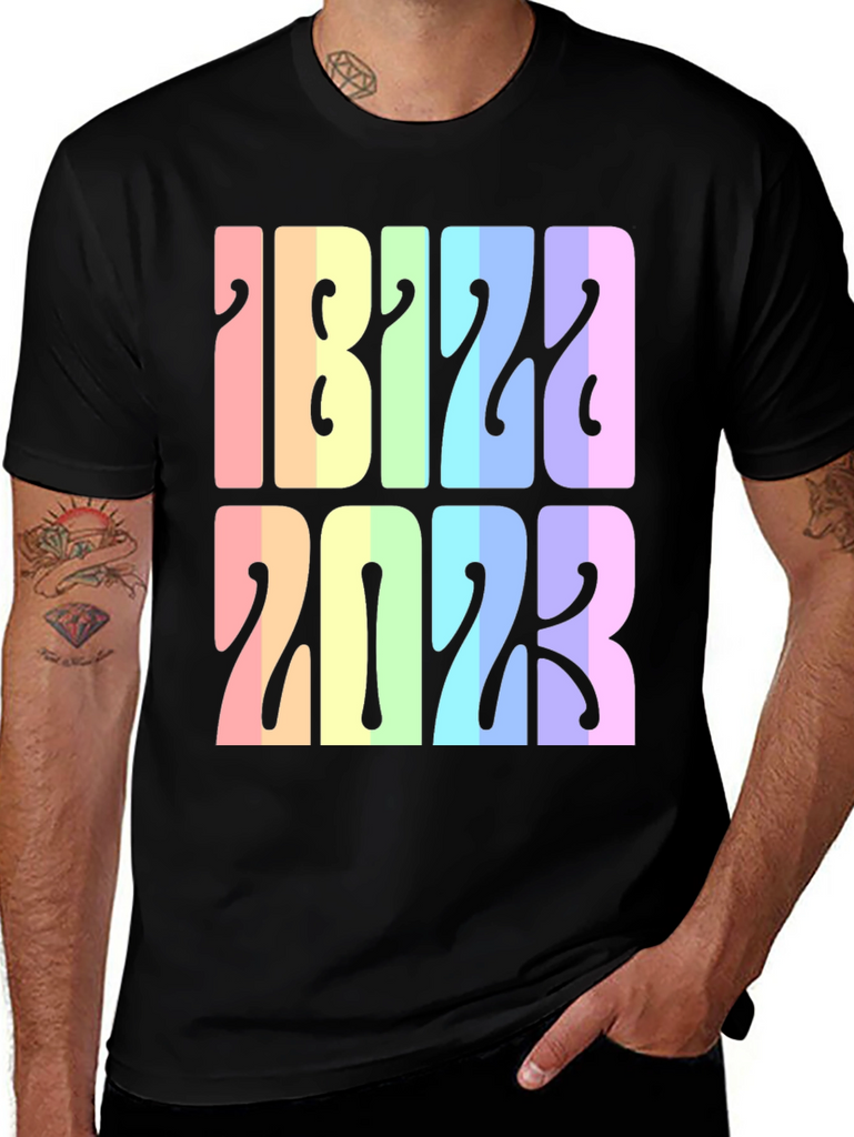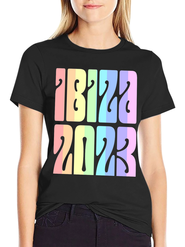 Show your love for Ibiza with this unique 2023 t-shirt. The shirt features 'Ibiza 2023' in a stacked design, with a vibrant retro rainbow color scheme. Each letter and number showcases a gradient of pastel colors, adding a playful and eye-catching element to the design. Made from comfortable, breathable fabric, this tee is perfect for vacation, casual wear, or as a souvenir. Wear it to the beach, to a music festival, or while exploring the island. Make a statement and celebrate your Ibiza adventure with this colorful and stylish t-shirt.