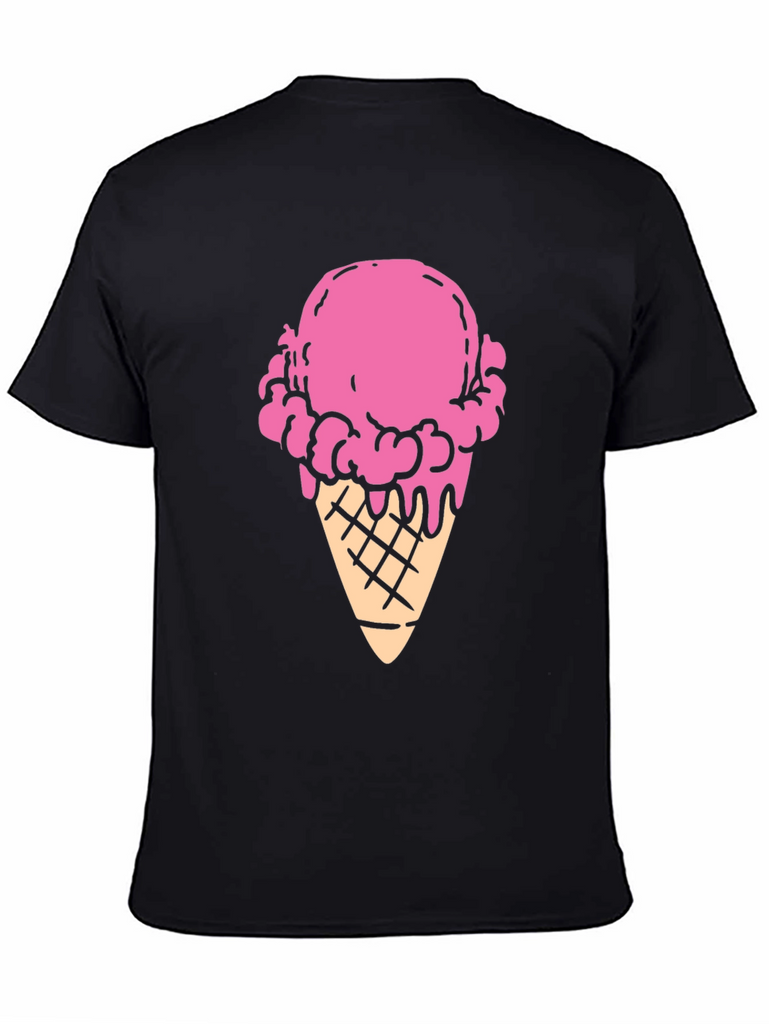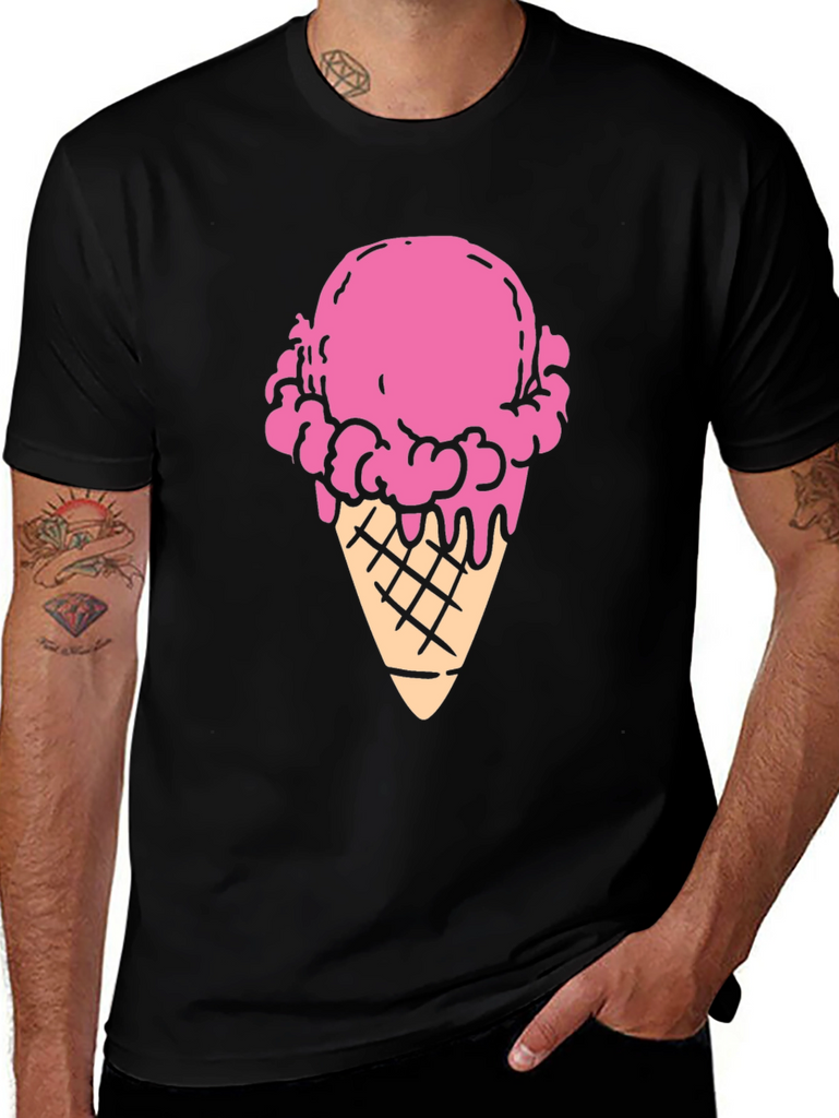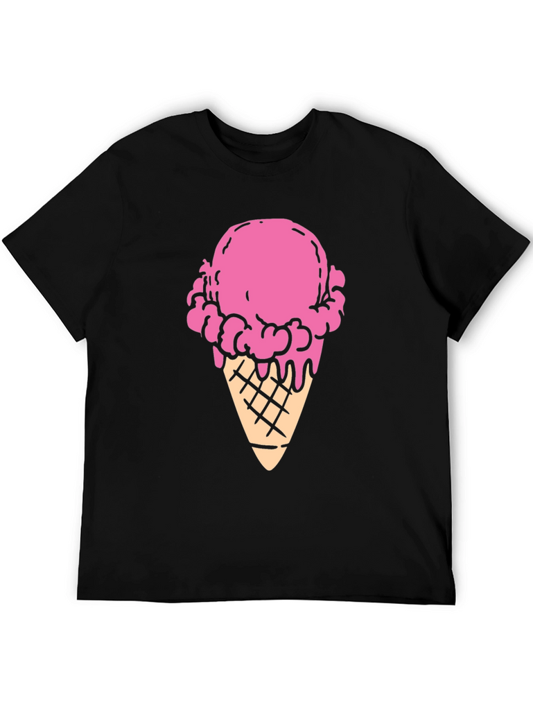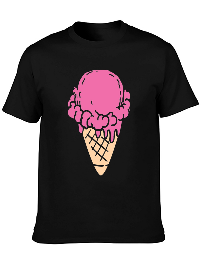 Indulge your style with this eye-catching black T-shirt featuring a vibrant ice cream cone graphic. The playful design showcases a scoop of pink ice cream nestled in a classic cone, complete with detailed lines for a touch of whimsy. Perfect for casual outings, summer events, or adding a fun twist to your everyday wardrobe. Made from comfortable, breathable fabric, this T-shirt ensures all-day comfort and a flattering fit. Stand out from the crowd and express your love for sweet treats with this unique and stylish tee. Get yours today!