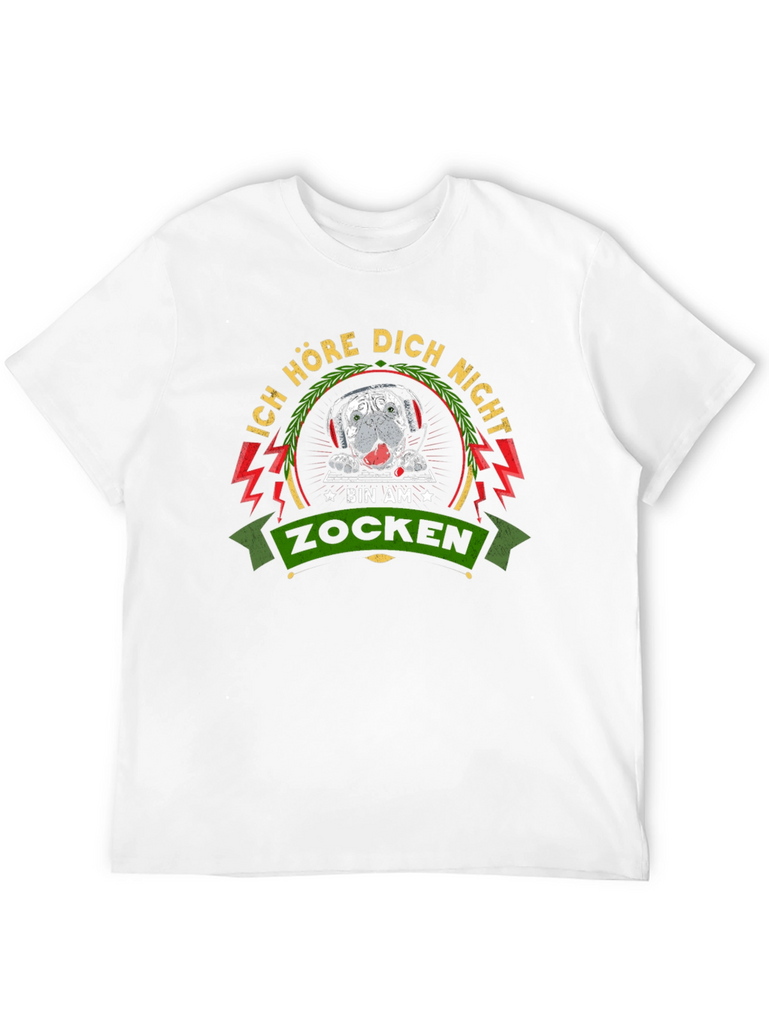 This black t-shirt features a playful and eye-catching graphic design, perfect for gamers or anyone with a fun sense of humor. The central image is a bulldog wearing a gaming headset, surrounded by the German text "Ich höre dich nicht, bin am zocken" which translates to "I can't hear you, I'm gaming". The design incorporates decorative elements such as lightning bolts and laurel leaves to add a touch of whimsy. This shirt is ideal for casual wear, gaming sessions, or as a gift for the gamer in your life. The graphic design is sure to spark conversation and draw attention.