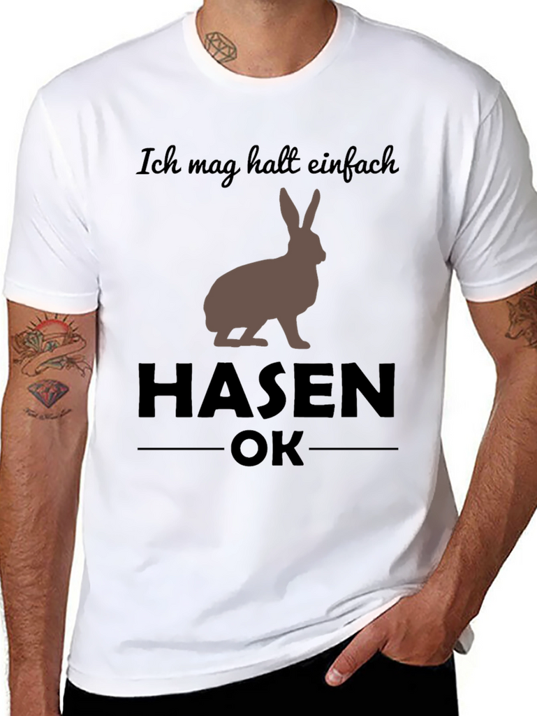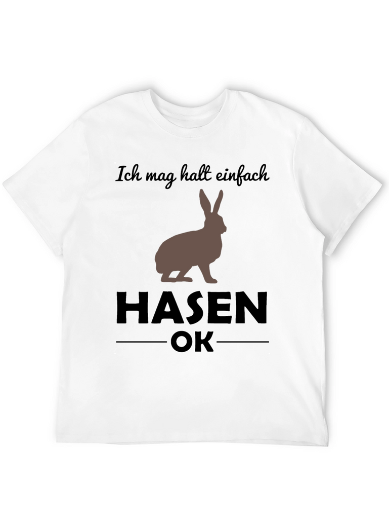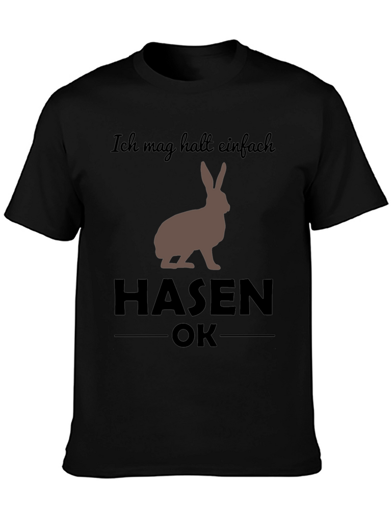 Express your love for rabbits with this fun and stylish black t-shirt. The shirt features a playful design with the phrase "Ich Mag Hasen OK," which translates to "I just like rabbits OK". A brown rabbit silhouette is centered between the text. Crafted from a soft, comfortable fabric, this tee is perfect for everyday wear. The classic fit ensures a relaxed and flattering look for all body types. This shirt is not just a piece of clothing; it's a statement! It shows off your unique personality and love for cute bunnies. Wear it casually with jeans or dress it up with a jacket. Makes a great gift for rabbit lovers!