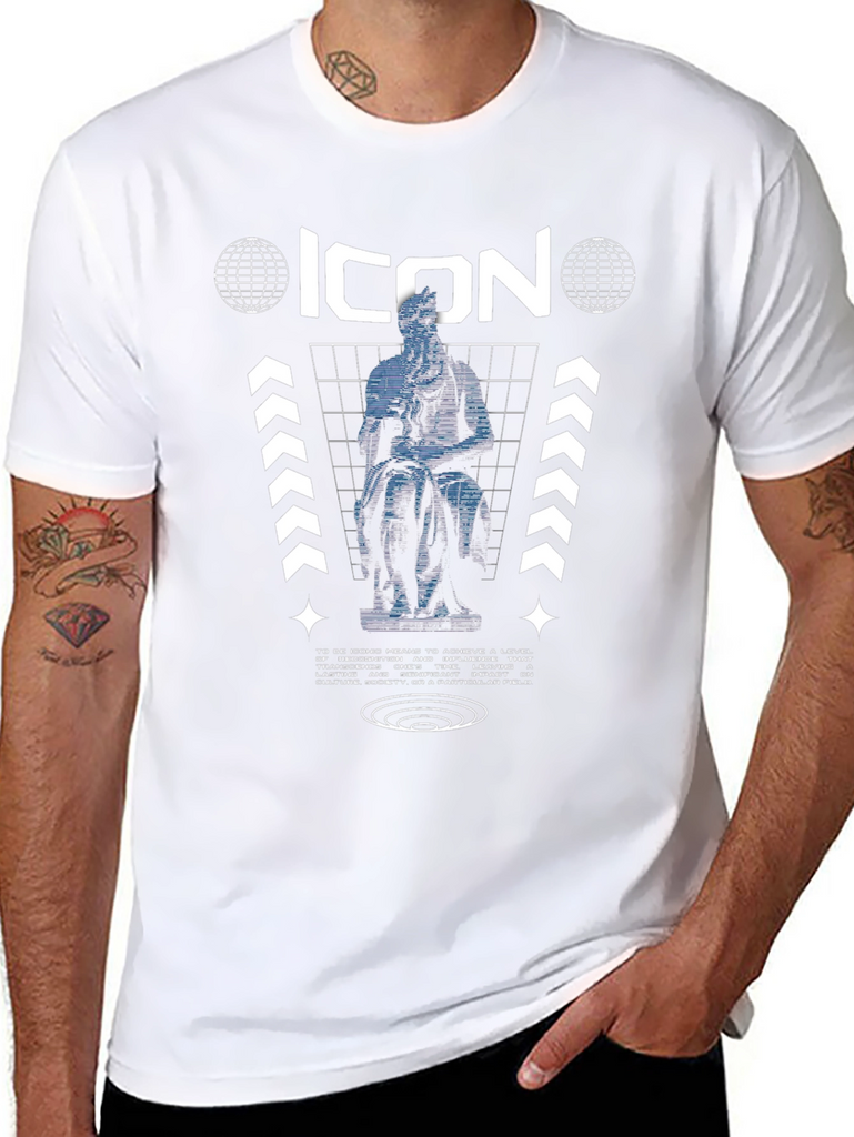 Showcase your unique style with this black tee featuring a bold graphic print. The design incorporates a statue of Moses, the word "ICON," and geometric elements. Crafted from comfortable fabric, this short-sleeve shirt offers both style and breathability. The eye-catching design is perfect for casual outings, streetwear fashion, or expressing your artistic personality. This statement piece is sure to turn heads and spark conversations. It offers a unique blend of classic art and modern design, making it a standout addition to any wardrobe. Elevate your look with this must-have graphic tee!