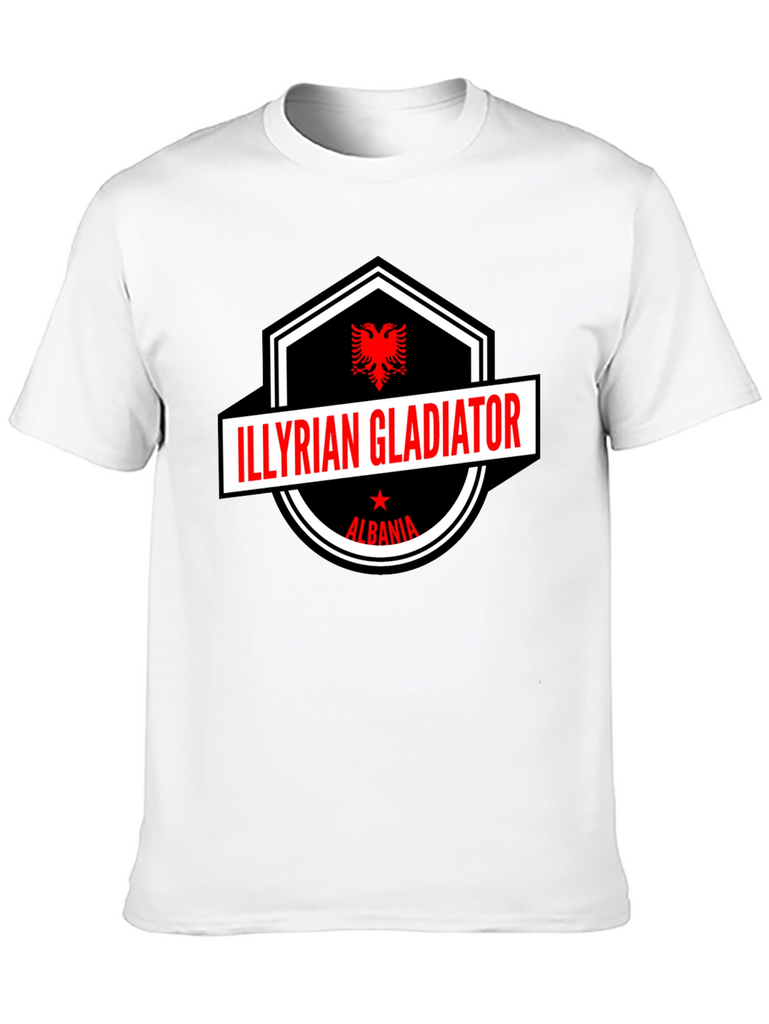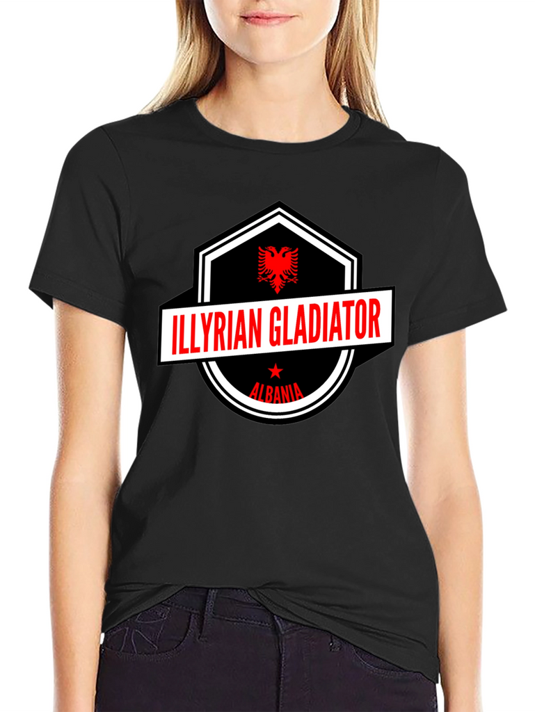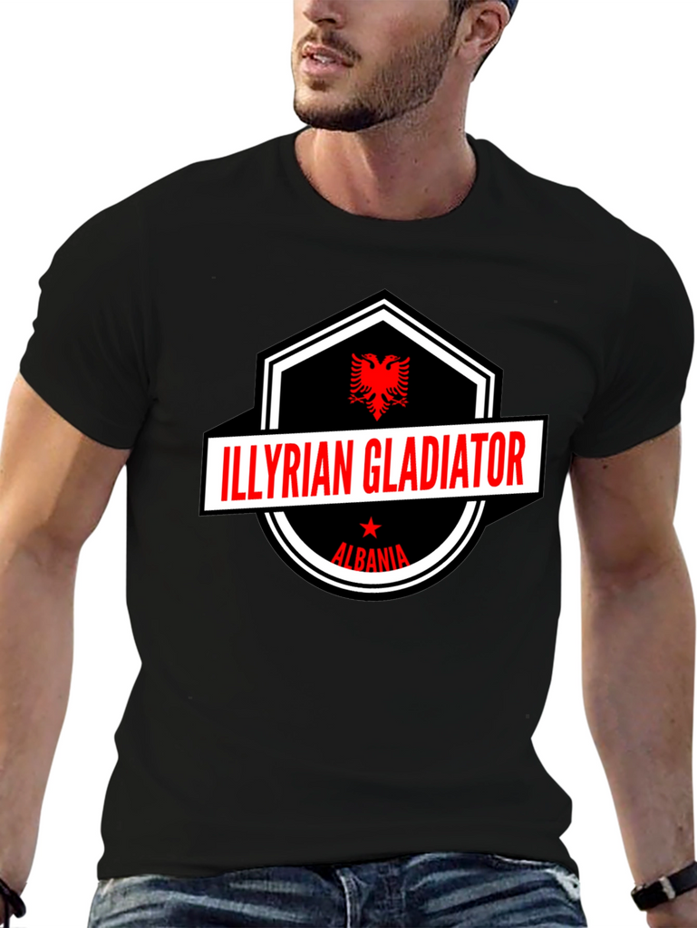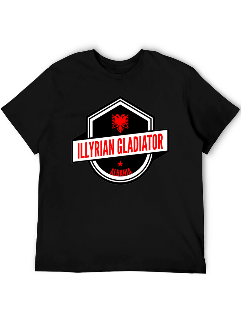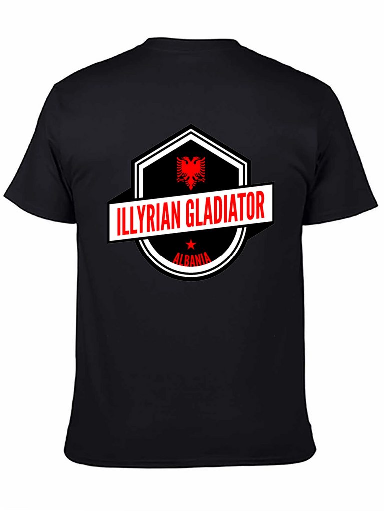 Show your pride with this Illyrian Gladiator Albania T-shirt. Featuring a unique emblem with the Albanian double-headed eagle, star, and bold text, this shirt makes a statement. The classic black tee is made from comfortable fabric that will feel soft all day. Perfect for casual wear or as a gift for those with Albanian heritage. This t-shirt is sure to be a conversation starter and a standout piece in any wardrobe. It's durable and easy to care for, making it ideal for everyday wear or special events. Wear it to show your spirit and stand out from the crowd!