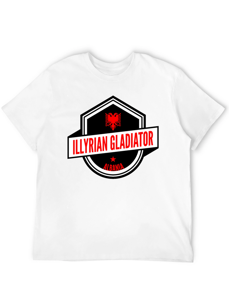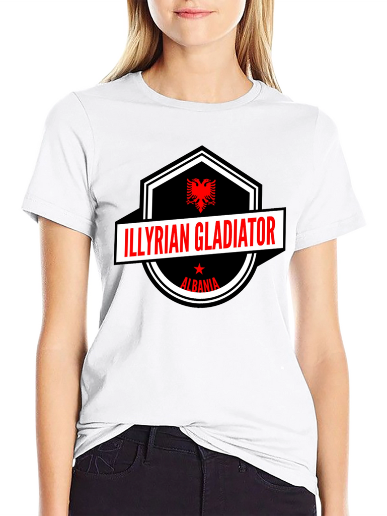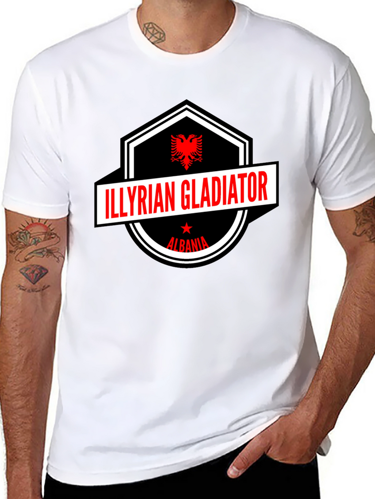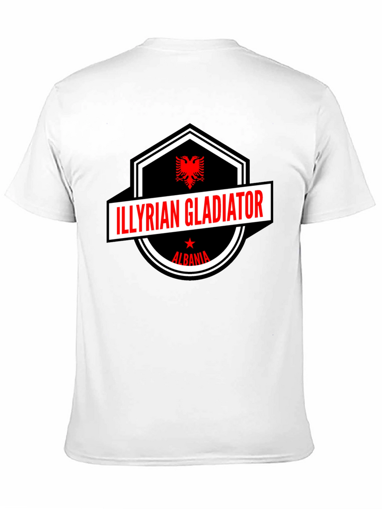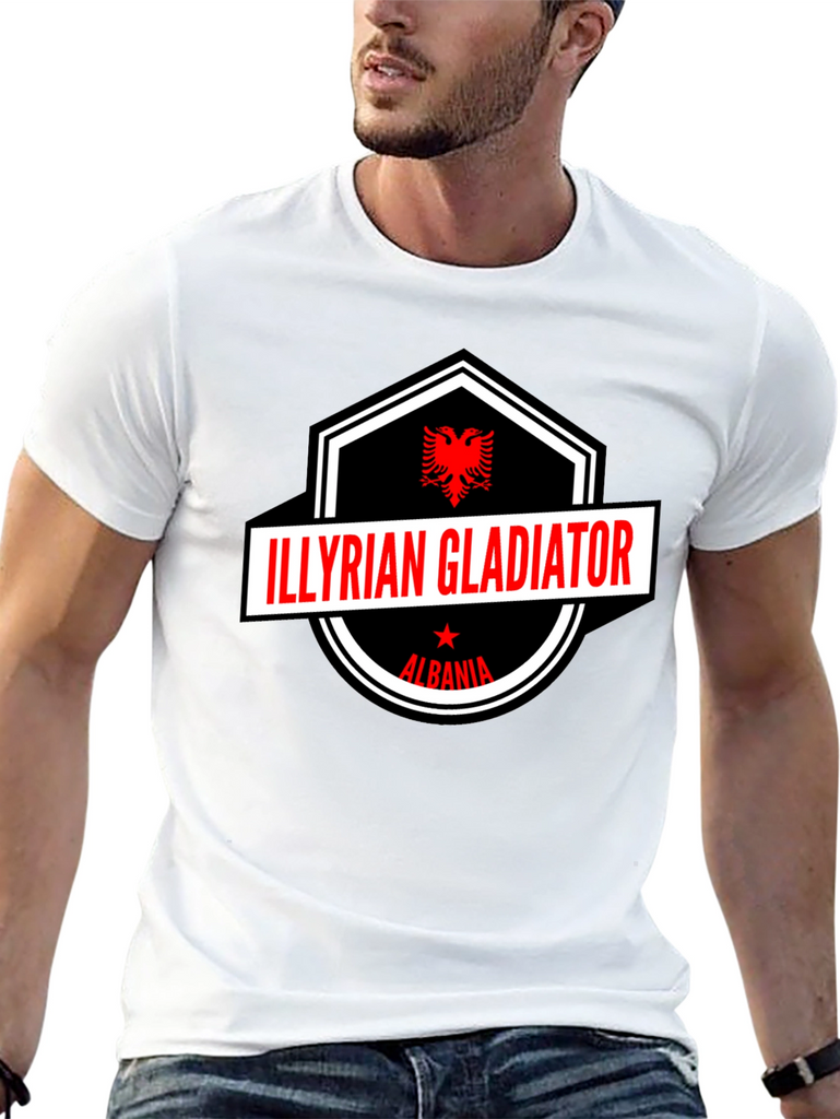 Show your pride with this Illyrian Gladiator Albania T-shirt. Featuring a unique emblem with the Albanian double-headed eagle, star, and bold text, this shirt makes a statement. The classic black tee is made from comfortable fabric that will feel soft all day. Perfect for casual wear or as a gift for those with Albanian heritage. This t-shirt is sure to be a conversation starter and a standout piece in any wardrobe. It's durable and easy to care for, making it ideal for everyday wear or special events. Wear it to show your spirit and stand out from the crowd!