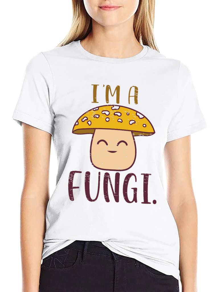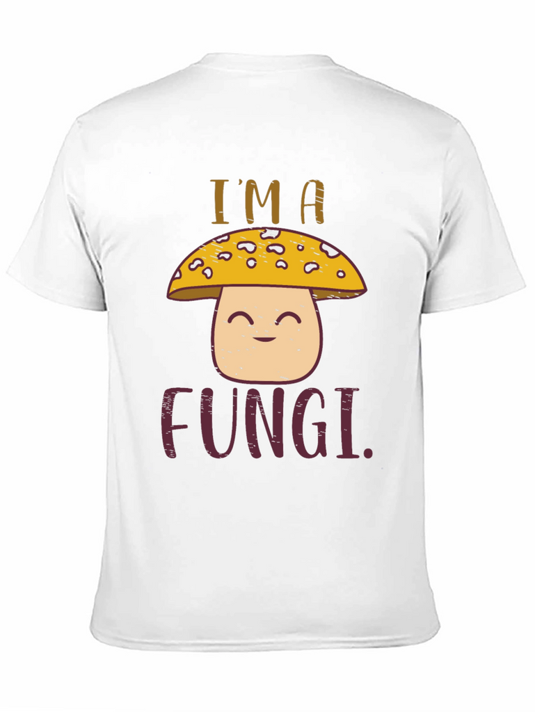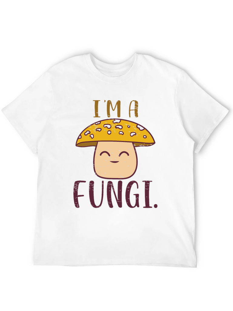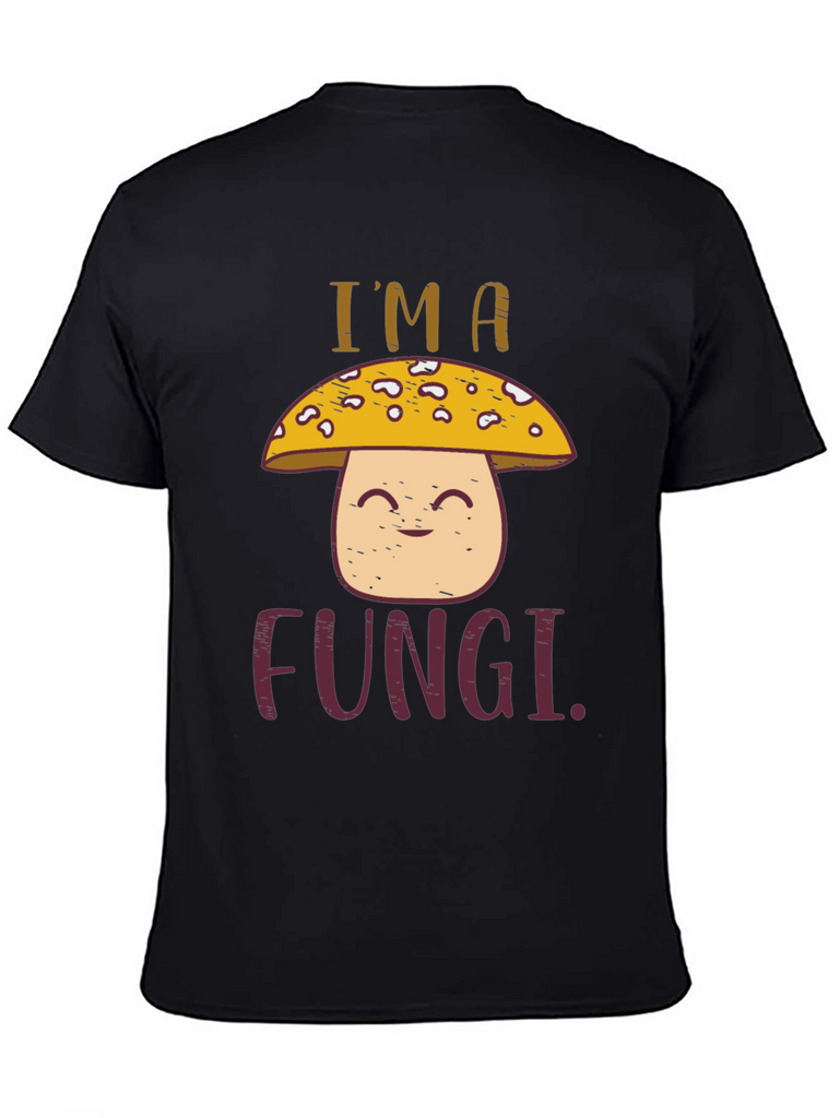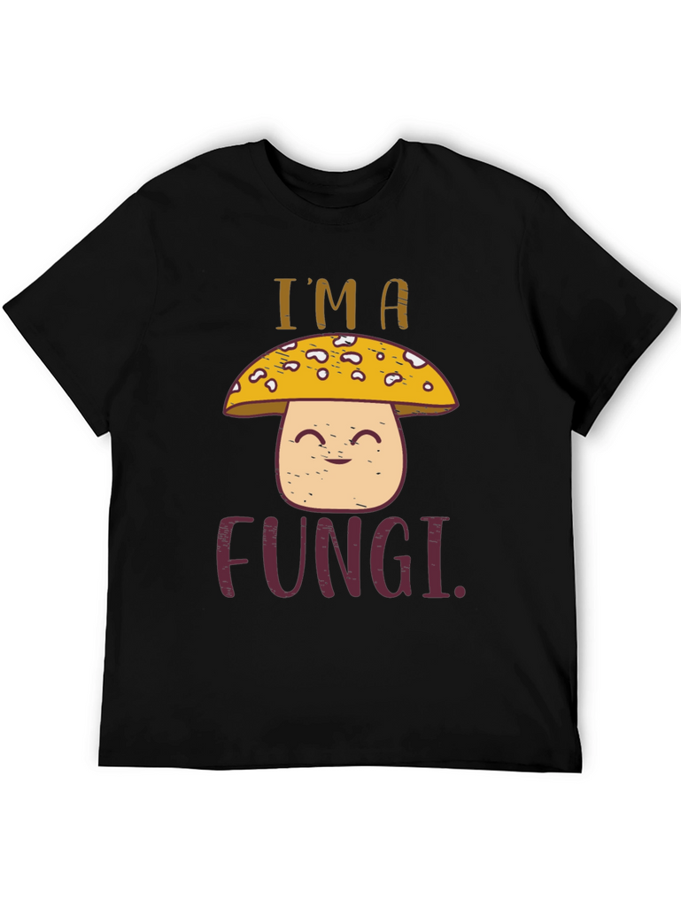 This fun black t-shirt features a charming cartoon mushroom design with the punny text "I'm a Fungi." The playful graphic showcases a mushroom with a yellow cap dotted with white spots and a cute, smiling face. The text complements the whimsical vibe. Made from a comfortable-looking fabric, this tee is perfect for casual wear, adding a touch of humor to your everyday style. It’s an excellent conversation starter and a must-have for mushroom enthusiasts or anyone with a lighthearted sense of humor. Wear it to your next casual outing or use it as a quirky gift for a friend.