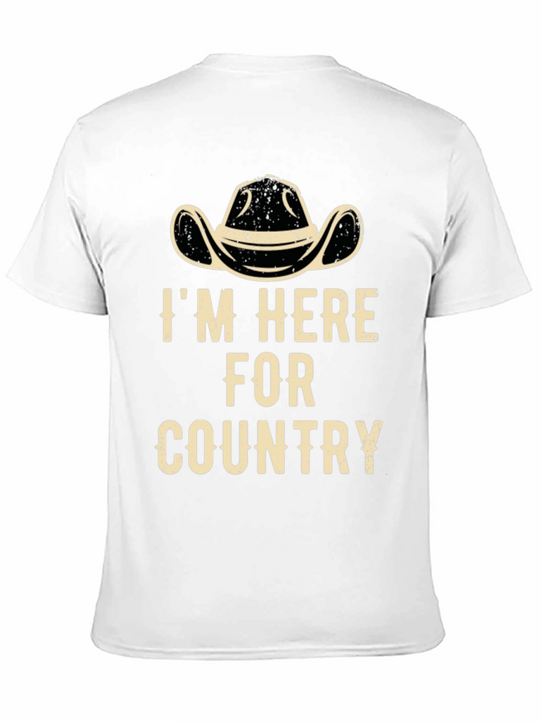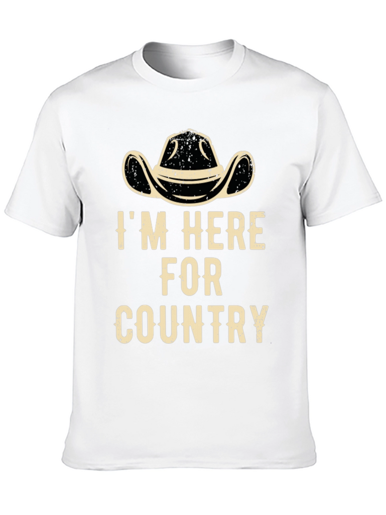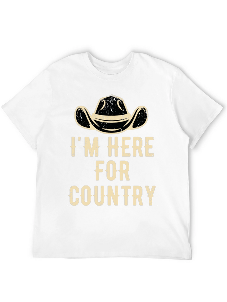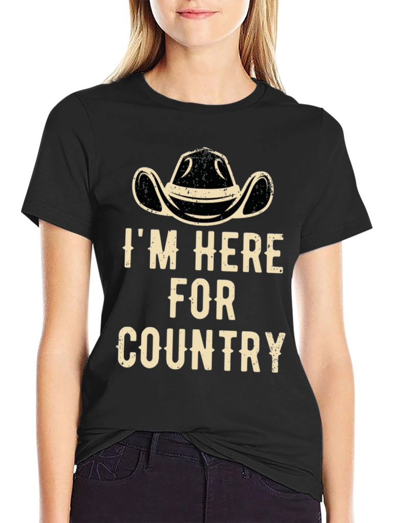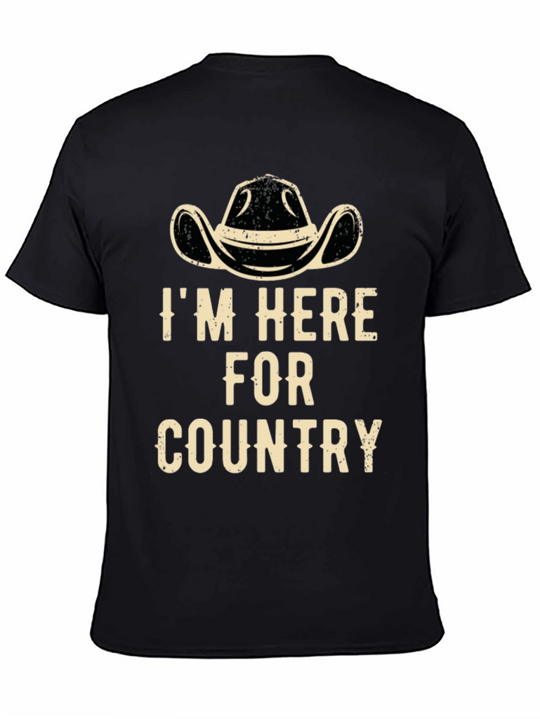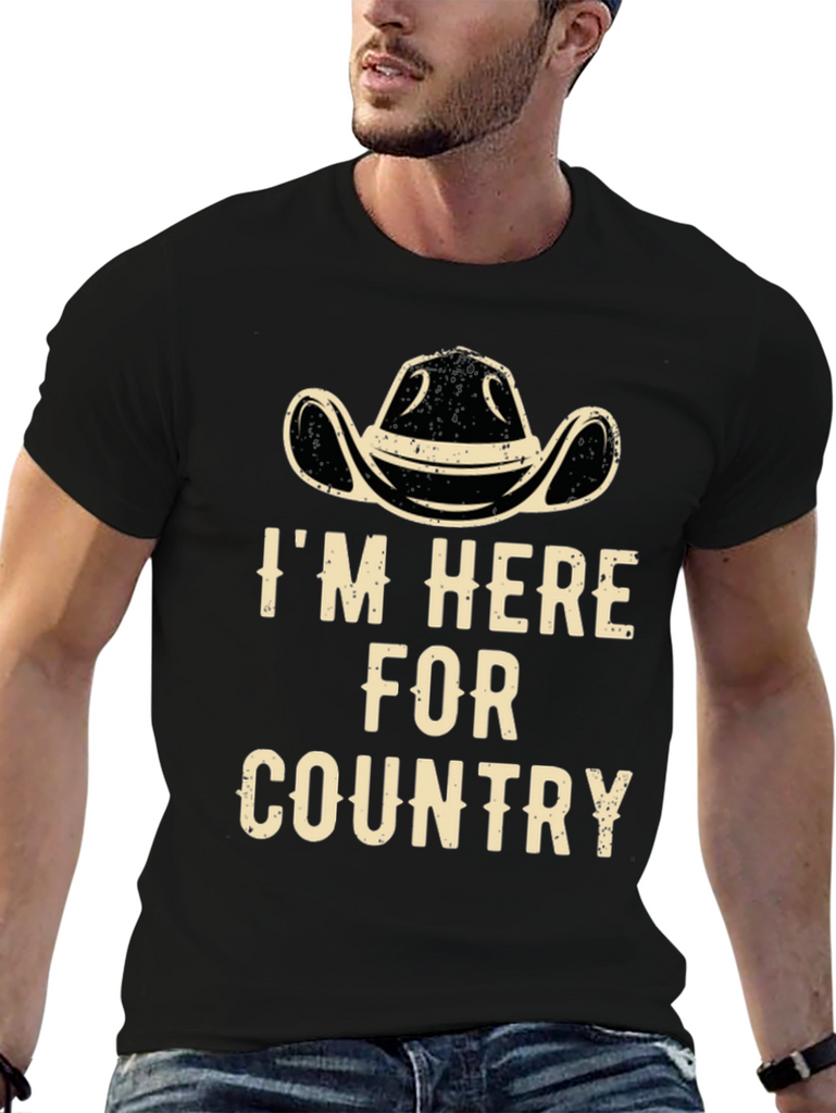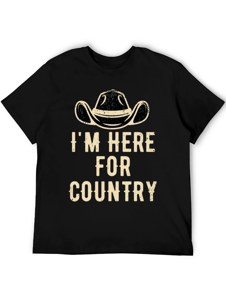 Show off your love for country music with this stylish black graphic tee. The shirt features a cream-colored cowboy hat graphic above the phrase "I'M HERE FOR COUNTRY" in a distressed font. Made from a soft, comfortable fabric, this t-shirt is perfect for everyday wear, concerts, or your next country music festival. The classic fit ensures a relaxed and flattering look for all body types. This durable and eye-catching design will surely spark conversations and showcase your passion for country music. Dress it up or down, this versatile t-shirt is a must-have addition to any country music lover's wardrobe.
