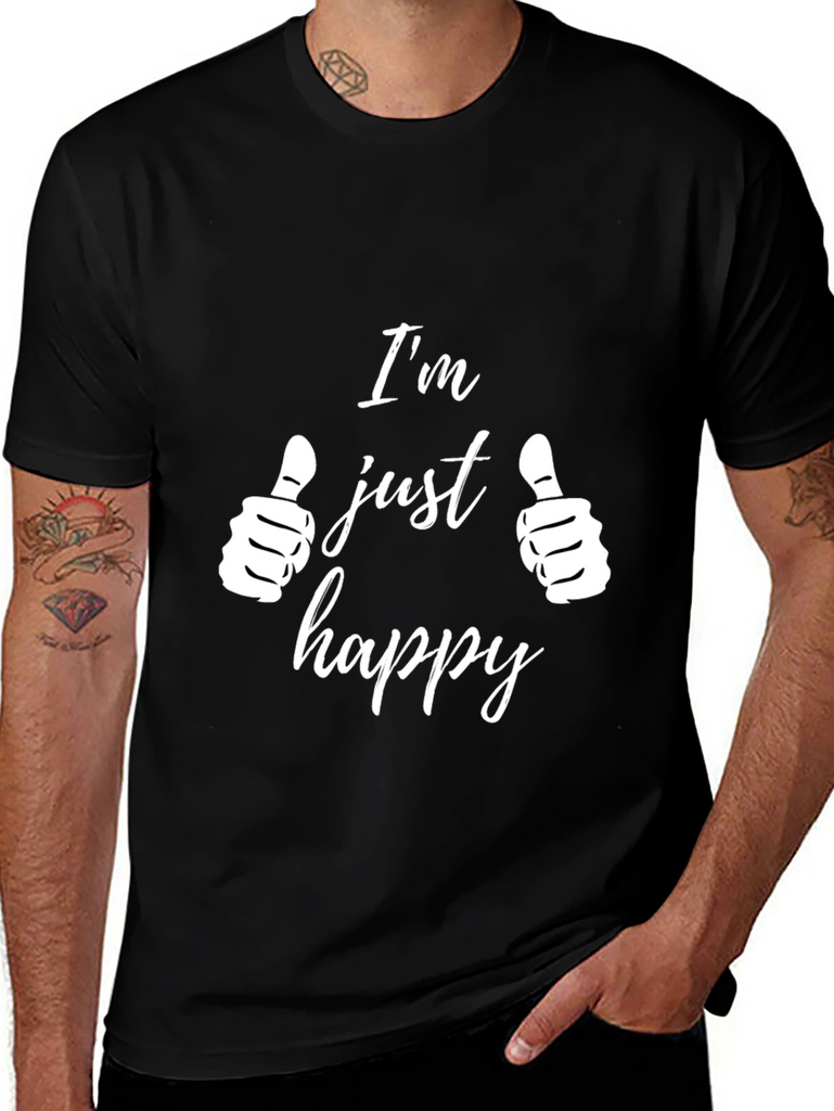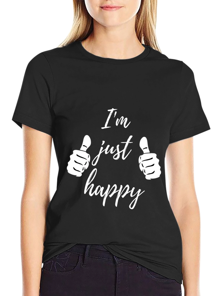 Spread positive vibes with this black graphic t-shirt! This short-sleeved tee features the playful phrase "I'm just happy" in a stylish white font, accompanied by cute thumbs-up illustrations. The classic crew neck and comfortable fit make it perfect for everyday wear. Made from a soft, breathable fabric, this t-shirt ensures all-day comfort. Whether you're running errands, hanging out with friends, or simply relaxing at home, this cheerful tee is a great way to express your positive attitude and brighten someone's day. A fun and easy way to add a touch of happiness to your wardrobe!