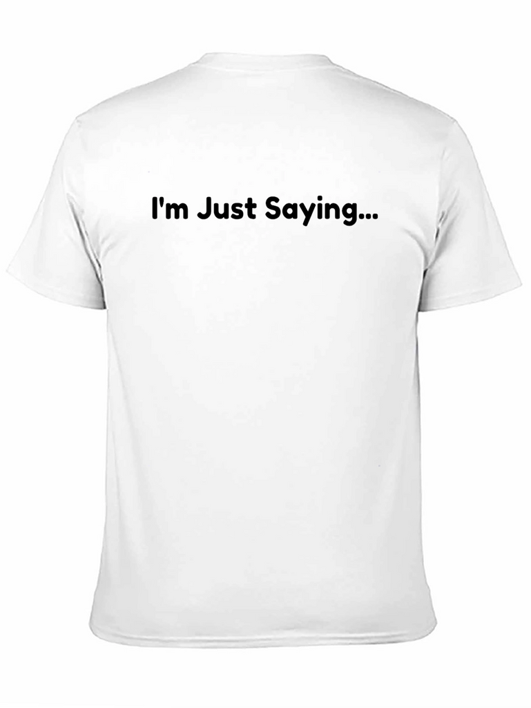 Make a statement with this classic black t-shirt featuring the phrase "I'm Just Saying..." in a sleek, understated font. The shirt has a comfortable fit and a versatile design, perfect for everyday wear. The dark color provides a neutral backdrop, making it easy to pair with jeans, shorts, or casual pants. This tee is ideal for expressing yourself with a touch of humor. The shirt appears to be made from a soft and breathable material, ensuring all-day comfort. It's a great addition to any wardrobe, whether you're running errands, hanging out with friends, or simply relaxing at home. Let your shirt do the talking with this witty and stylish tee.