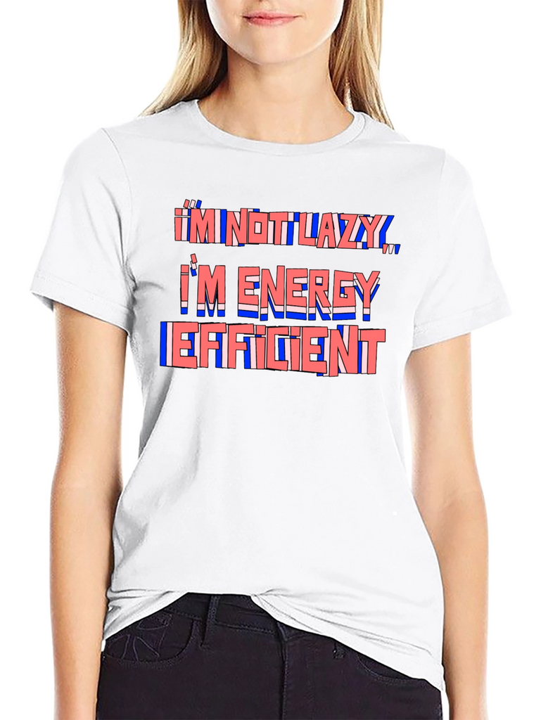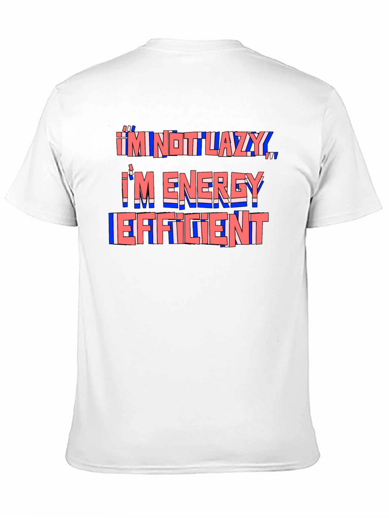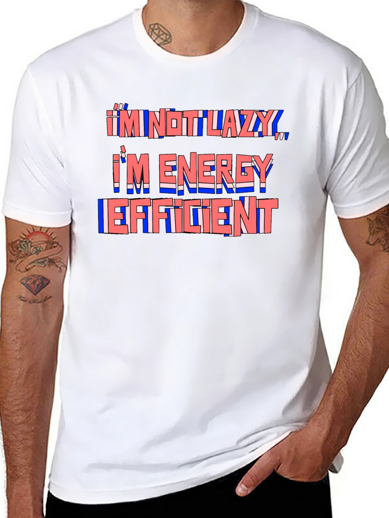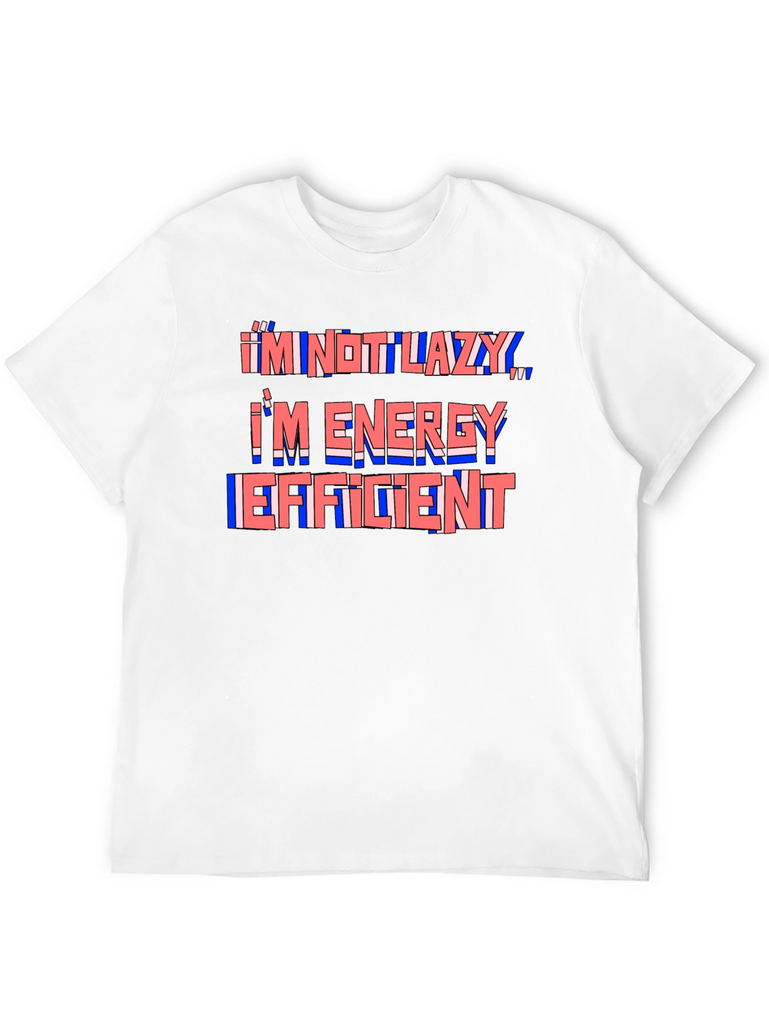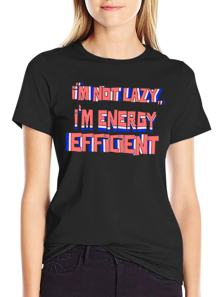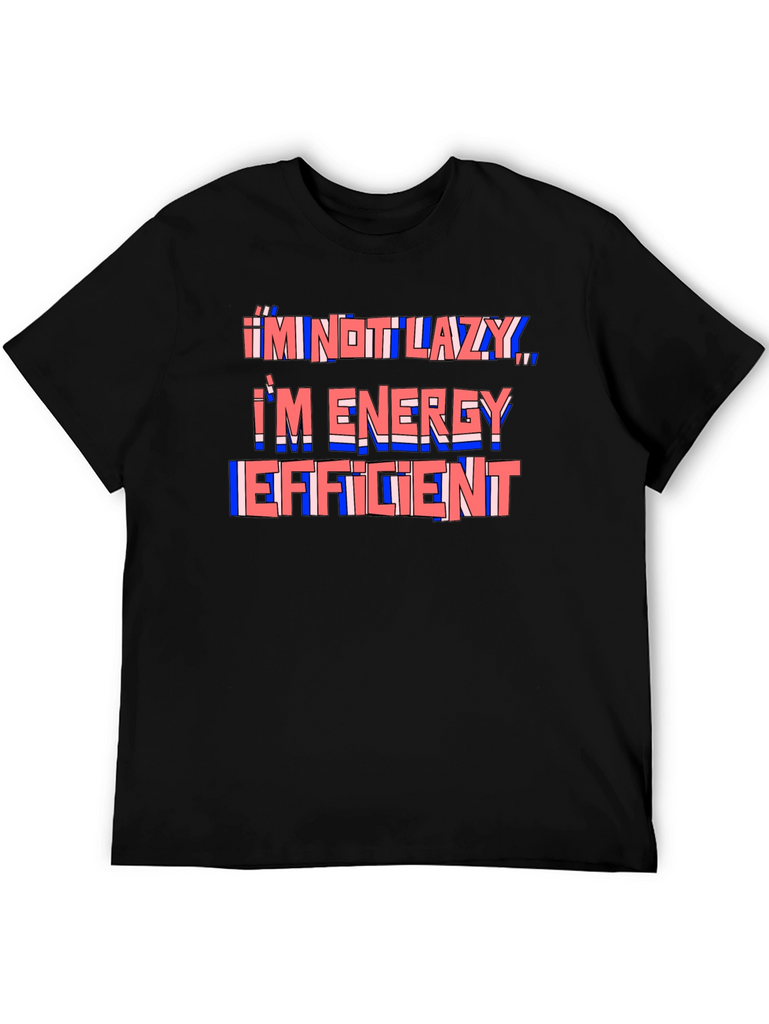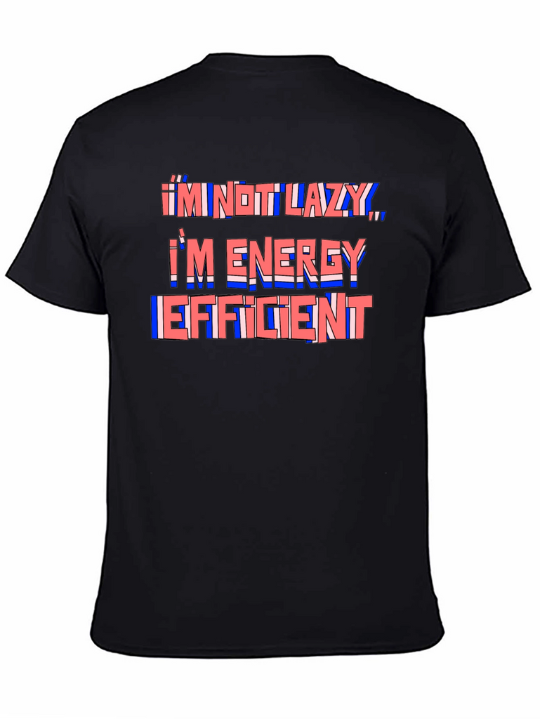 This black t-shirt features a humorous quote in a stylized design. The phrase "I'm Not Lazy, I'm Energy Efficient" is printed across the chest in a layered red and blue color scheme, creating a playful and eye-catching effect. The shirt appears to be made from a comfortable, soft fabric, ideal for everyday wear. The classic fit ensures a relaxed and stylish look. This tee is perfect for anyone with a sense of humor who appreciates comfort and style. Wear it casually with jeans or shorts for a fun and relatable statement.