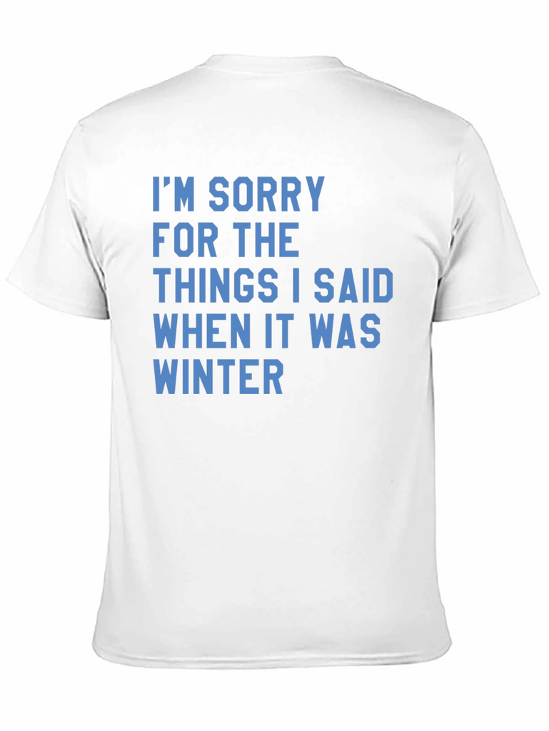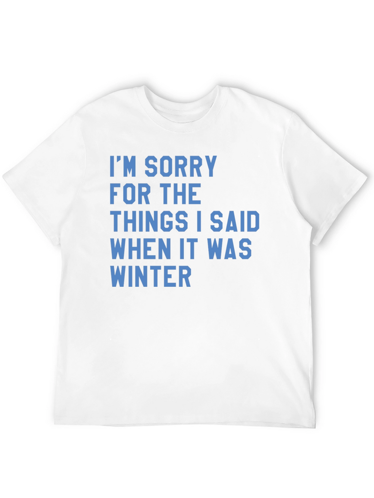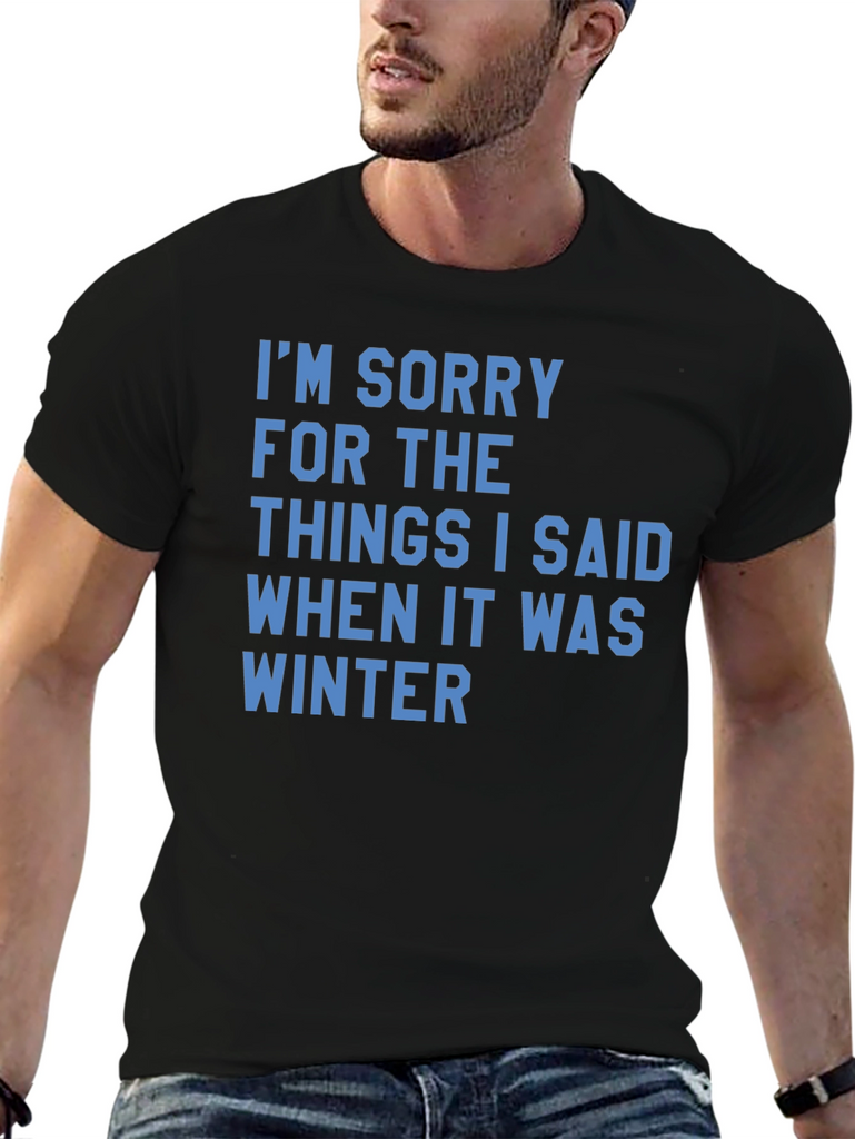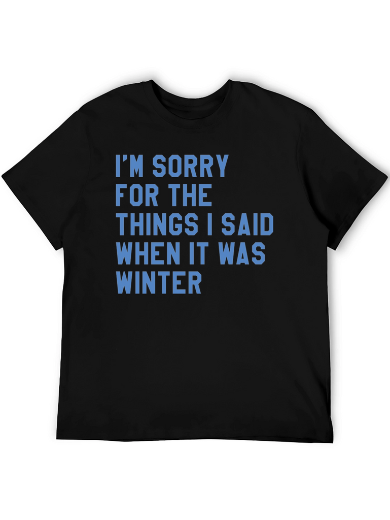 This t-shirt features a bold, humorous statement perfect for those with a penchant for winter apologies. The text, "I'M SORRY FOR THE THINGS I SAID WHEN IT WAS WINTER," is printed in a striking blue on a black shirt. Made from a comfortable fabric, likely a soft cotton blend, this tee offers both style and ease. It's a great conversation starter and a fun way to express your feelings about the colder months. Ideal for casual wear, social gatherings, or as a unique gift for someone with a winter attitude.