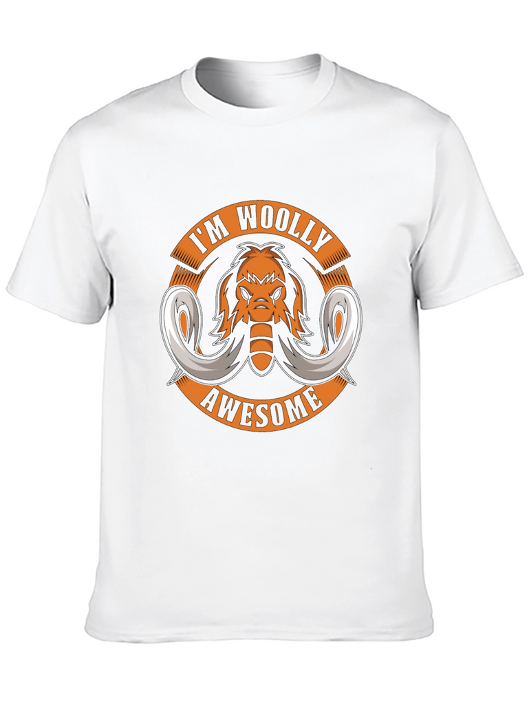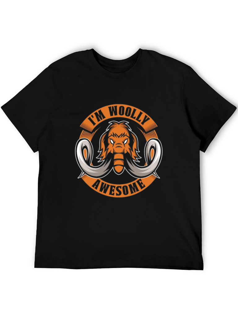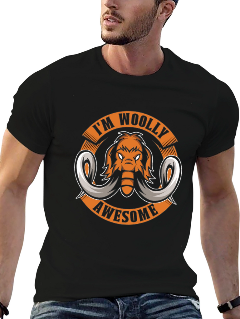Show off your prehistoric style with this black graphic t-shirt! The design features a cool cartoon mammoth with the slogan 'I'm Woolly Awesome' arranged in a circular format. This tee is perfect for animal lovers, fossil enthusiasts, or anyone with a playful sense of humor. Made from a comfortable and durable fabric, it's ideal for casual wear, outings, or as a fun conversation starter. Pair it with jeans, shorts, or your favorite bottoms for a standout look. Get ready to make a statement and unleash your inner mammoth!