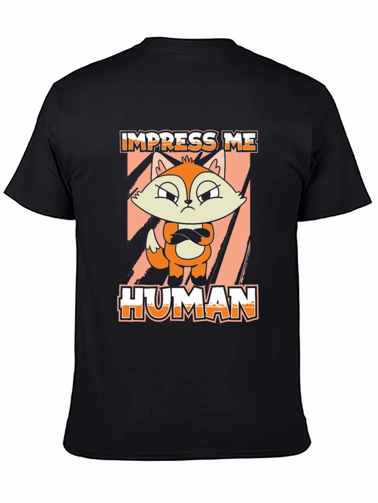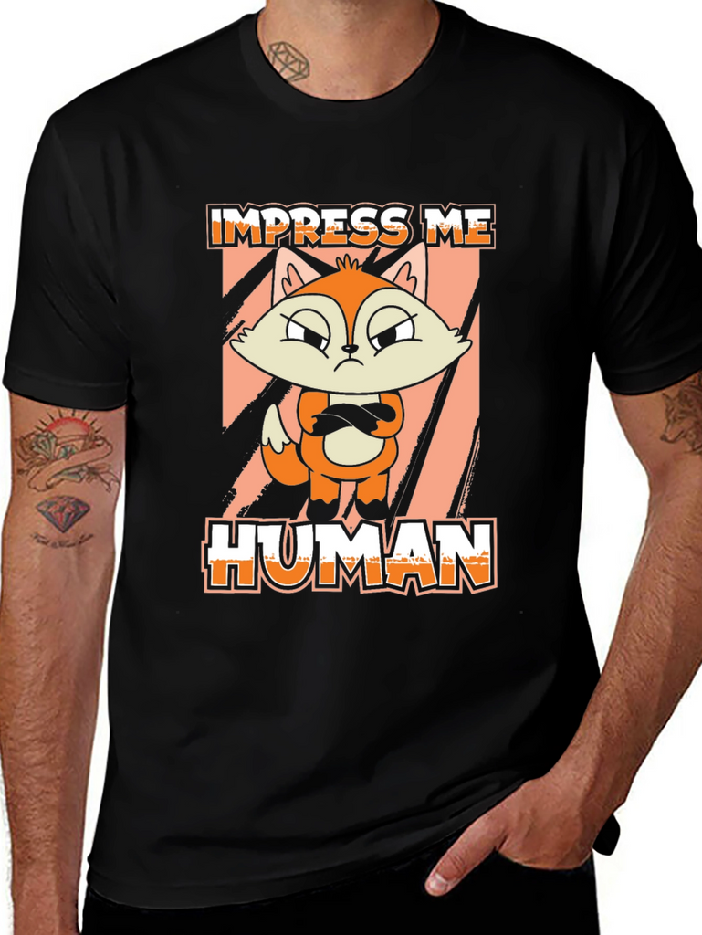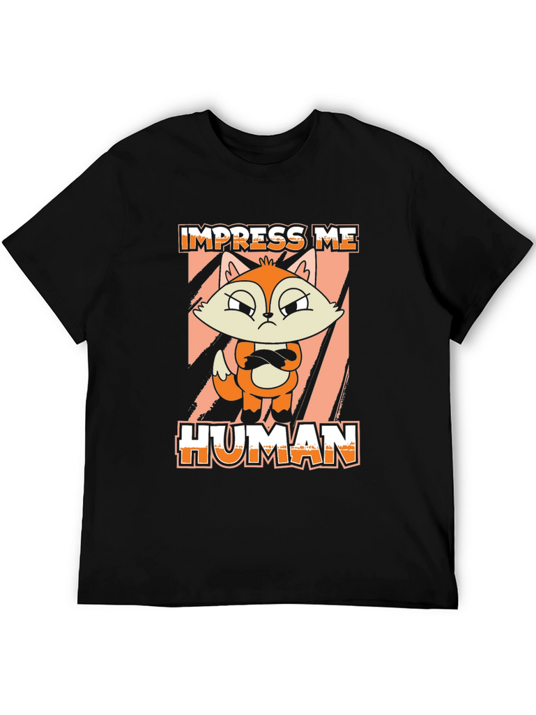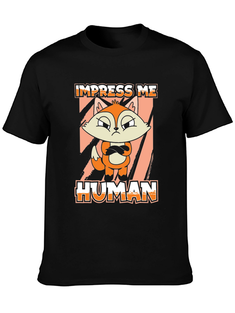 Show off your sassy side with this black graphic tee featuring a cartoon fox with an unimpressed expression! The humorous design with the text "Impress Me Human" makes it a fun conversation starter. Perfect for casual wear, this t-shirt is made from a soft-looking fabric that appears comfortable for everyday use. The vibrant colors of the graphic contrast nicely against the black background, ensuring the design pops. Whether you're a fan of foxes or just love quirky apparel, this tee is a must-have addition to your wardrobe. Rock it with jeans or shorts for a relaxed and stylish look.