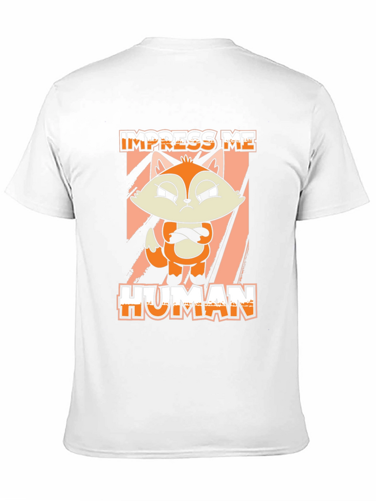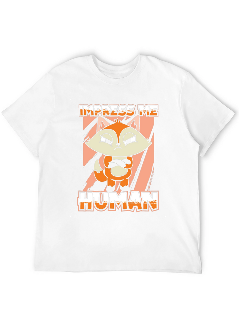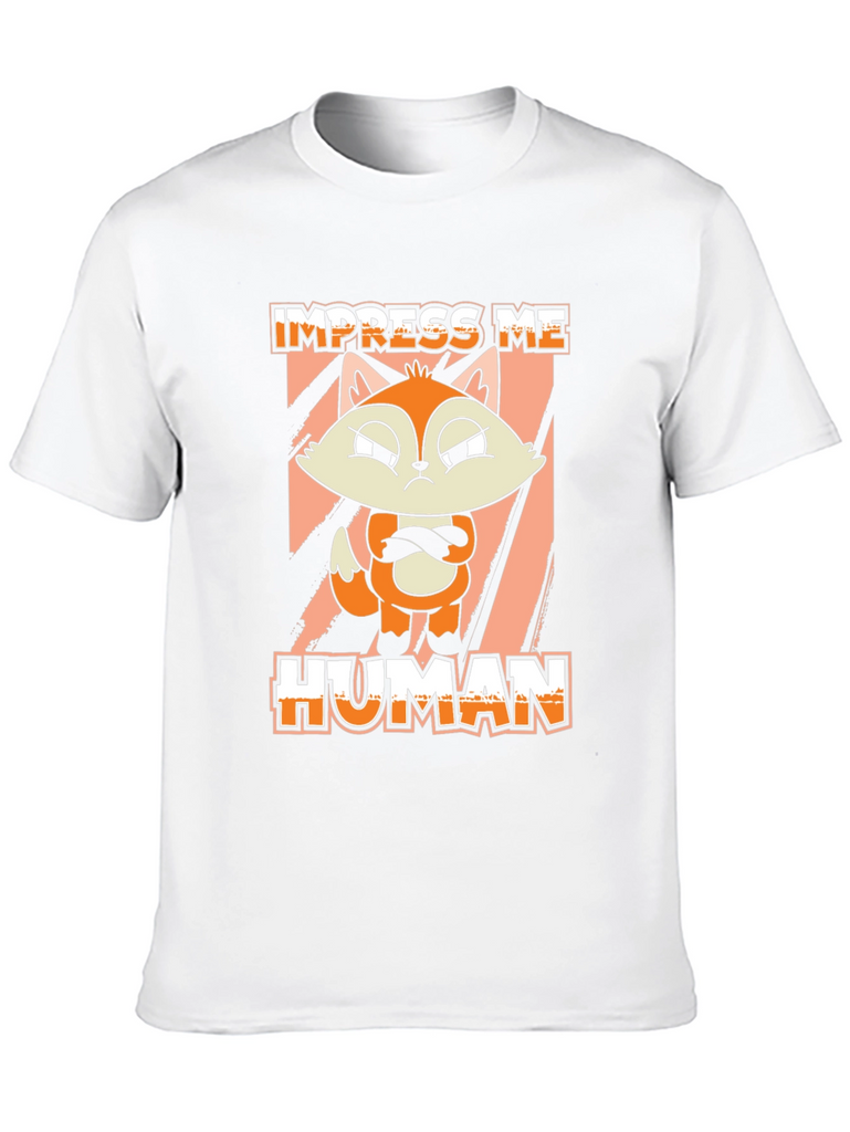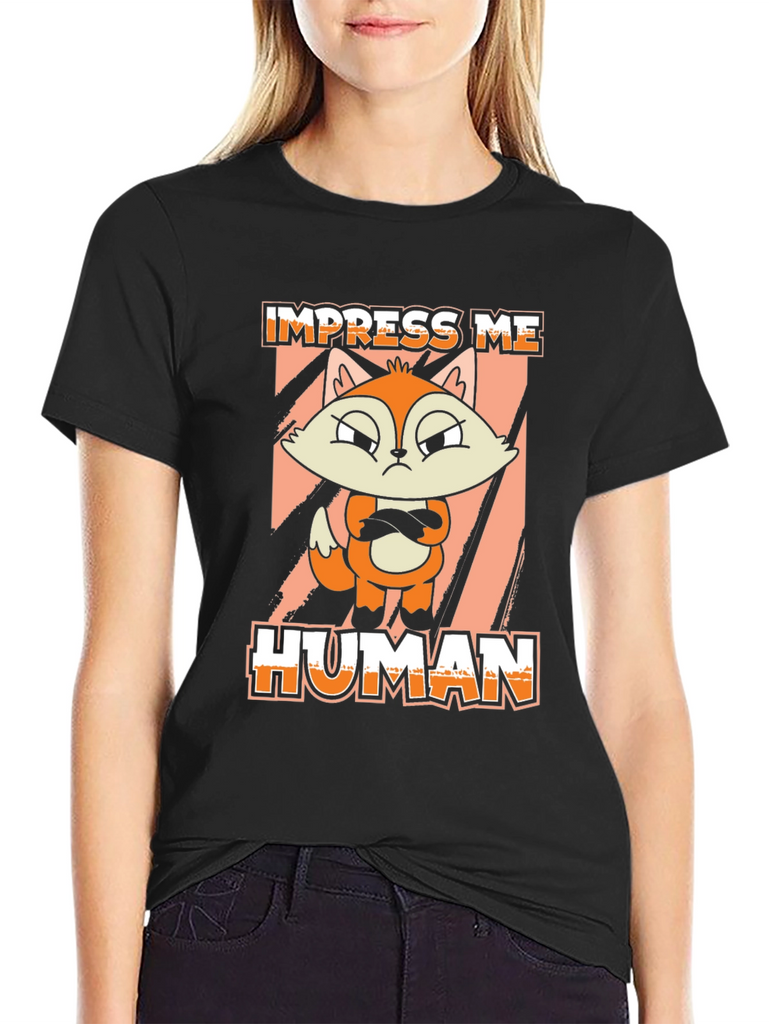 Show off your sassy side with this black graphic tee featuring a cartoon fox with an unimpressed expression! The humorous design with the text "Impress Me Human" makes it a fun conversation starter. Perfect for casual wear, this t-shirt is made from a soft-looking fabric that appears comfortable for everyday use. The vibrant colors of the graphic contrast nicely against the black background, ensuring the design pops. Whether you're a fan of foxes or just love quirky apparel, this tee is a must-have addition to your wardrobe. Rock it with jeans or shorts for a relaxed and stylish look.