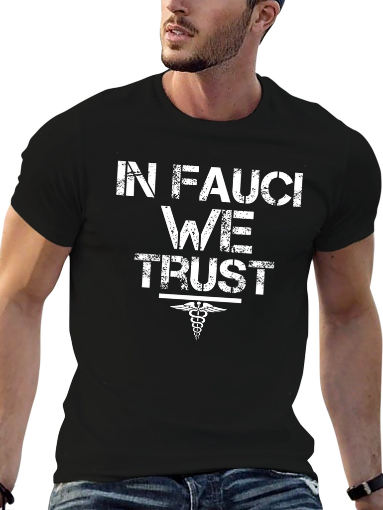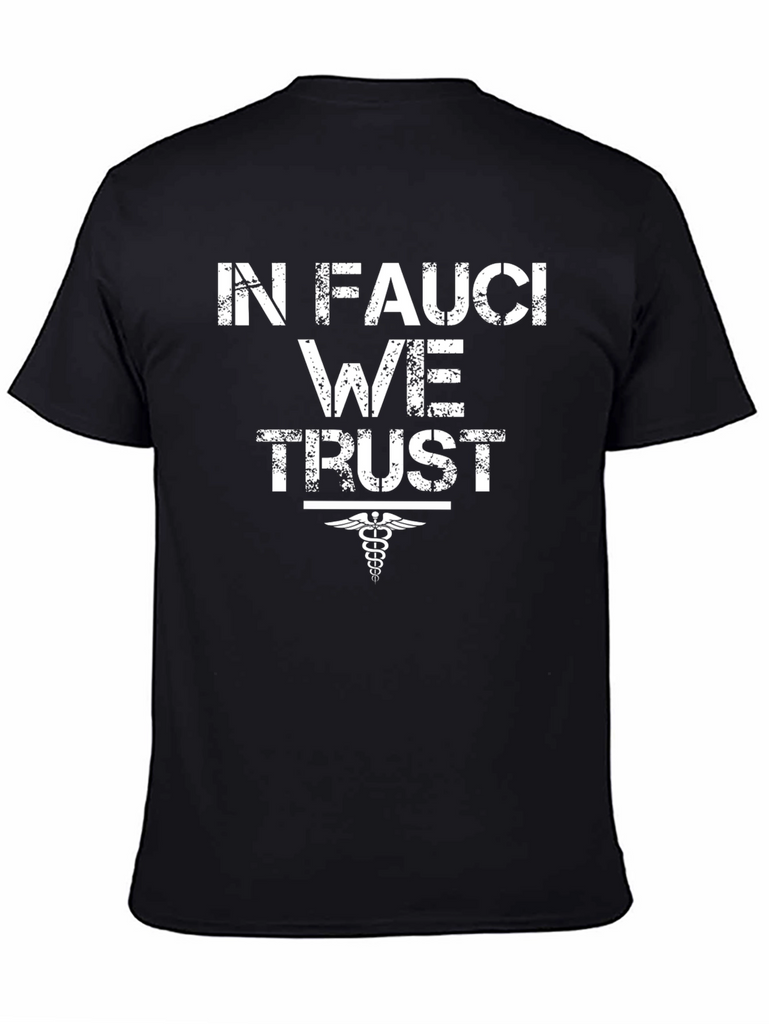 Show your support with this bold 'In Fauci We Trust' graphic t-shirt. This black tee features distressed white lettering with a medical caduceus symbol, creating a striking contrast. Made from a comfortable-looking fabric, this short-sleeve shirt is perfect for everyday wear and makes a statement about trust in medical expertise. The classic fit ensures a relaxed and stylish look. Wear it to rallies, events, or simply as a conversation starter. A unique piece for those who want to express their beliefs. Get yours today!