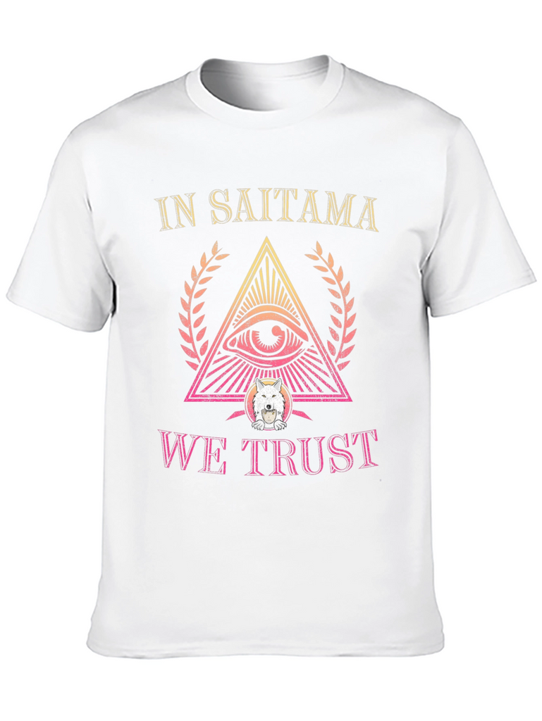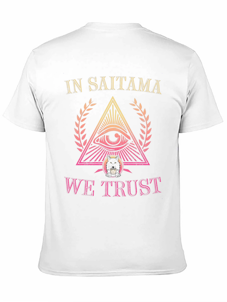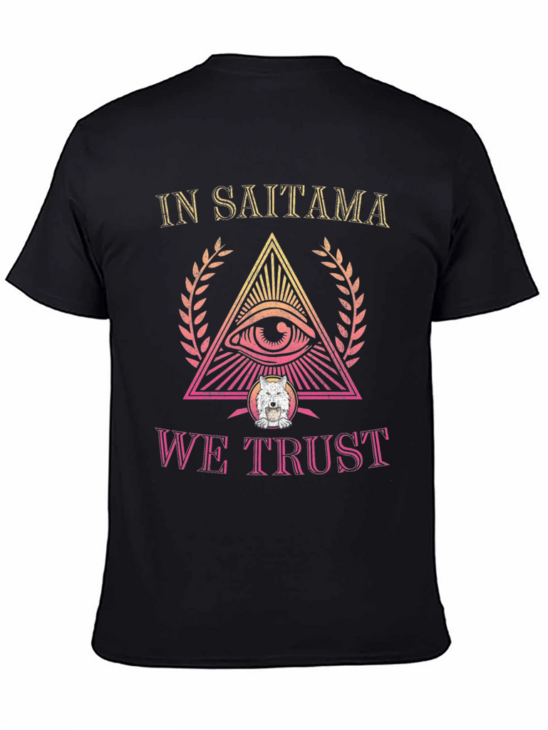 Embrace quirky style with this black graphic tee. The design features an eye in a triangle surrounded by leaf wreaths, along with a cartoon wolf. 'IN SAITAMA WE TRUST' is printed above and below the triangle. The colors transition from pink to yellow, creating an eye-catching focal point. Made from comfortable fabric, this tee is perfect for casual outings, fandom events, or everyday wear. Show off your unique taste with this standout piece. Great for fans looking for something original.