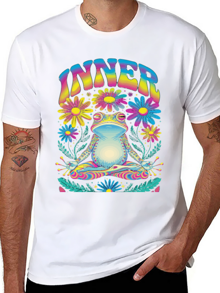 Embrace your inner zen with this unique graphic tee! The shirt features a vibrant design of a meditating frog surrounded by colorful flowers, all under the word "INNER" in a groovy, psychedelic font. Made from a comfortable, soft fabric, this tee is perfect for adding a touch of whimsy and mindfulness to your everyday style. Wear it to yoga class, while relaxing at home, or out and about to spread a message of peace and tranquility. It's a statement piece that's both stylish and comfortable.