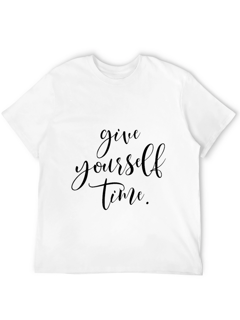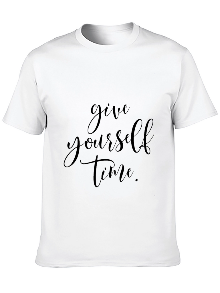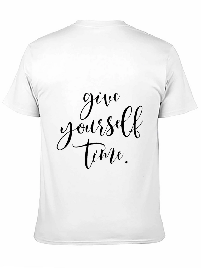 This classic black t-shirt features an inspirational message, "Give yourself time." The shirt's design is simple yet stylish, making it versatile for various casual occasions. The inscription is elegantly printed across the chest, serving as a gentle reminder to practice patience and self-care. Crafted from what appears to be a soft and comfortable fabric, this tee promises all-day wearability. Ideal for everyday wear, gym sessions, or relaxed weekends, this t-shirt combines comfort with a positive message. Pair it with jeans, shorts, or joggers for a laid-back look that speaks volumes. This t-shirt is a must-have for those who appreciate meaningful fashion and subtle reminders to prioritize their well-being.