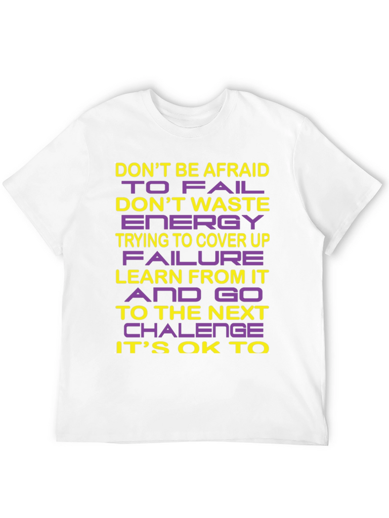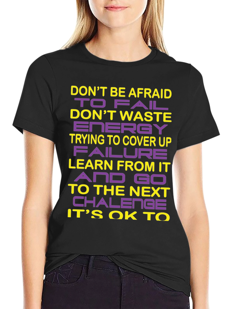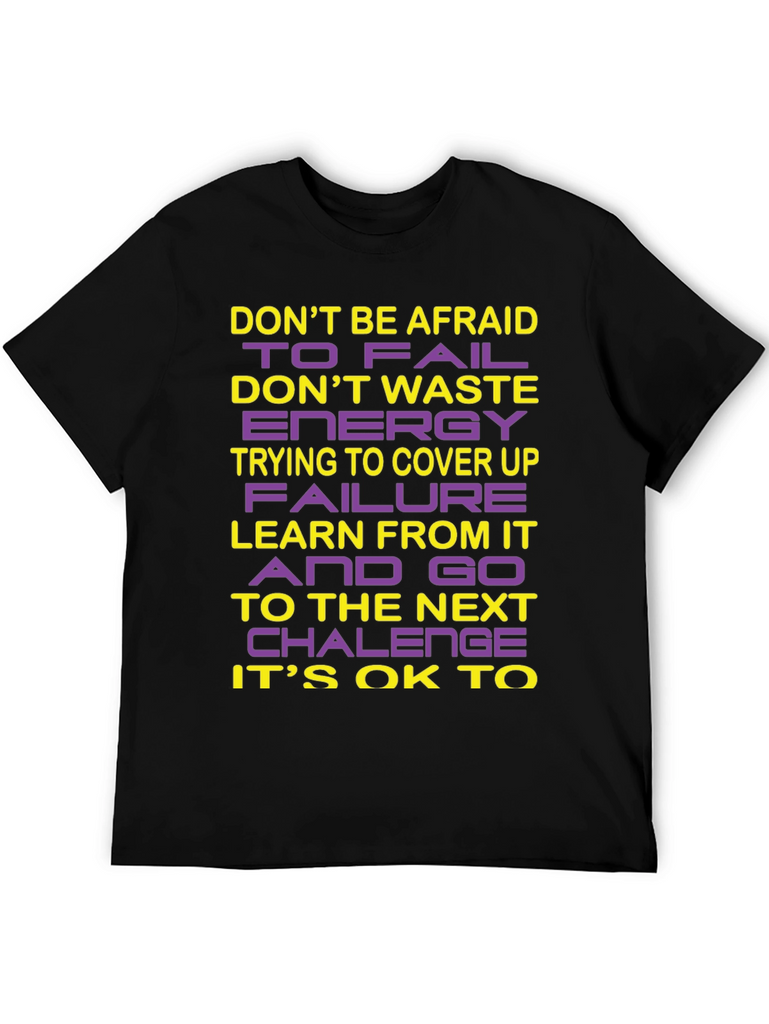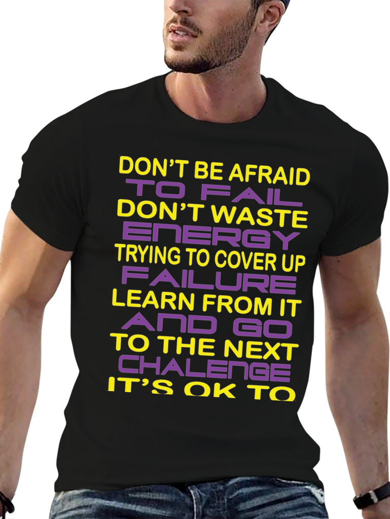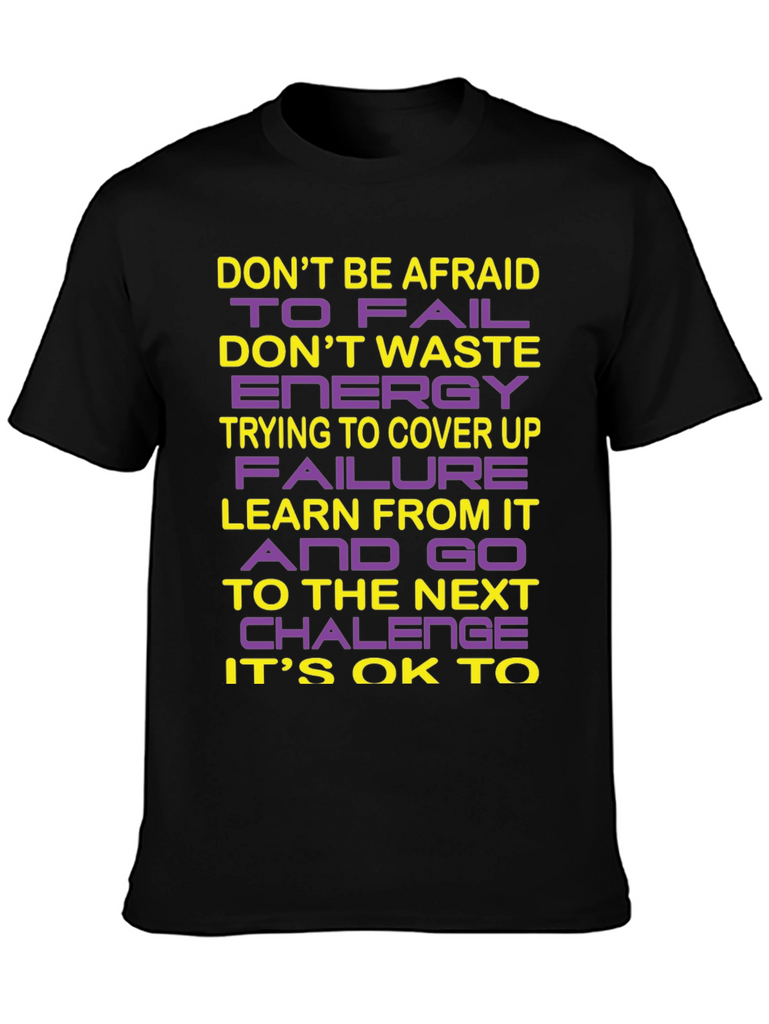 This striking black crew neck t-shirt features a bold, inspirational message designed to motivate and uplift. The words "DON'T BE AFRAID TO FAIL", "DON'T WASTE ENERGY TRYING TO COVER UP FAILURE", "LEARN FROM IT AND GO TO THE NEXT CHALLENGE", and "IT'S OK TO" are emblazoned across the chest in a combination of yellow and purple lettering. The design encourages a positive attitude towards challenges and personal growth. Crafted from a soft, breathable fabric, this t-shirt offers both comfort and style, making it perfect for everyday wear. Whether you're hitting the gym, running errands, or simply relaxing at home, this shirt is a stylish reminder to embrace failure as a learning opportunity. Wear your ambition with pride!