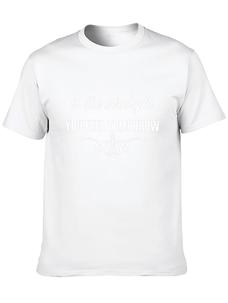 Showcase inner strength with this classic black t-shirt. Featuring a crisp white inspirational message, "is the strength YOU FEEL TOMORROW", it is designed to offer both comfort and style. The elegant font and decorative flourish add a touch of sophistication, making it perfect for everyday wear or a casual outing. Made from comfortable fabric, this versatile tee pairs well with jeans, shorts, or even layered under a jacket. Let this t-shirt be a reminder of your personal strength and resilience, as you confidently move forward in the world.