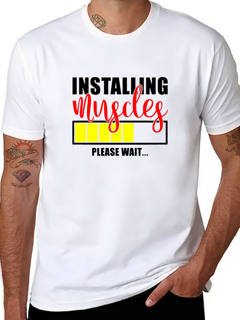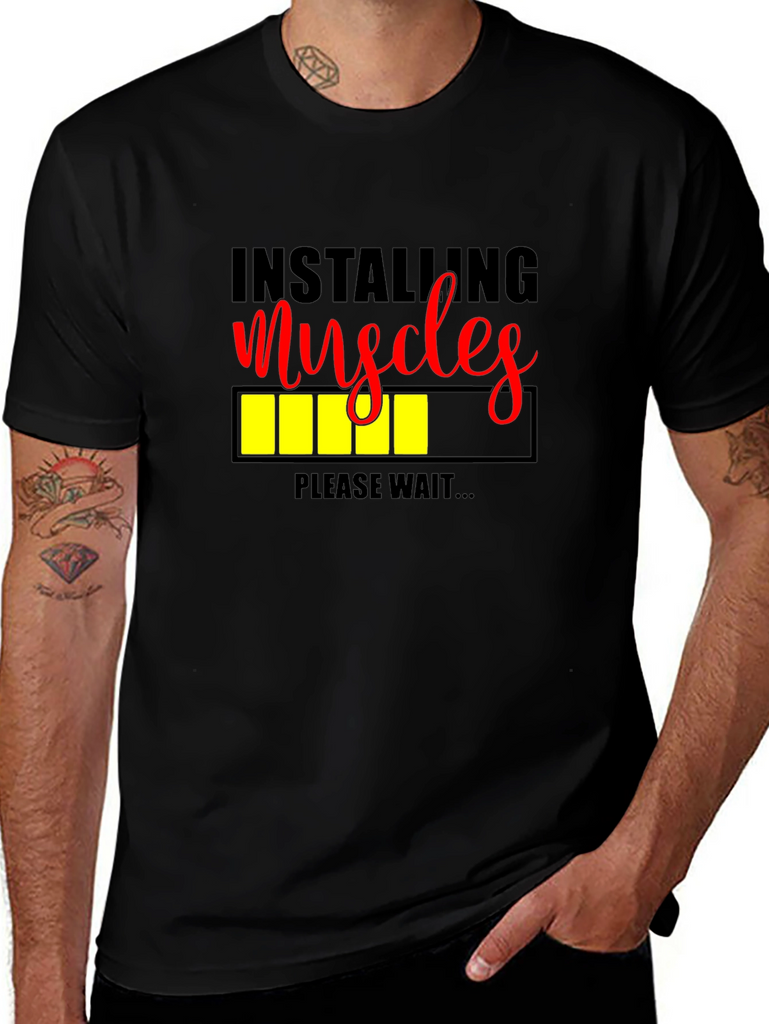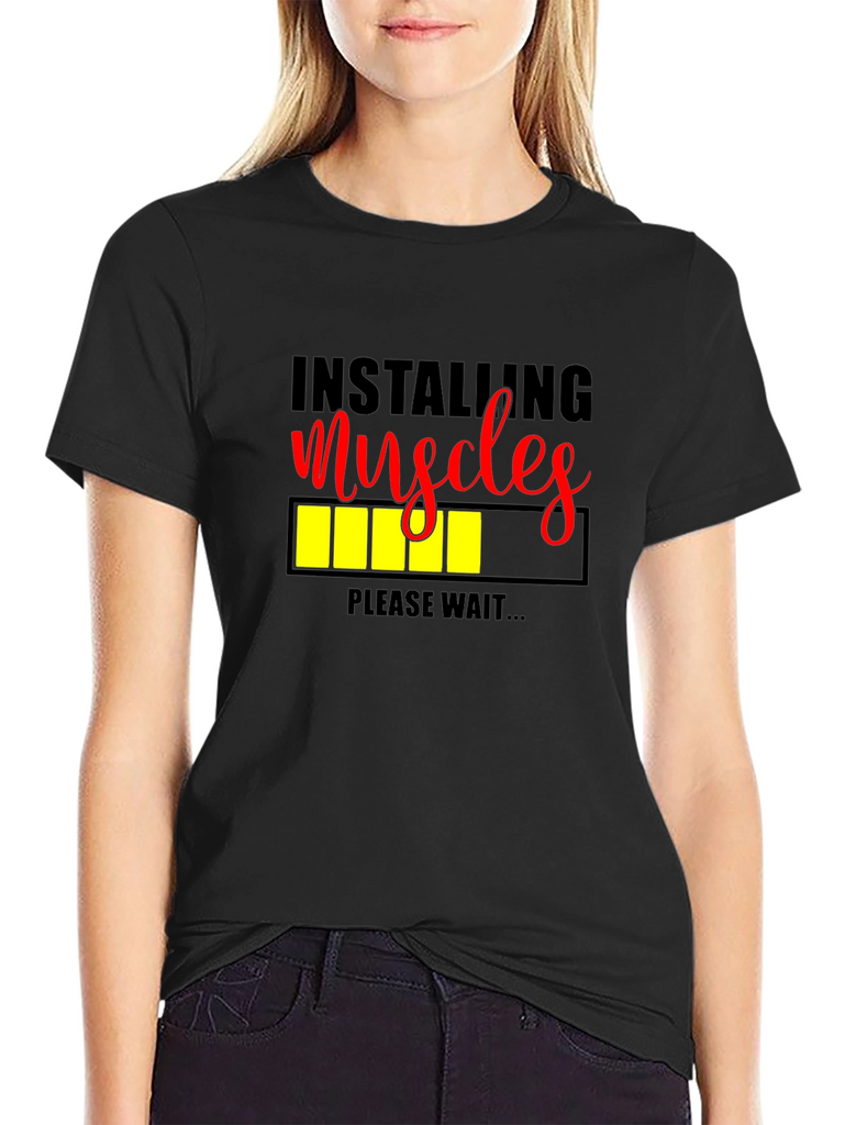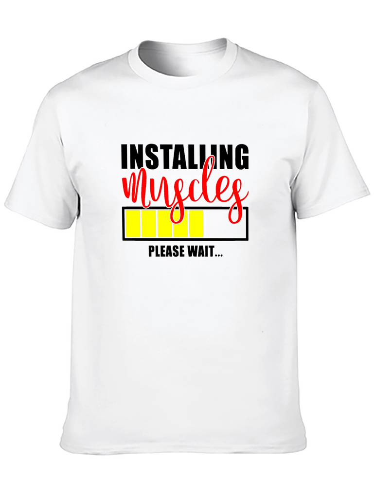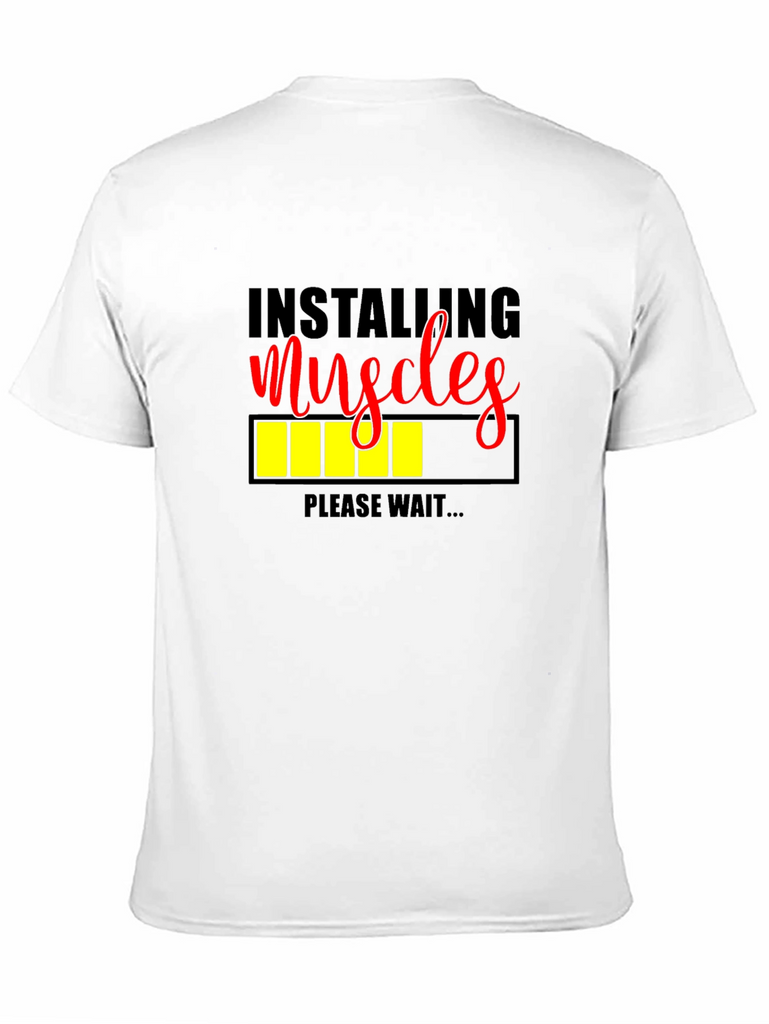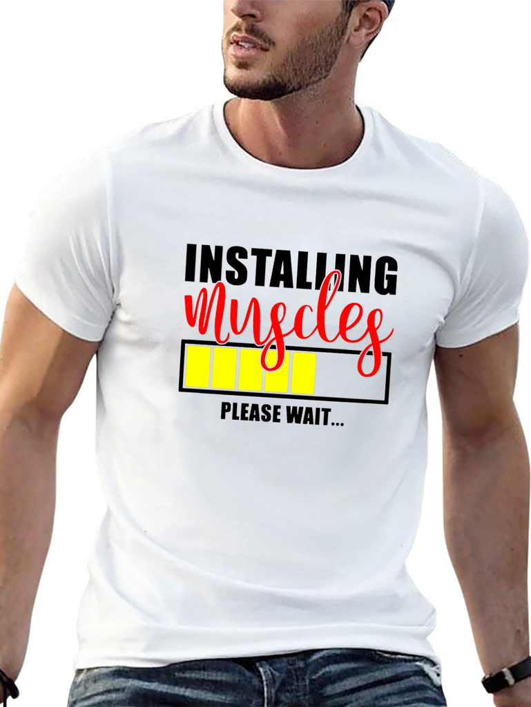 Show off your dedication to fitness with this eye-catching graphic t-shirt. Featuring a humorous "Installing Muscles... Please Wait..." design with a progress bar graphic, this shirt is perfect for gym-goers and fitness enthusiasts. The bold design is printed on a classic black tee, providing a stylish and comfortable fit. Made from soft, breathable fabric, this shirt is ideal for workouts or casual wear. Get yours today and let everyone know you're dedicated to building that dream body!