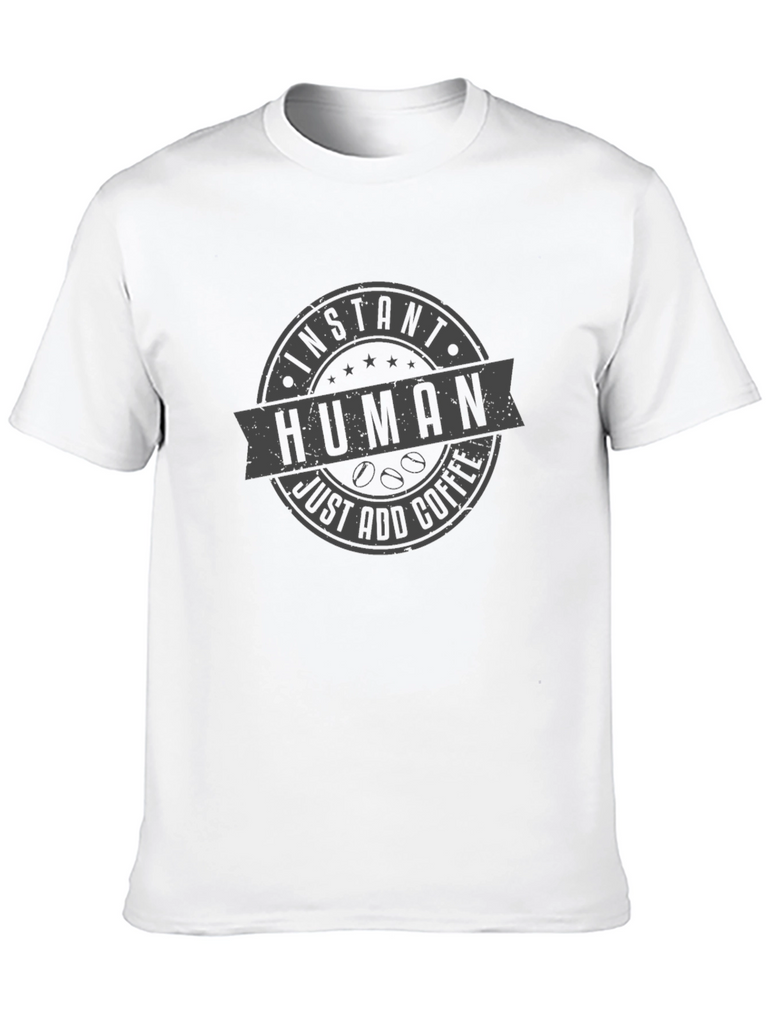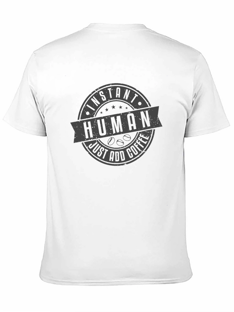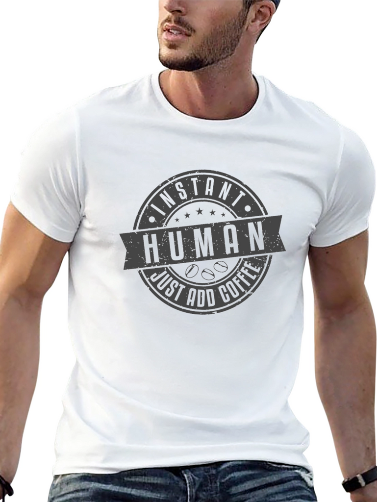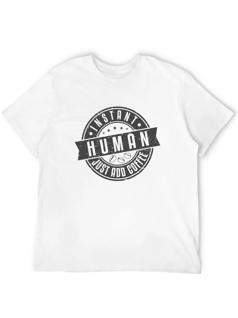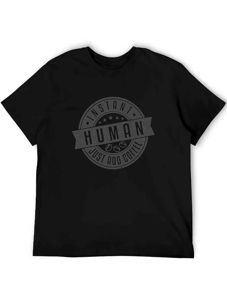 This black t-shirt features a bold, circular graphic design with the phrase "INSTANT HUMAN" prominently displayed across a banner. The text "JUST ADD COFFEE" completes the design, accompanied by stylized coffee bean icons. Crafted from a comfortable fabric, this tee is perfect for coffee lovers who want to showcase their caffeinated spirit. Its casual style makes it ideal for everyday wear. Whether you're heading to your favorite coffee shop or just relaxing at home, this shirt is sure to make a statement and spark conversations. A fun and quirky addition to any wardrobe.