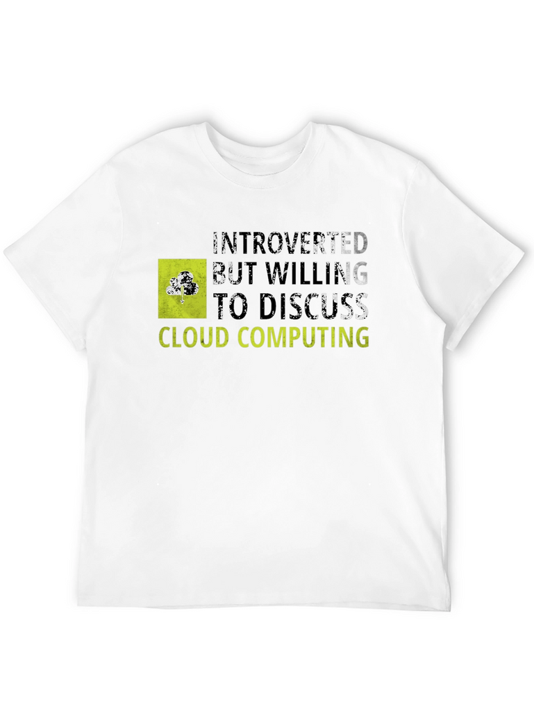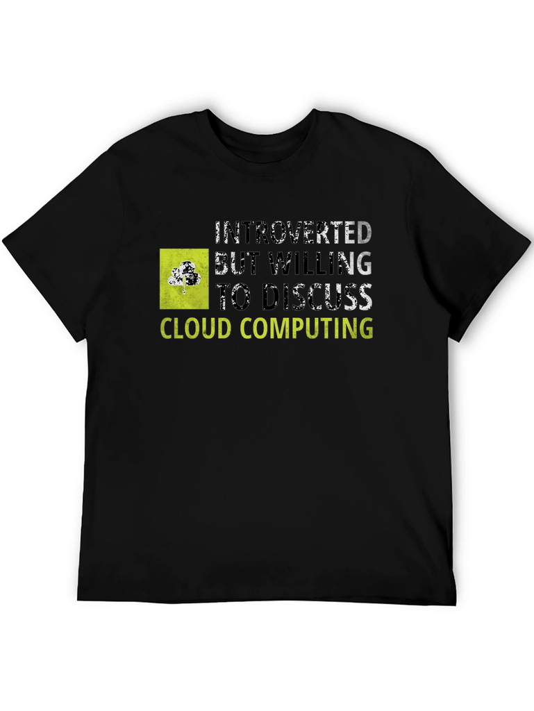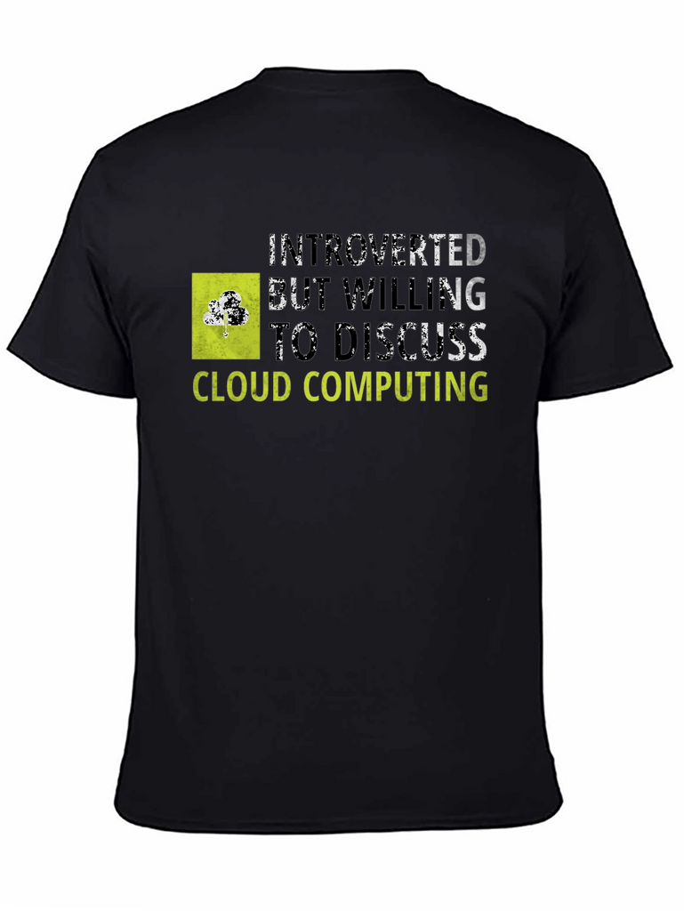 This black t-shirt features a unique design for introverted tech enthusiasts. The graphic includes the text "Introverted but Willing to Discuss Cloud Computing" in a distressed, edgy font. A cloud icon set against a green square adds a visual element related to the computing theme. The shirt has a classic crew neck and short sleeves, making it a comfortable fit for everyday wear. Perfect for casual outings, tech meetups, or simply lounging at home, this t-shirt lets you express your personality and passion for cloud technology. It's a conversation starter for fellow IT professionals or anyone interested in the world of computing. The design blends humor and technical interest, making it a standout piece in any wardrobe. Show off your introverted side with this fun and unique tee!