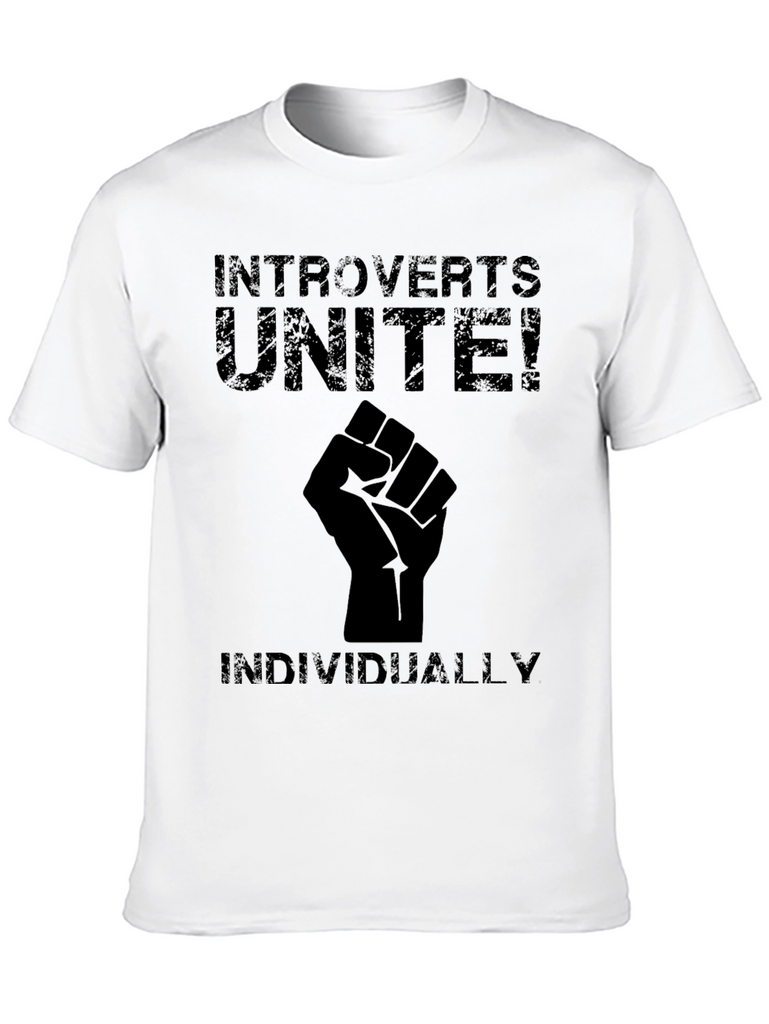 Make a statement with this bold black t-shirt featuring the phrase "Introverts Unite!" above a raised fist graphic, followed by "Individually." in a matching distressed font. Crafted from comfortable material, this tee is perfect for expressing your unique personality and sense of humor. The design is simple yet eye-catching, making it a versatile addition to any casual wardrobe. Wear it to social gatherings, lounging at home, or as a conversation starter wherever you go. This t-shirt is a must-have for introverts with a sense of humor.