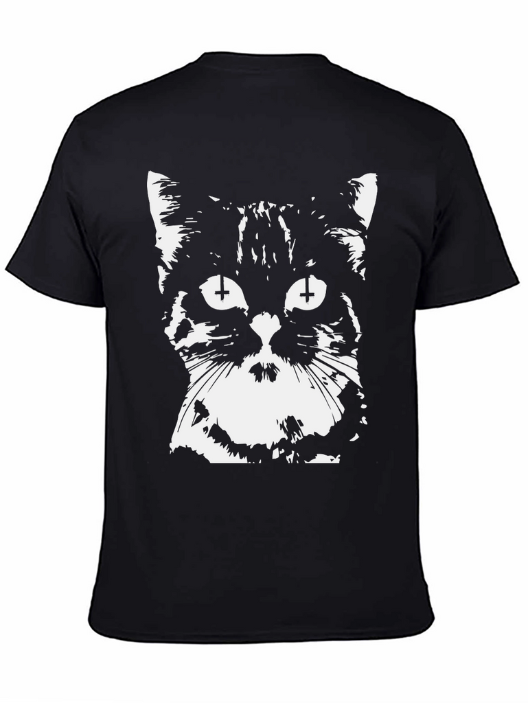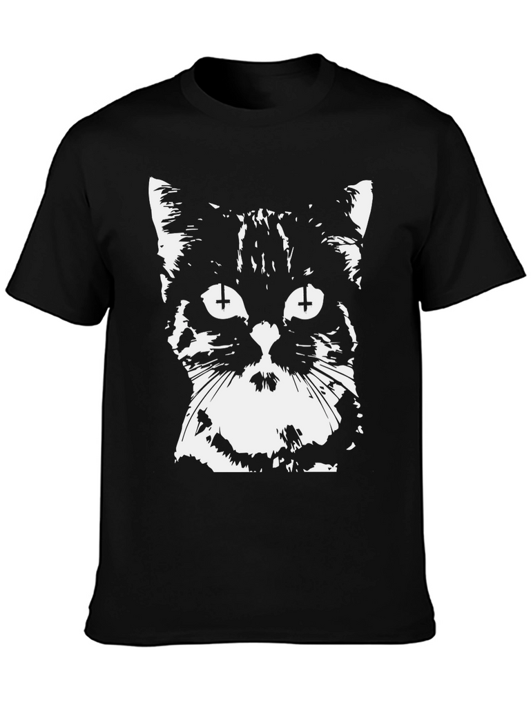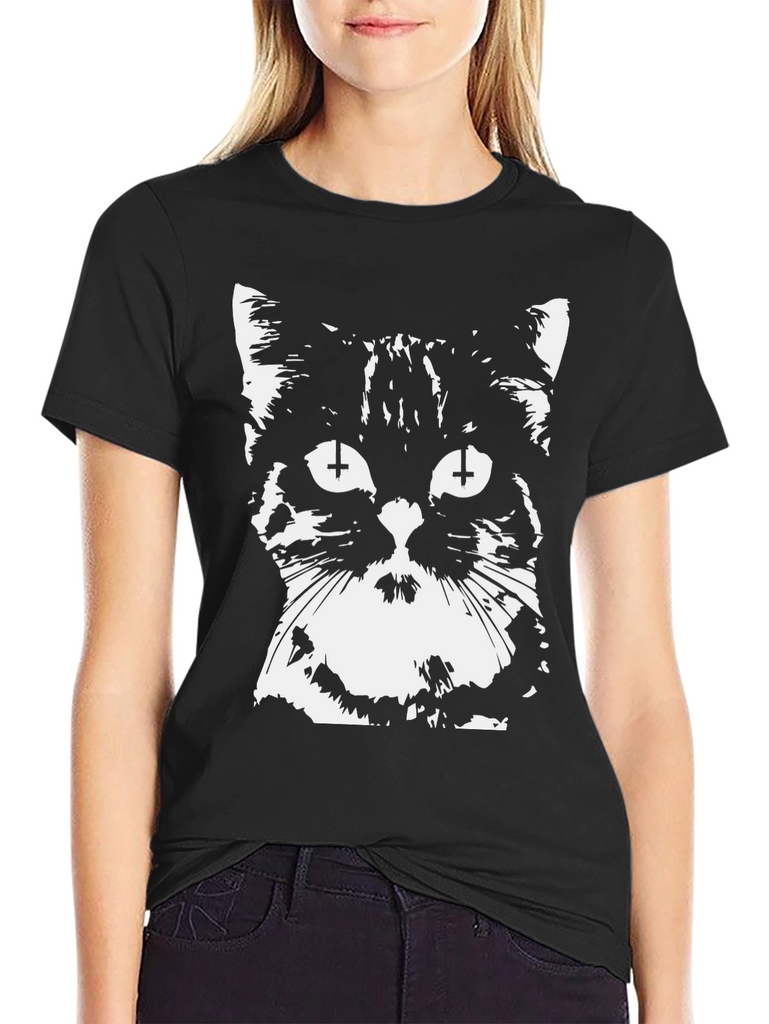 Unleash your edgy side with this bold black t-shirt featuring a striking graphic of a cat with inverted cross eyes. The high-contrast design makes a powerful statement, perfect for expressing a unique sense of style. Made from a comfortable, breathable fabric, this tee is ideal for everyday wear or a night out. Its versatile design pairs well with jeans, shorts, or a skirt, making it a must-have addition to any wardrobe. Wear your individuality with confidence and let this eye-catching t-shirt do the talking.