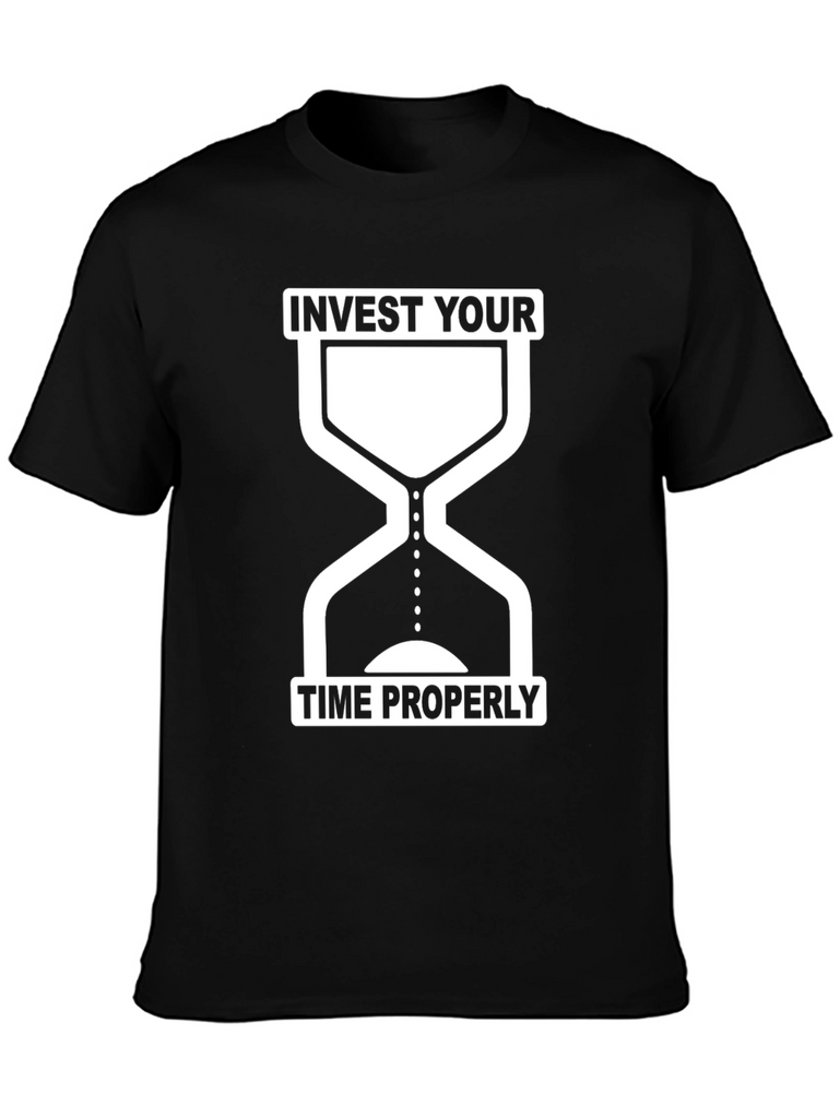 This stylish black t-shirt features a unique graphic design of an hourglass with the words "INVEST YOUR" above it and "TIME PROPERLY" below. The clean, white print creates a striking contrast against the dark fabric. Made from a soft-looking material, this tee appears comfortable for everyday wear. This shirt makes a statement about valuing your time and priorities. It's ideal for casual outings, workouts, or even as a conversation starter. The hourglass design suggests a focus on making the most of each moment. Whether you're a student, professional, or simply someone who appreciates thoughtful design, this t-shirt is a perfect addition to your wardrobe.