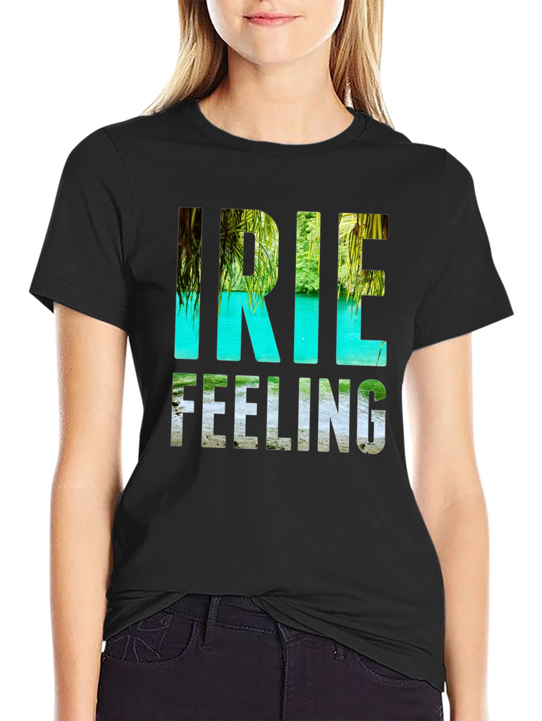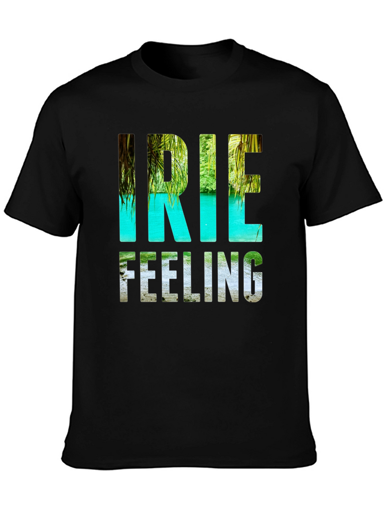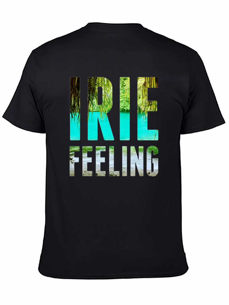 Embrace the island life with this stylish black t-shirt featuring the vibrant "Irie Feeling" graphic. The design captures the essence of paradise with a lush tropical landscape incorporated into the lettering. Made from a soft, comfortable fabric, this tee is perfect for casual wear and those who appreciate laid-back vibes. Ideal for vacations, beach days, or simply adding a touch of summer to your everyday wardrobe. Make a statement and share the "Irie Feeling" wherever you go!