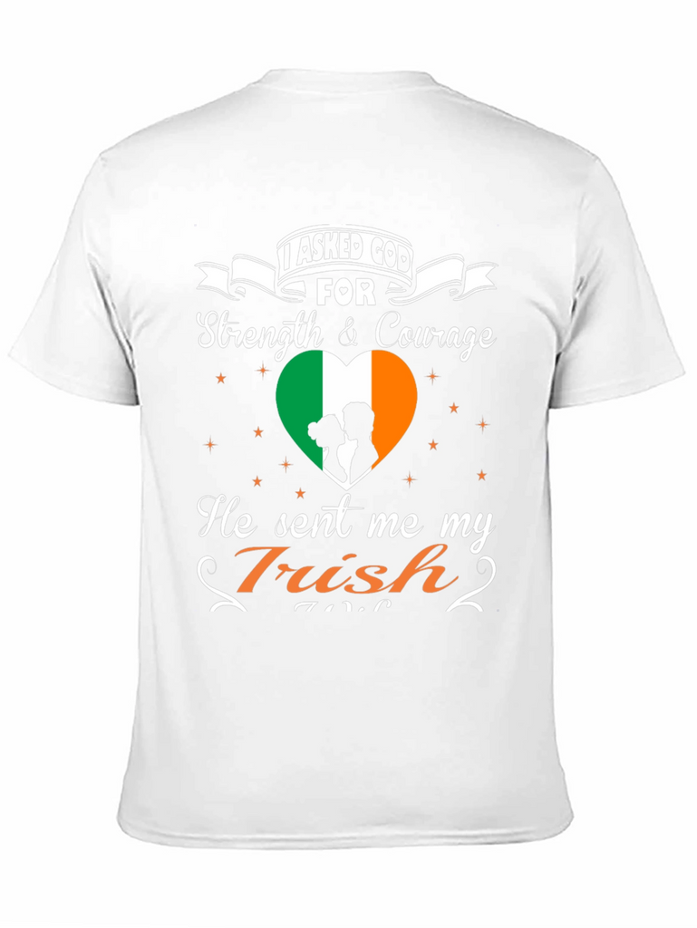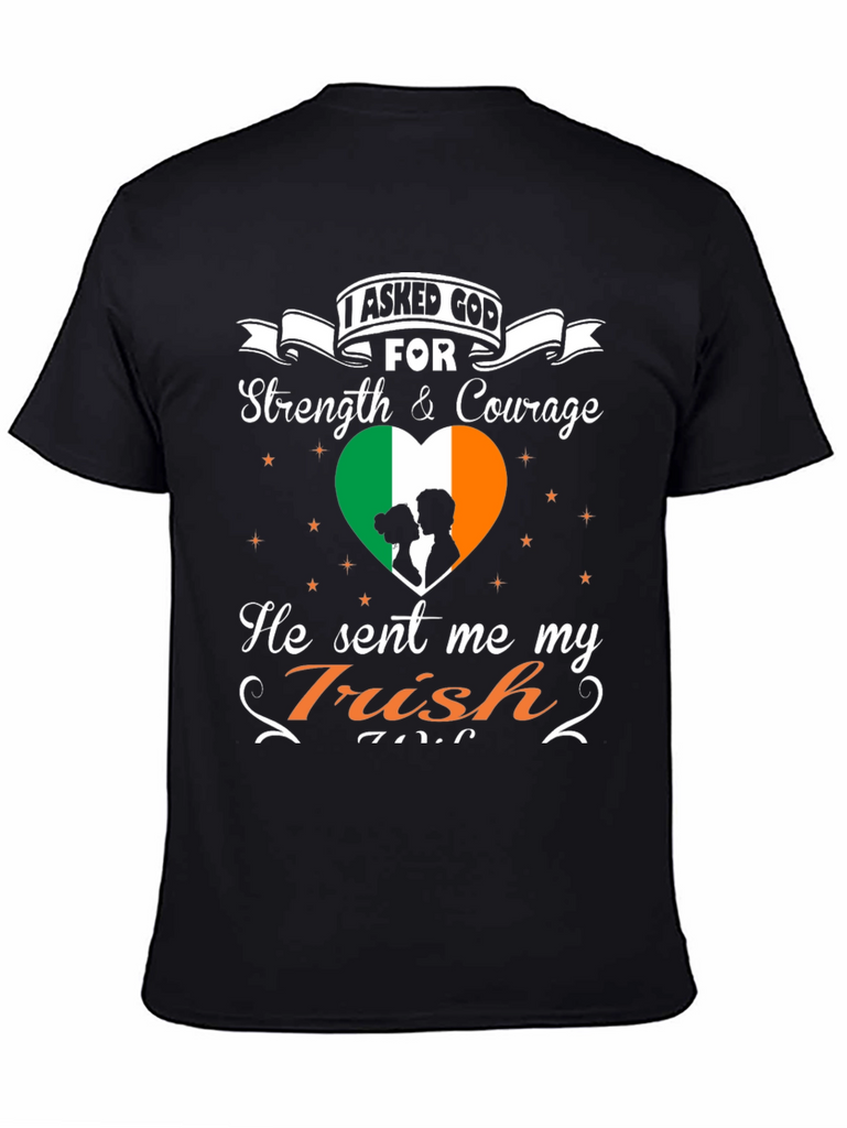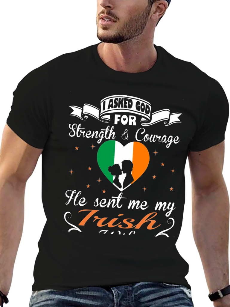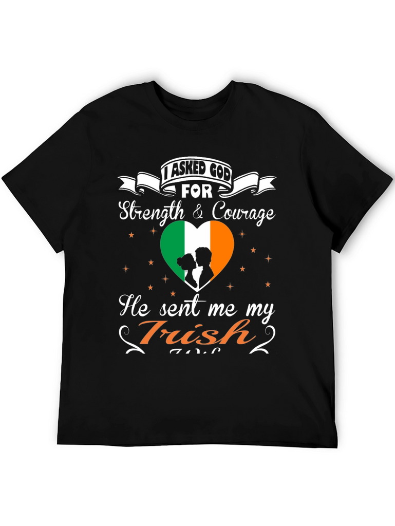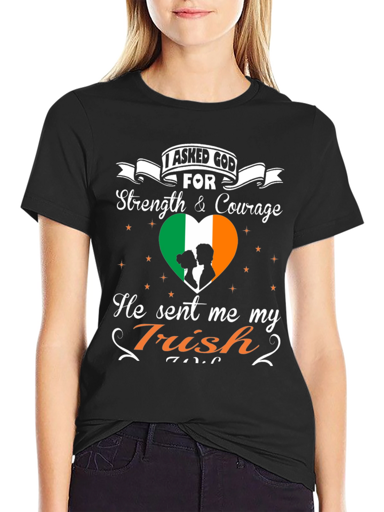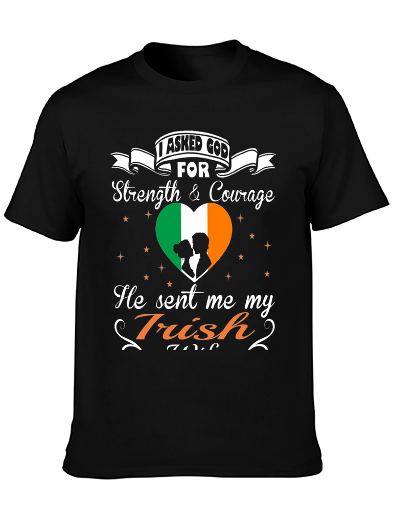 Show your Irish pride with this unique graphic tee! The black t-shirt features a bold design that reads "I Asked God for Strength & Courage. He sent me my Irish". A heart in the colors of the Irish flag with a silhouette of a couple adds a touch of romance. Made from comfortable material, this shirt is perfect for St. Patrick's Day, Irish heritage celebrations, or everyday wear to display your love. This tee is more than just clothing; it's a declaration of love and heritage.