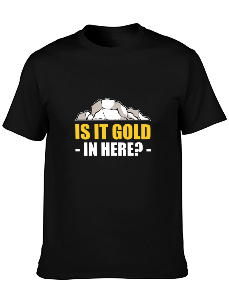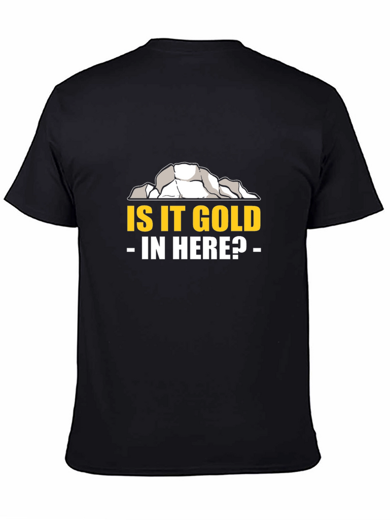 This black t-shirt features a humorous graphic design. At the top is an illustration of gray and white rock or ore, suggesting a mining theme. Below that, the phrase "IS IT GOLD - IN HERE?" is printed in bold yellow letters with white dashes flanking "IN HERE?". The shirt appears to be made of soft, comfortable cotton material. The design makes it suitable for casual wear. Show off your sense of humor with this eye-catching tee. It’s a perfect choice for those who love mining or just quirky clothing. Great gift idea!