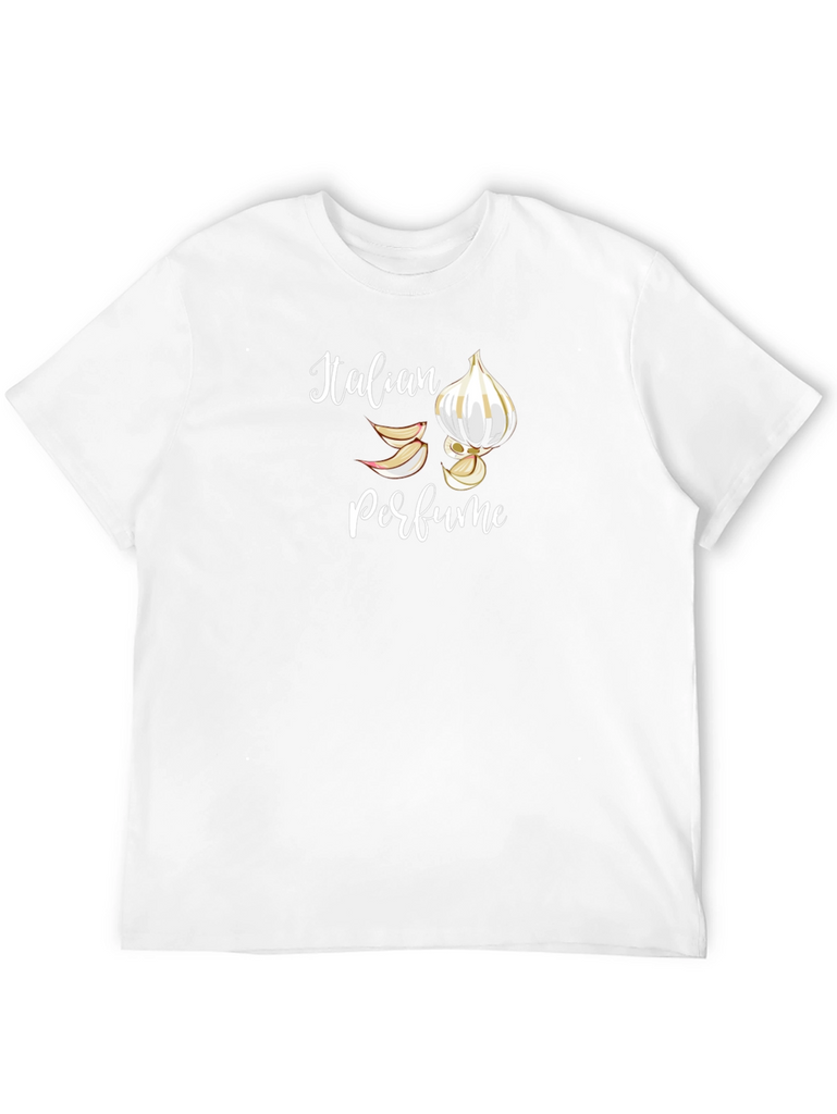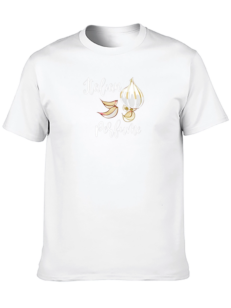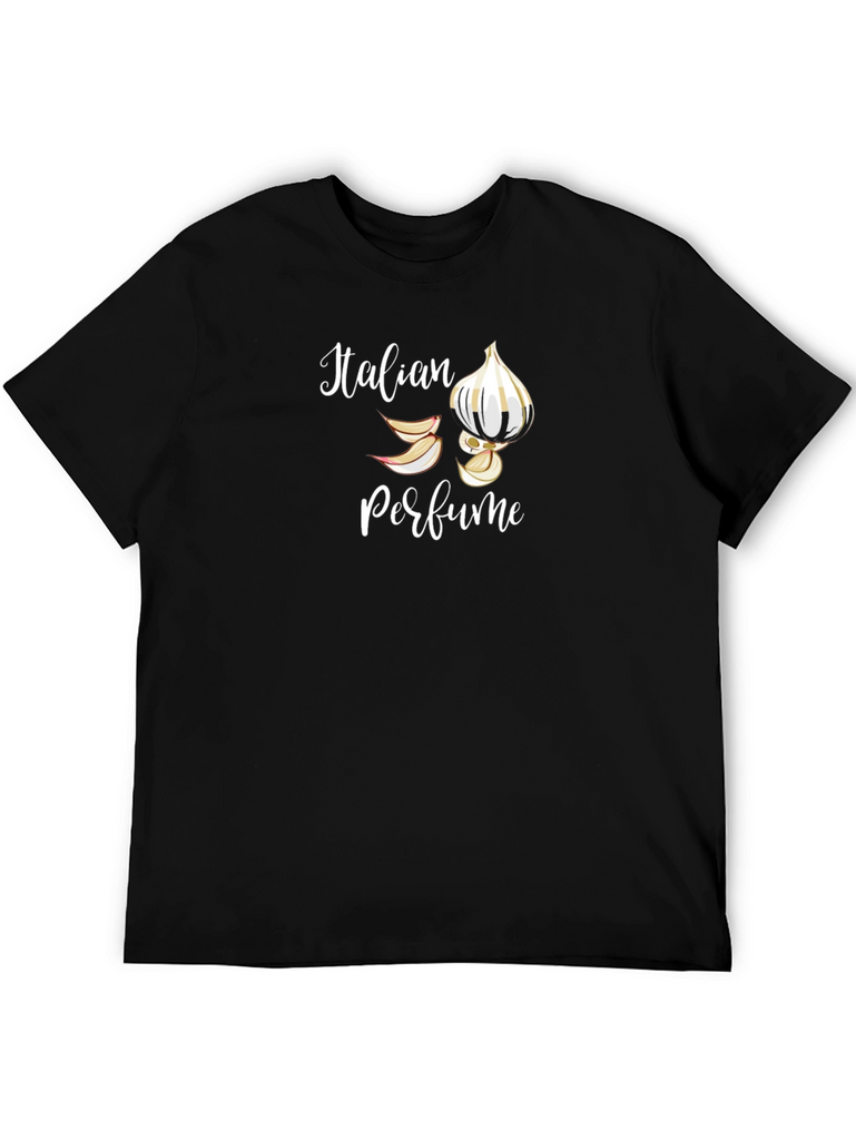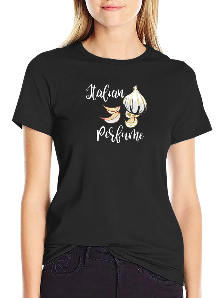 Show off your quirky sense of humor with this unique "Italian Perfume" T-shirt. The black, crew-neck tee features a playful graphic of garlic cloves. Made from what appears to be comfortable, breathable cotton, this shirt is perfect for casual wear. The fun, eye-catching design makes it a great conversation starter and a fantastic addition to any wardrobe. Ideal for garlic lovers, Italian food enthusiasts, or anyone with a playful sense of style, this tee adds a touch of humor to your everyday look. Grab yours and make a statement!