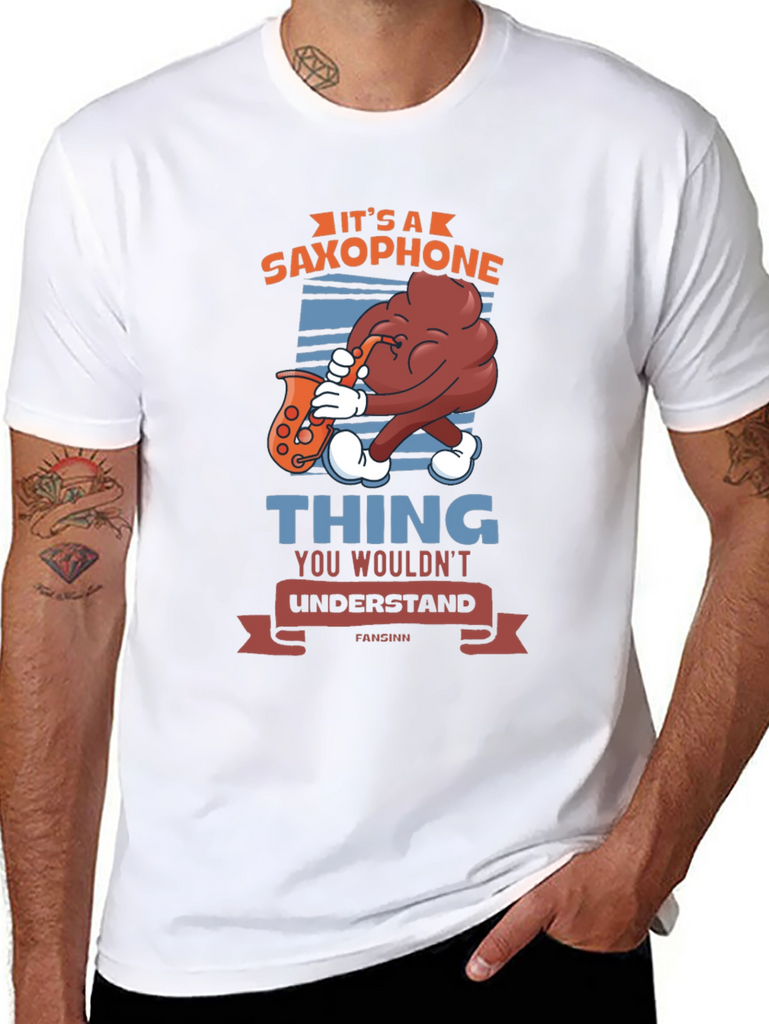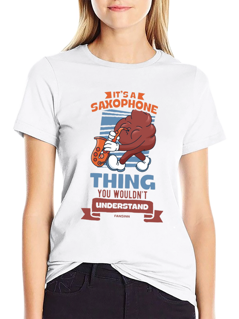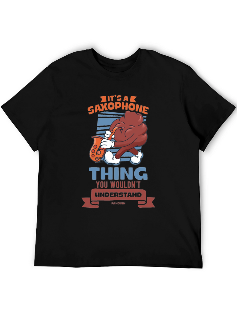This black t-shirt features a playful and eye-catching graphic. A cartoon figure, resembling a piece of feces, is depicted playing a saxophone. Above the cartoon image, the text reads "IT'S A SAXOPHONE". Below the cartoon, the text says "THING YOU WOULDN'T UNDERSTAND". Underneath this phrase is the word "FANSINN", all on a banner. The design is printed with vibrant colors, making it stand out against the black backdrop of the shirt. Made from a comfortable-looking fabric, this t-shirt is perfect for saxophone players, music lovers, or anyone with a quirky sense of humor. Wear it casually, to concerts, or to make a statement wherever you go.