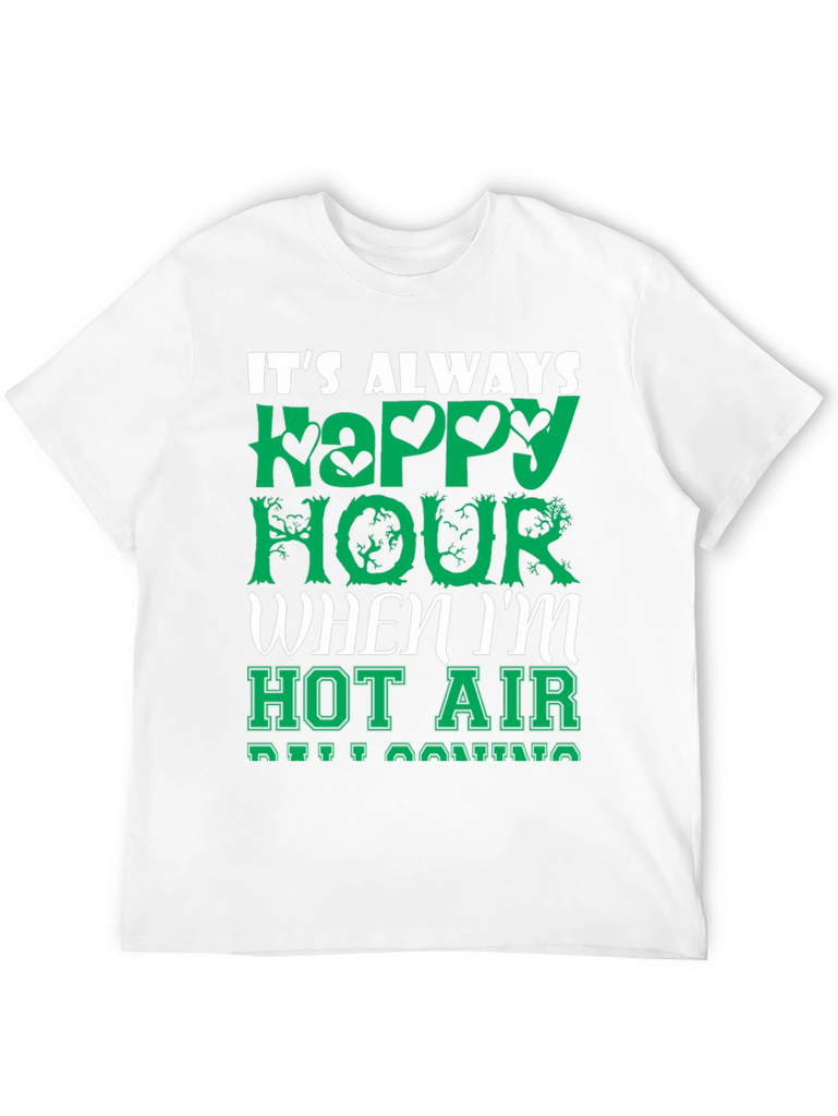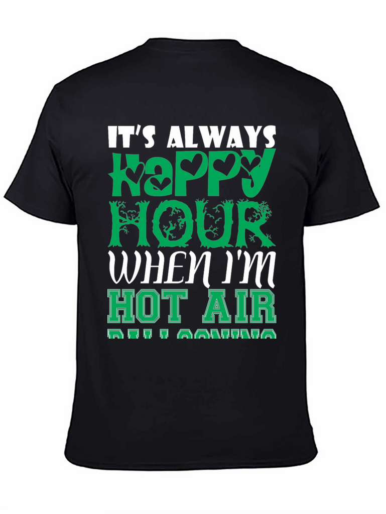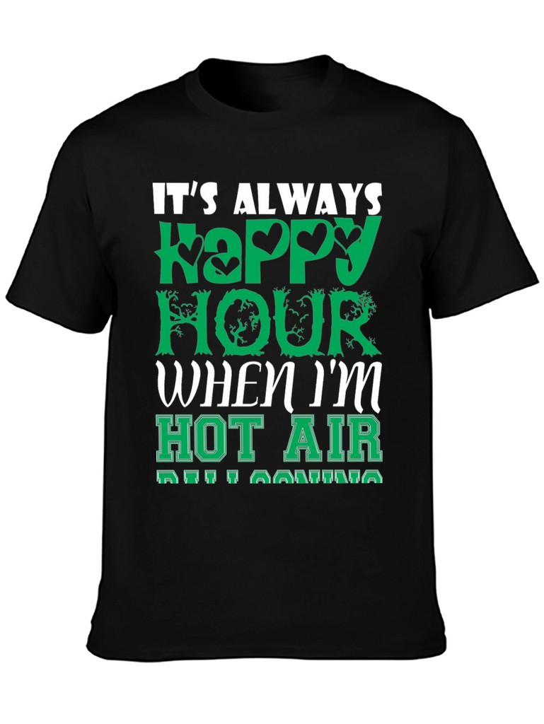 Show off your fun personality with this black t-shirt! Featuring the words "It's Always Happy Hour When I'm Hot Air Ballooning" in a combination of white and green lettering, this shirt is sure to get some laughs. The words "Happy" and "Hour" are stylized with heart and tree designs, respectively. It's the perfect conversation starter for casual events, parties, or just lounging around. The comfortable fit and breathable fabric make it ideal for all-day wear. Get ready to spread some smiles with this unique and eye-catching tee!