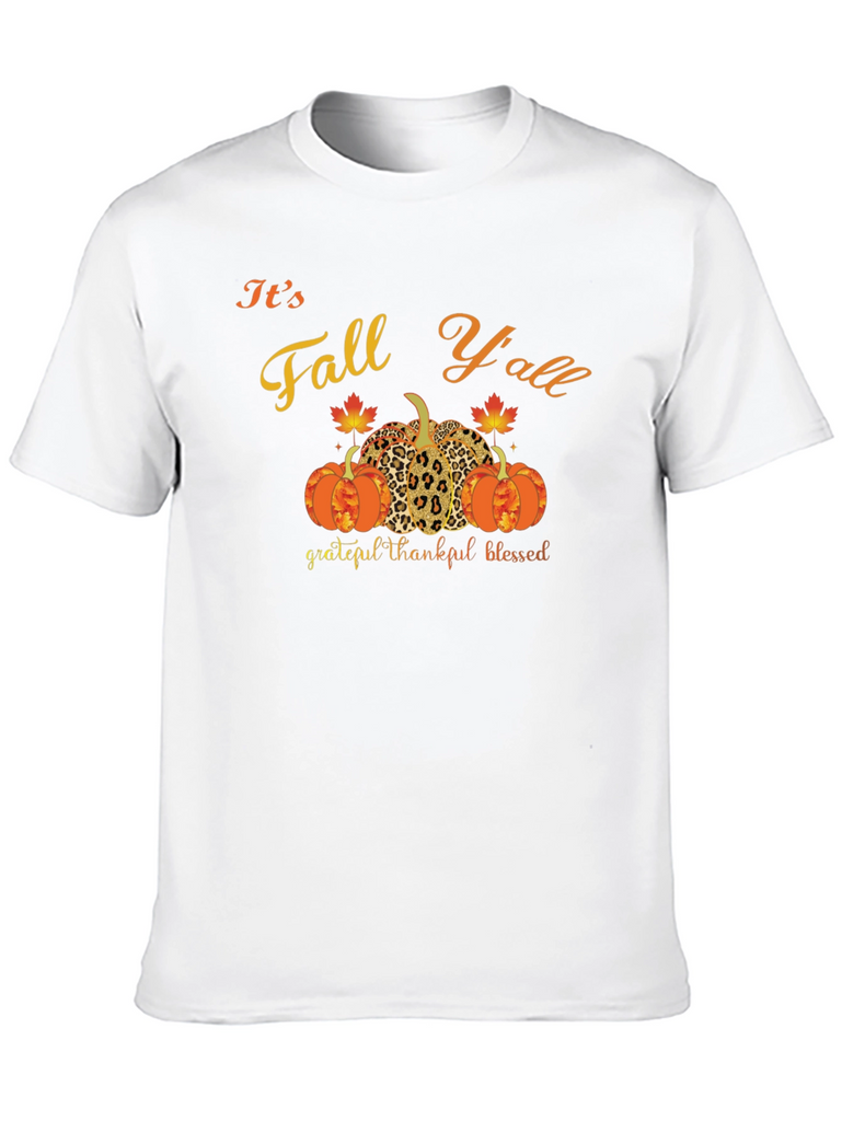 Celebrate the autumn season with this stylish black t-shirt featuring a festive "It's Fall Y'all" graphic. The design includes three vibrant pumpkins, one with a unique leopard print, and colorful maple leaves. Below, the words "grateful, thankful, blessed" add a touch of heartwarming sentiment. Made from comfortable and breathable fabric, this t-shirt is perfect for casual wear during the fall season. Whether you're heading to a pumpkin patch, a Thanksgiving gathering, or simply enjoying the crisp autumn air, this t-shirt is sure to put you in the fall spirit. Show off your love for all things autumn with this charming and comfortable tee.