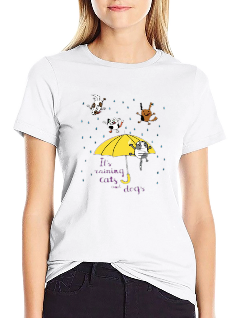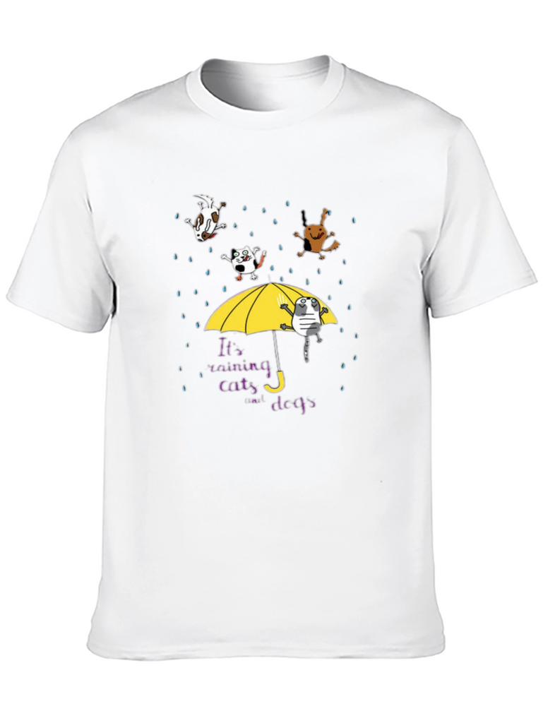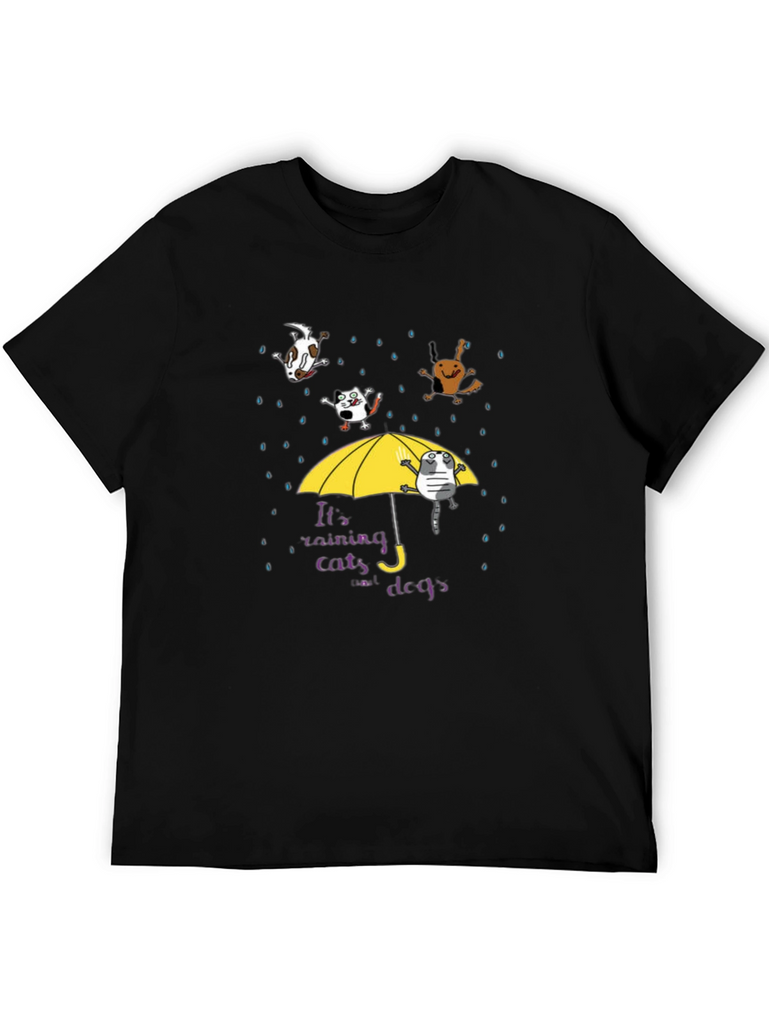 Stay dry and stylish with this unique black t-shirt featuring a playful "It's Raining Cats & Dogs" design! The graphic showcases cartoon-style cats and dogs amidst blue raindrops, with one savvy feline taking shelter under a bright yellow umbrella. Made from a comfortable-looking fabric, this tee is perfect for casual wear, showcasing your love for animals and lighthearted humor. Whether you're heading out for errands or relaxing at home, this t-shirt adds a fun twist to any outfit. A great conversation starter and a must-have for pet lovers!