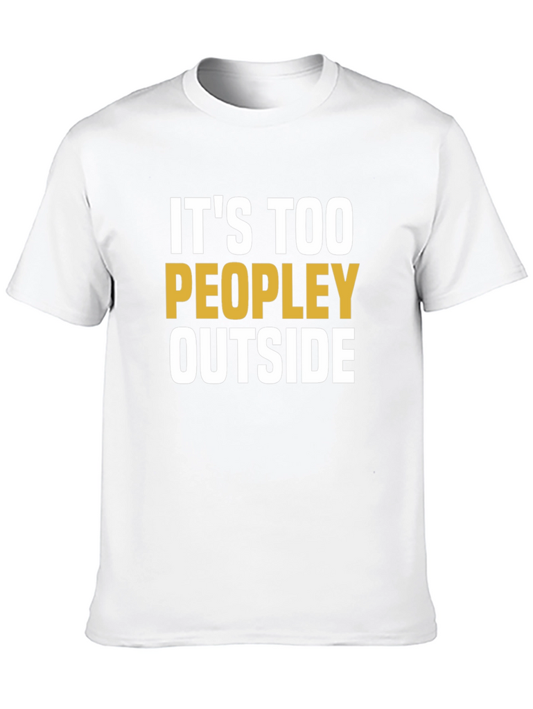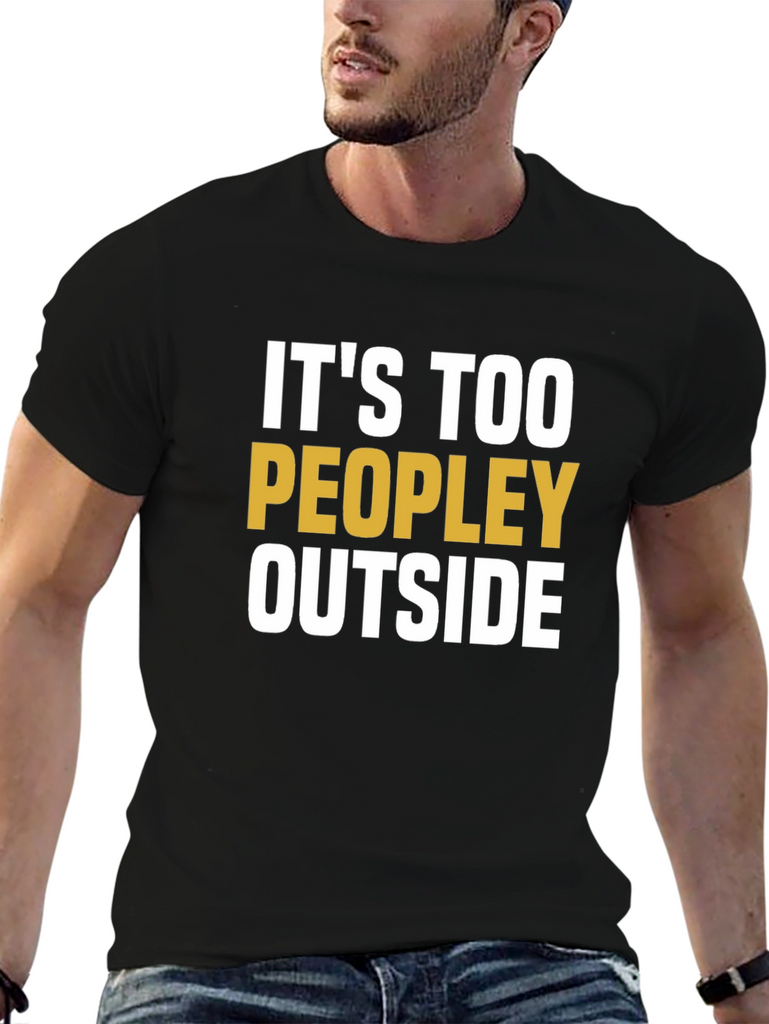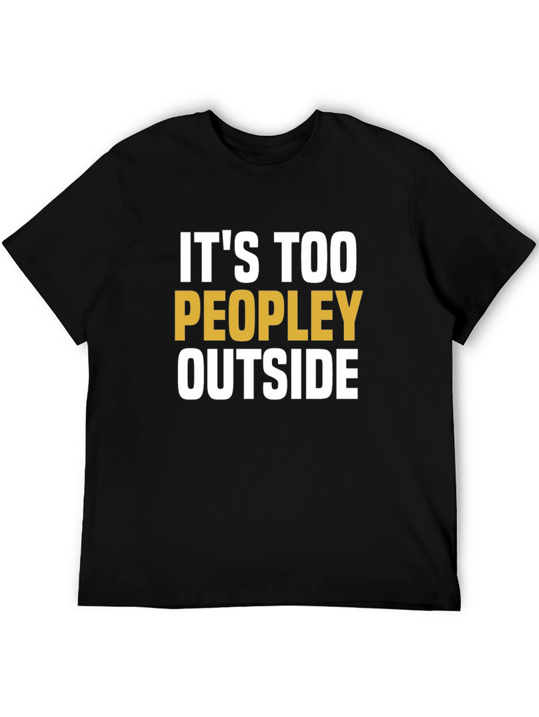 This black t-shirt features a humorous and relatable message: "It's Too Peopley Outside." The words are printed in a combination of white and golden yellow, making the statement pop against the dark background. The shirt has a classic fit with short sleeves, suitable for casual wear. Made from a comfortable-looking fabric, this tee is perfect for introverts, anyone who prefers their own company, or just those days when you want to avoid the crowds. Express your feelings with this statement tee!