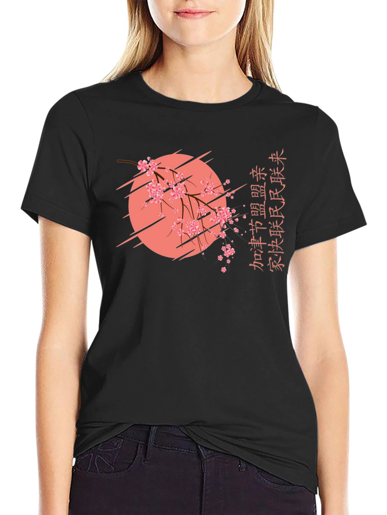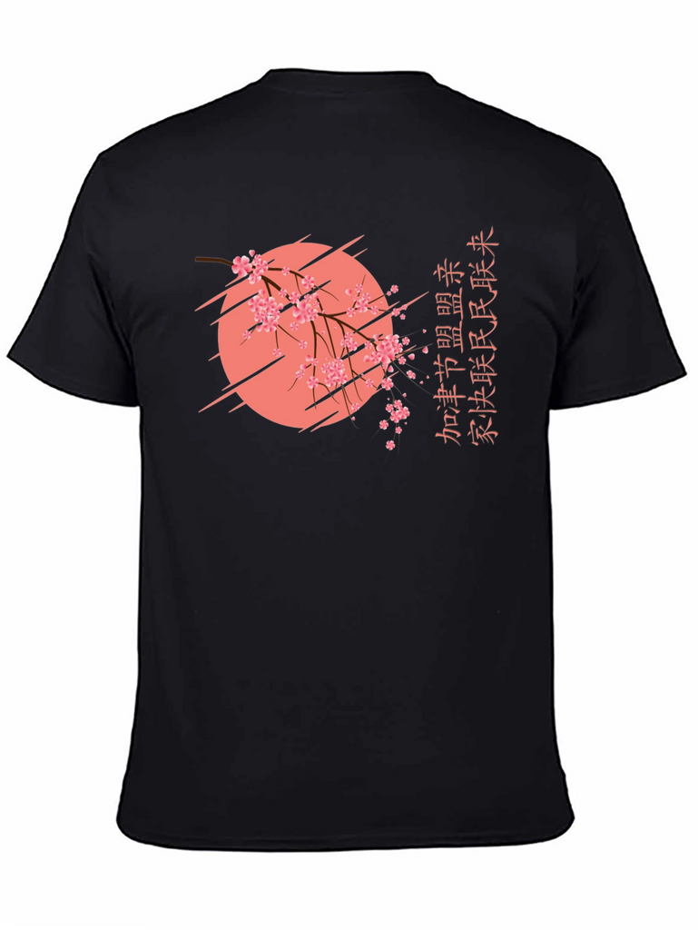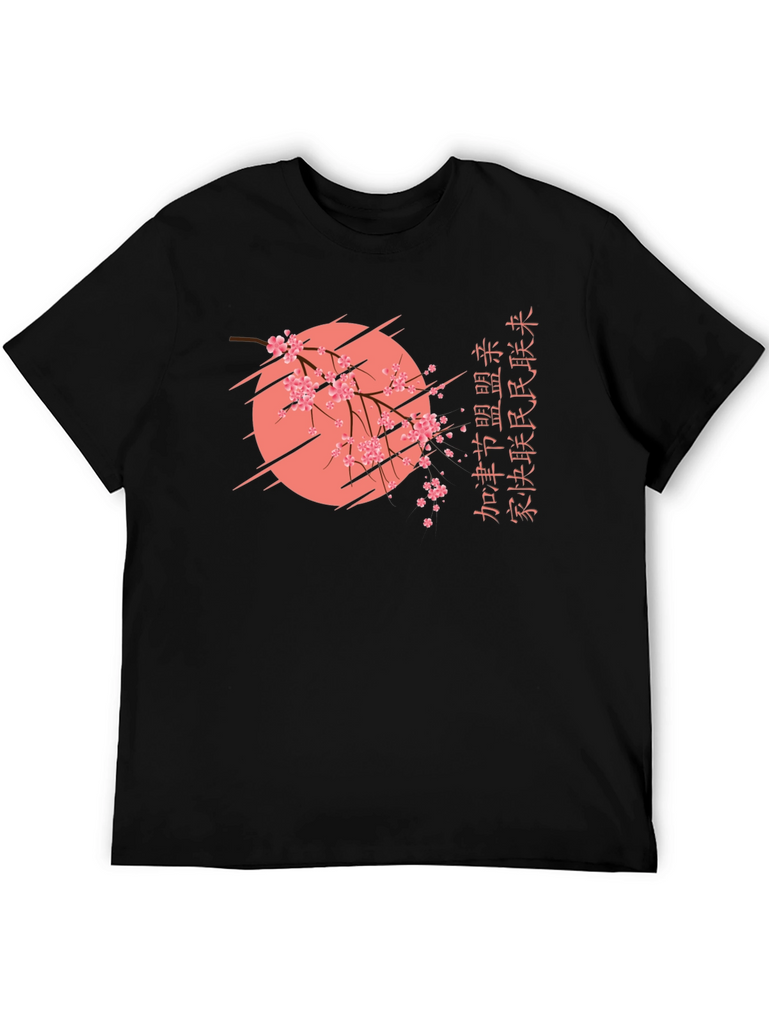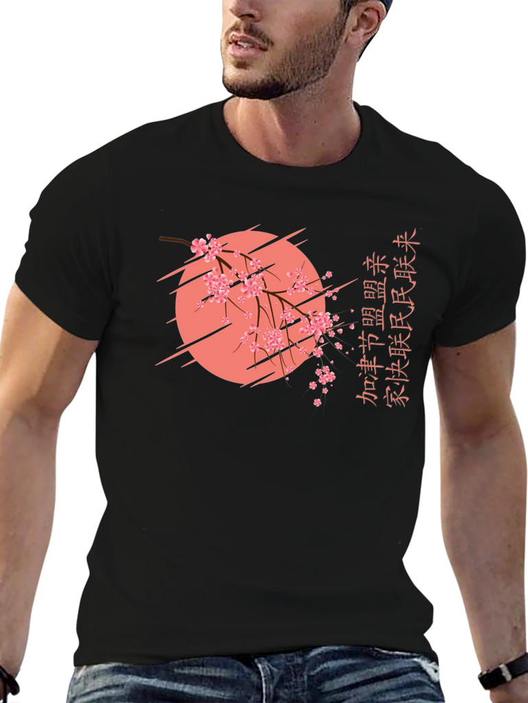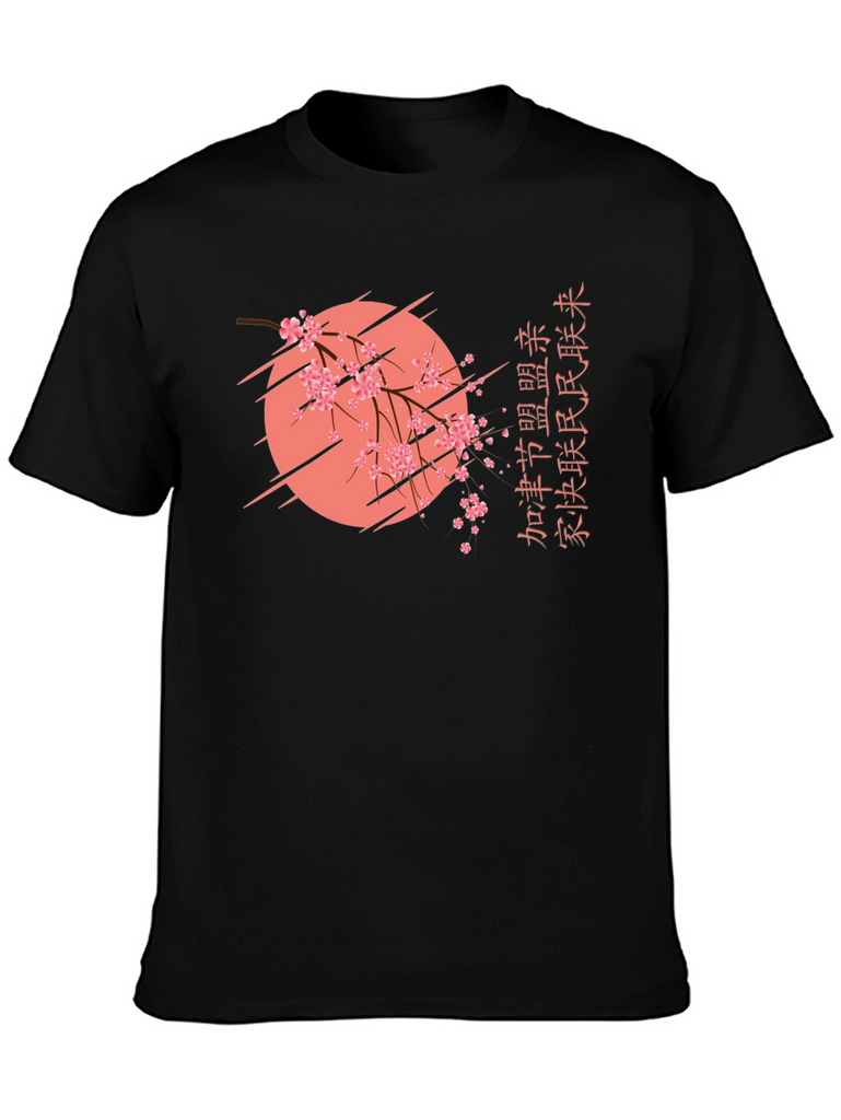 Embrace Eastern-inspired style with this sleek black T-shirt. The design features a vibrant pink cherry blossom branch set against a geometric sun backdrop, accompanied by artistic Japanese text. This tee is perfect for those who appreciate unique graphic designs and minimalist aesthetics. Made from a soft, comfortable fabric, it's ideal for everyday wear. Showcase your love for Japanese culture and stand out with this eye-catching T-shirt. Perfect for casual outings, cultural events, or simply expressing your individuality.