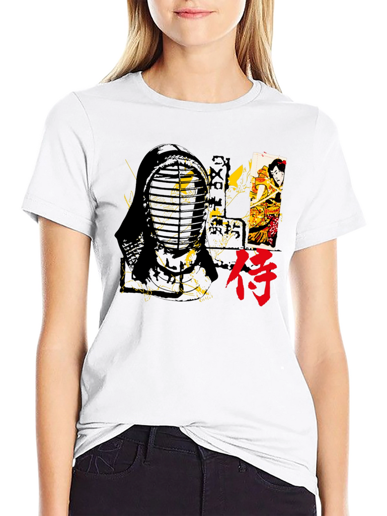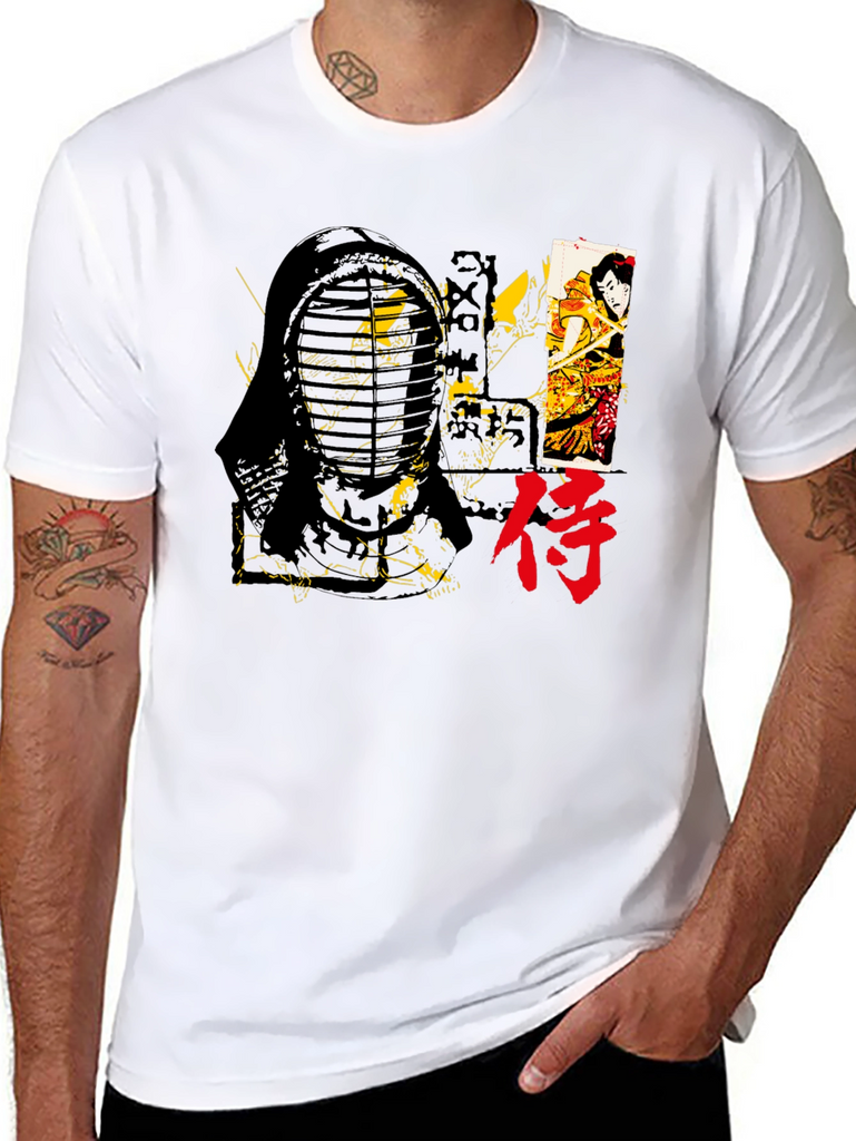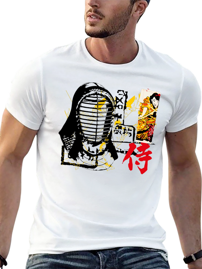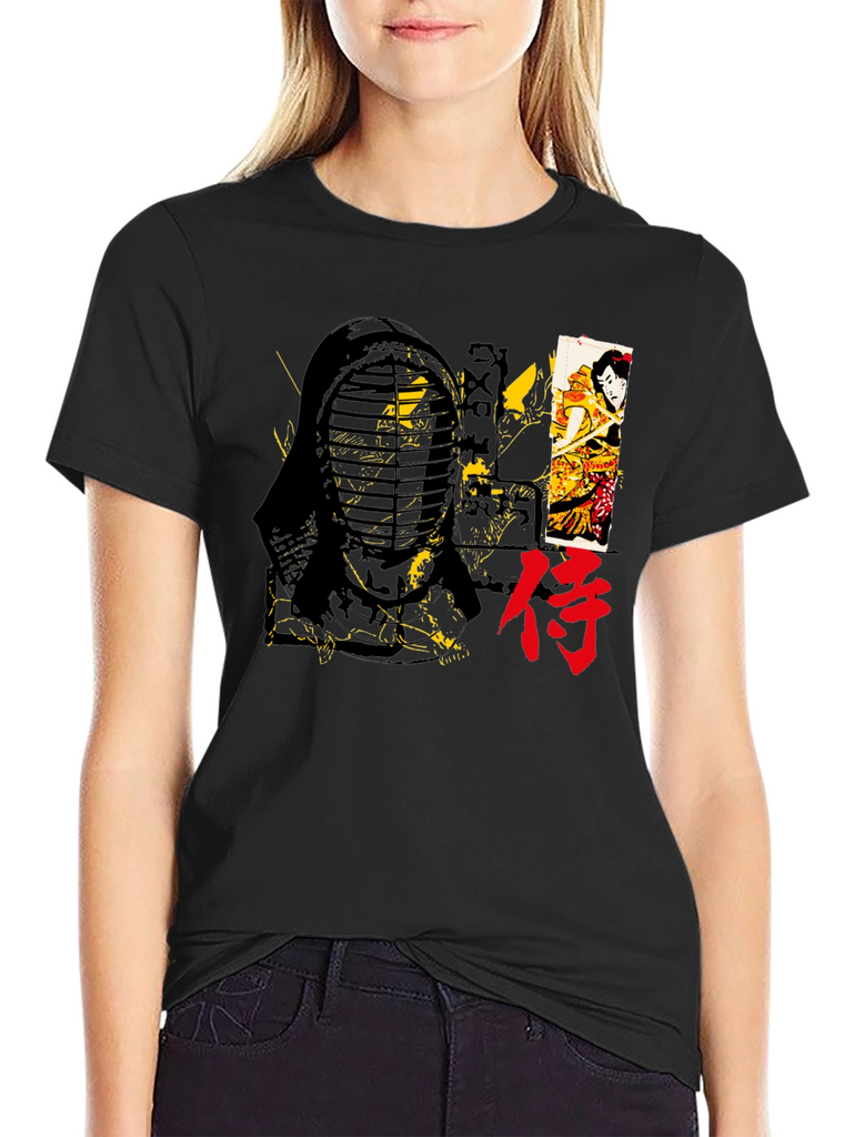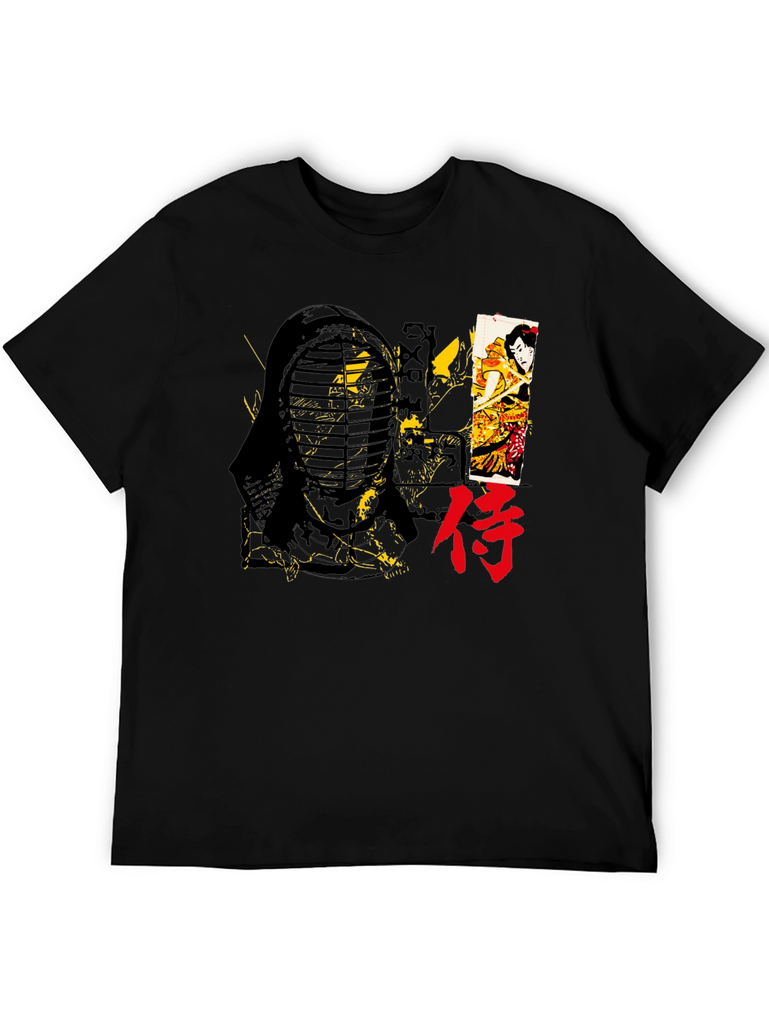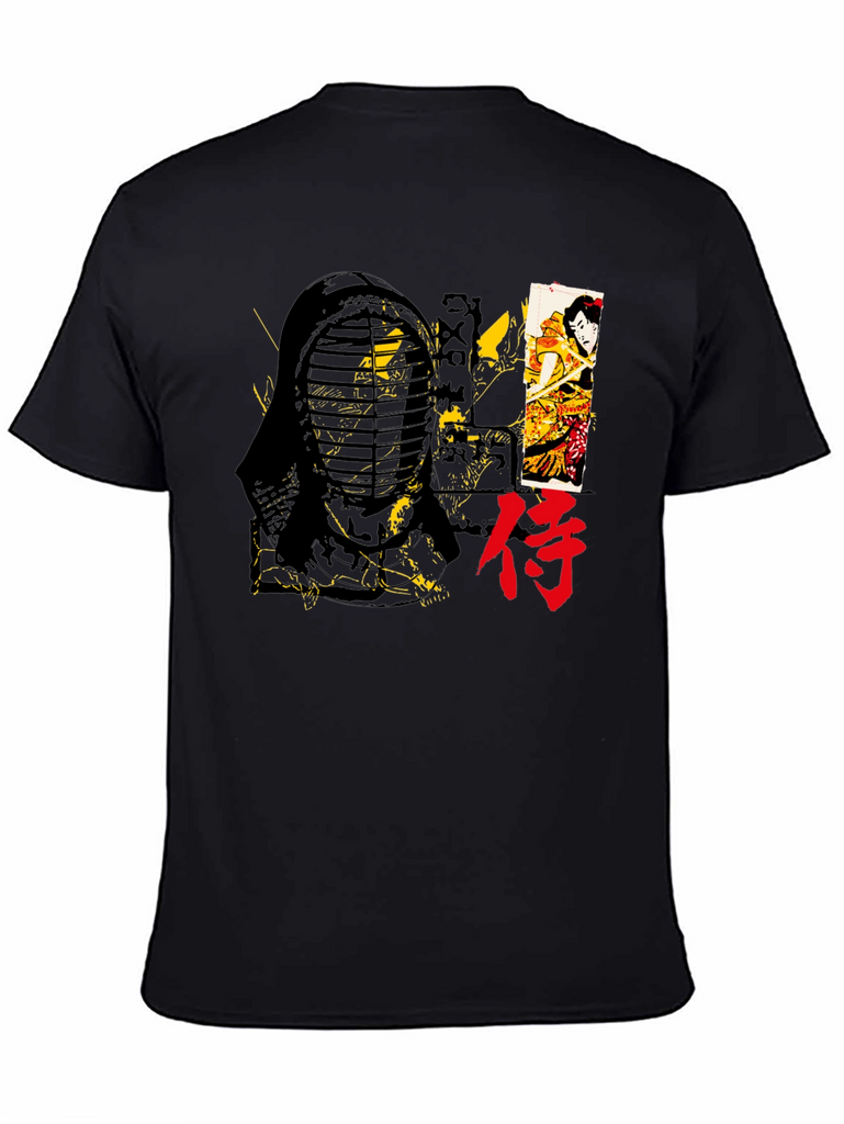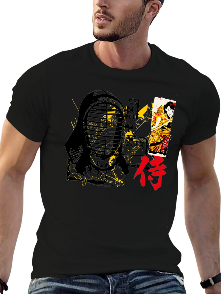 Showcase your love for Japanese culture with this unique graphic t-shirt. The design features a stylized illustration of a Kendo warrior, elements of traditional Japanese art, and Kanji characters. This black t-shirt offers a comfortable fit and is perfect for casual wear. Wear it to express your passion for martial arts, Japanese heritage, or simply as a statement piece.