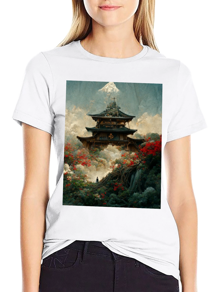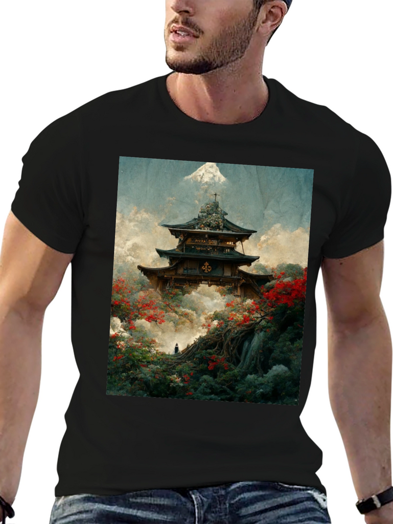 Elevate your style with this unique black t-shirt featuring a captivating print of a Japanese temple. The artwork showcases a traditional pagoda surrounded by lush greenery, vibrant red foliage, and ethereal clouds, hinting at a serene mountain backdrop. Crafted from comfortable, breathable fabric, this shirt is perfect for everyday wear, casual outings, or making a statement at your next social gathering. The detailed and artful print adds a touch of mystique and cultural appreciation to your wardrobe. Stand out from the crowd with this eye-catching piece.