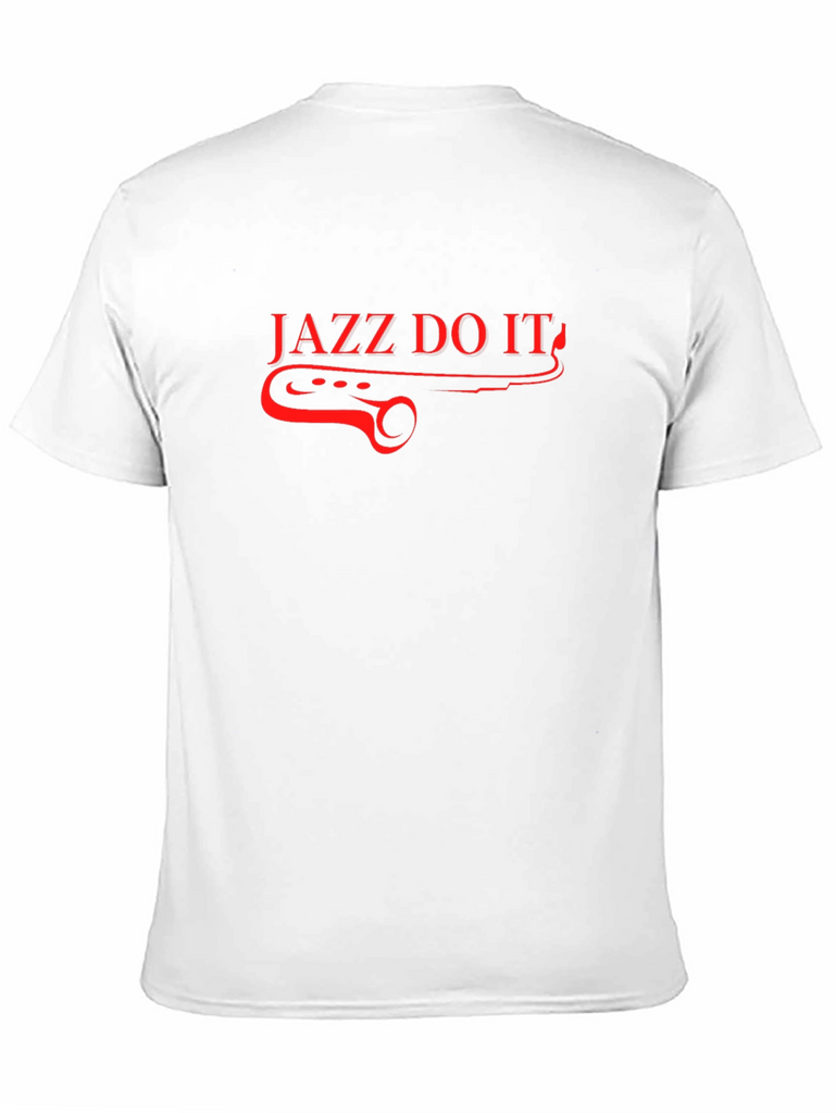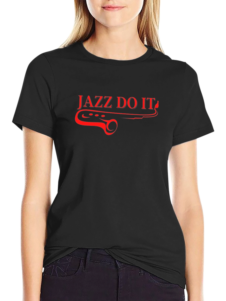 Show off your love for jazz with this stylish black t-shirt. Featuring a bold red "Jazz Do It" graphic, creatively incorporating a saxophone design, this tee is perfect for music lovers. Made from comfortable cotton, it's great for everyday wear, concerts, or casual outings. This unique design is sure to turn heads and spark conversations. A must-have for any jazz enthusiast's wardrobe, combining comfort and style in one cool package. Available in various sizes, get yours now and let the world know you love jazz!
