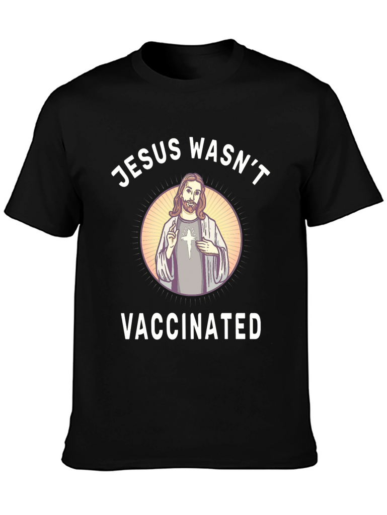 This eye-catching black t-shirt features a unique graphic design. The design showcases an illustration of Jesus surrounded by a radiant circle, with the bold text "JESUS WASN'T VACCINATED" emblazoned above and below the image. Made from what appears to be a comfortable cotton blend, this tee combines style with a controversial statement. Perfect for casual wear, gatherings, or expressing a unique viewpoint, this shirt is sure to spark conversation. The tee has a classic fit with short sleeves and crew neck design.