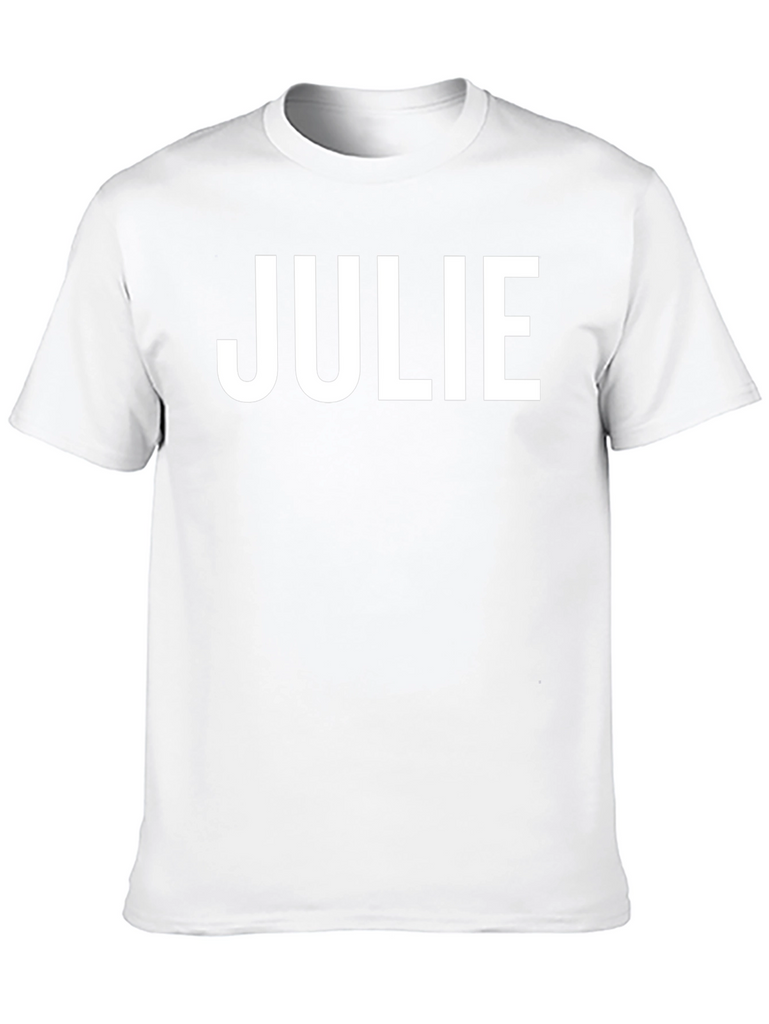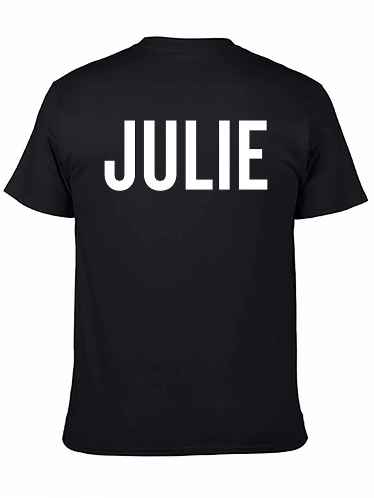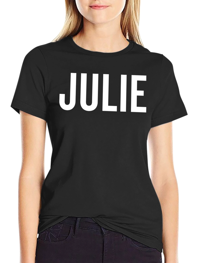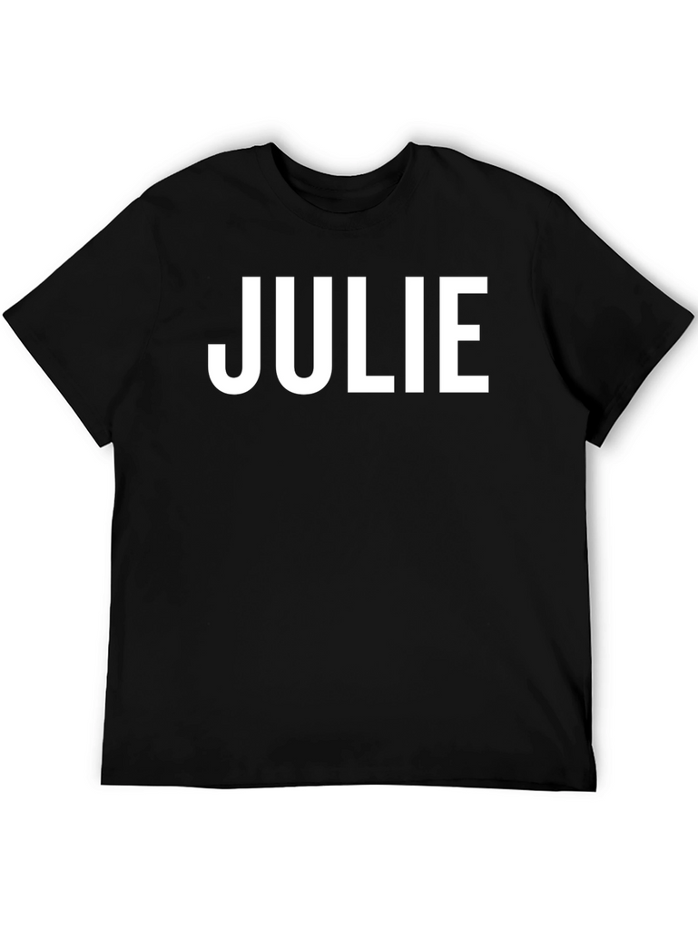 Show off your name with this stylish and personalized Julie T-shirt! Made from comfortable black cotton, this tee features the name "Julie" printed in bold white letters across the chest. The classic crew neck and short sleeve design makes it a versatile choice for everyday wear. Ideal for casual outings, running errands, or lounging at home, this T-shirt is a simple yet stylish way to express yourself. It also makes a thoughtful and unique gift for anyone named Julie. Let everyone know who you are with this custom name tee!
