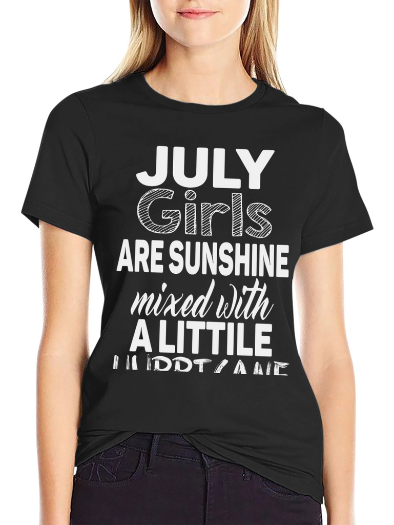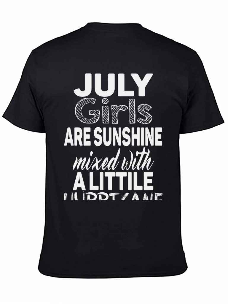 This stylish black t-shirt features a bold and playful graphic design. The text "JULY Girls ARE SUNSHINE mixed with A LITTLE HOOD" is prominently displayed in a mix of serif and script fonts. The word "Girls" has a unique sketched fill, adding a touch of whimsy. Made from a comfortable-looking fabric, this t-shirt is ideal for casual wear, whether you're out with friends or relaxing at home. Show off your personality and celebrate your July birthday with this fun and expressive t-shirt.