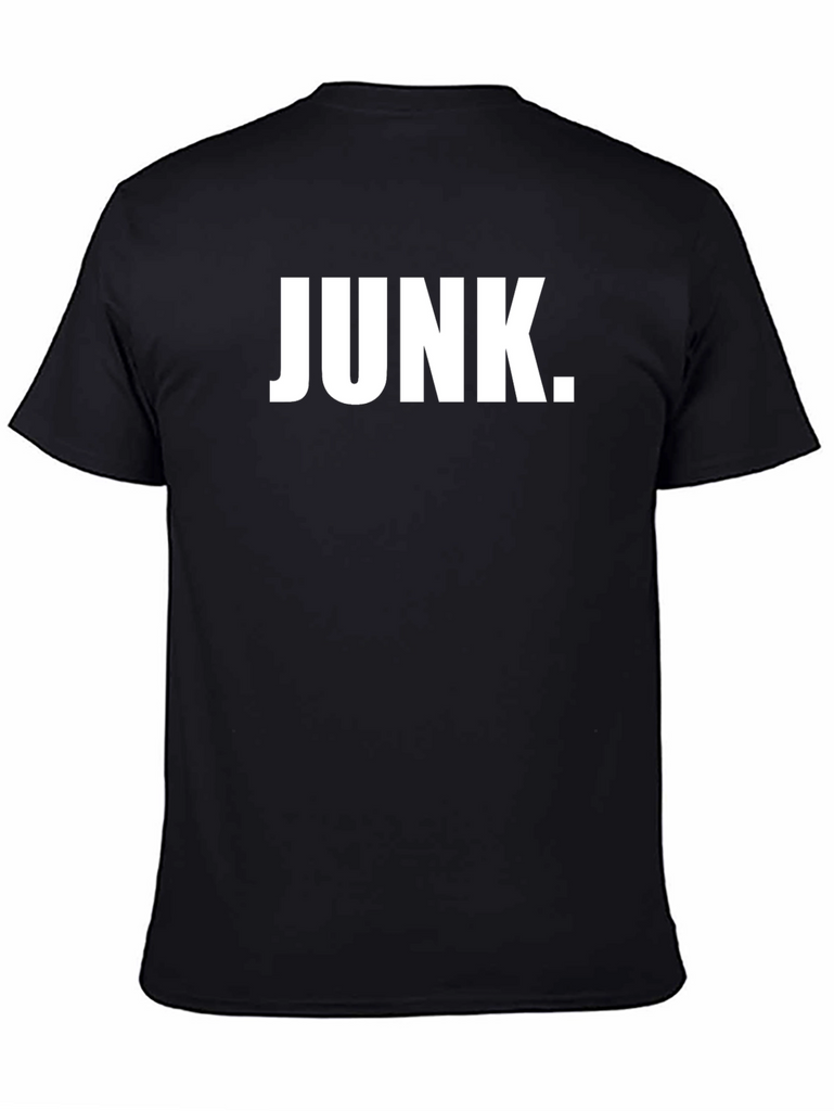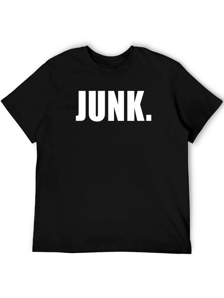 Make a bold statement with this classic black t-shirt featuring the word "JUNK." in a striking white font. Constructed from soft, breathable fabric, this tee is perfect for everyday wear. Its versatile design pairs effortlessly with jeans, shorts, or casual pants. Showcase your humor and individuality with this eye-catching piece. Whether you are lounging at home, heading to a casual hangout, or just want to express yourself, this t-shirt is the perfect addition to your wardrobe. It's not just a t-shirt; it's a conversation starter. Get yours today and let your style speak volumes!